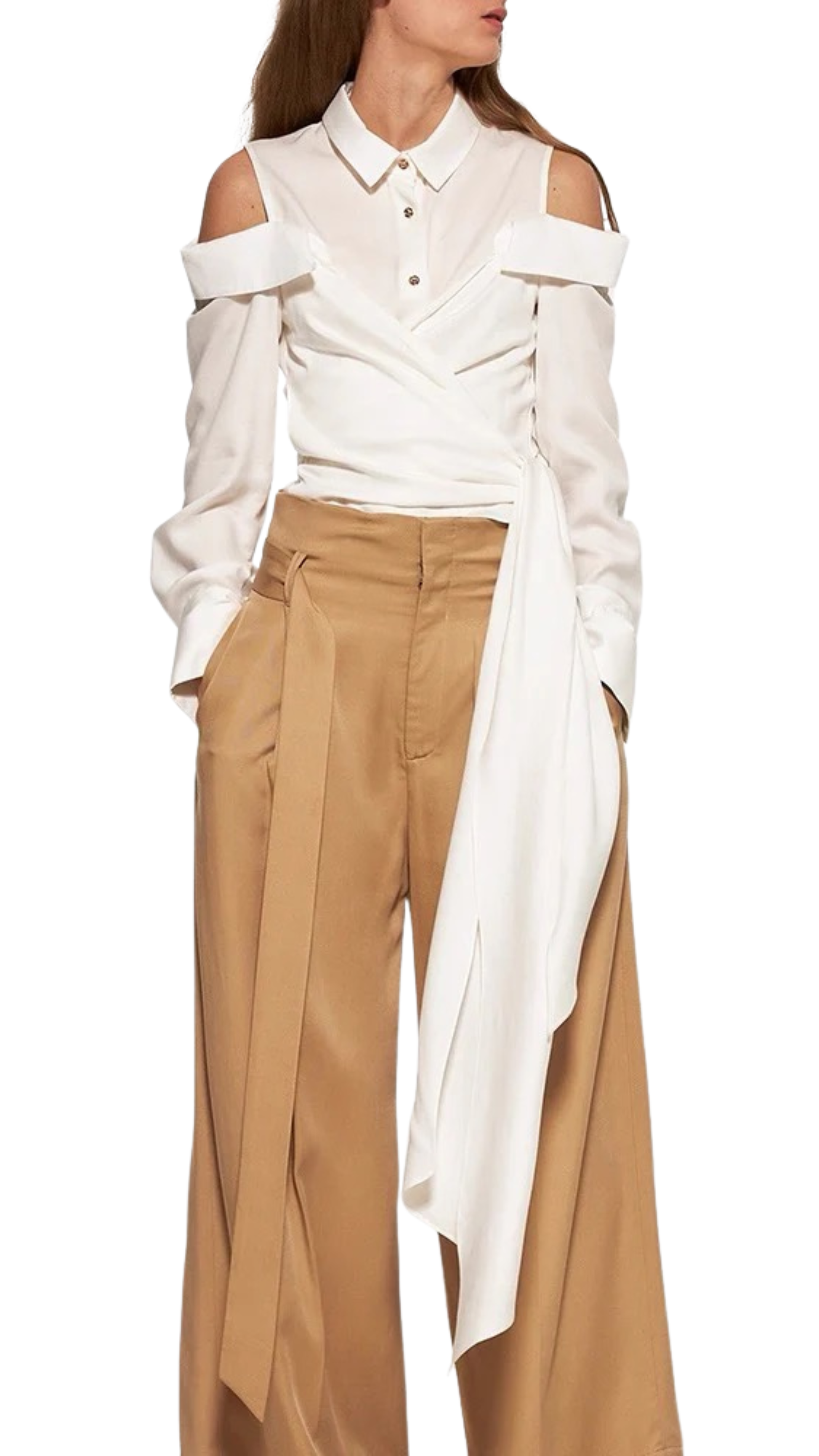 Chic and sculptural, this white shirt revisits classic codes with striking modernity. Made from soft cotton with impeccable hold, it stands out with its bare shoulders and large draped bow that elegantly highlights the waist.