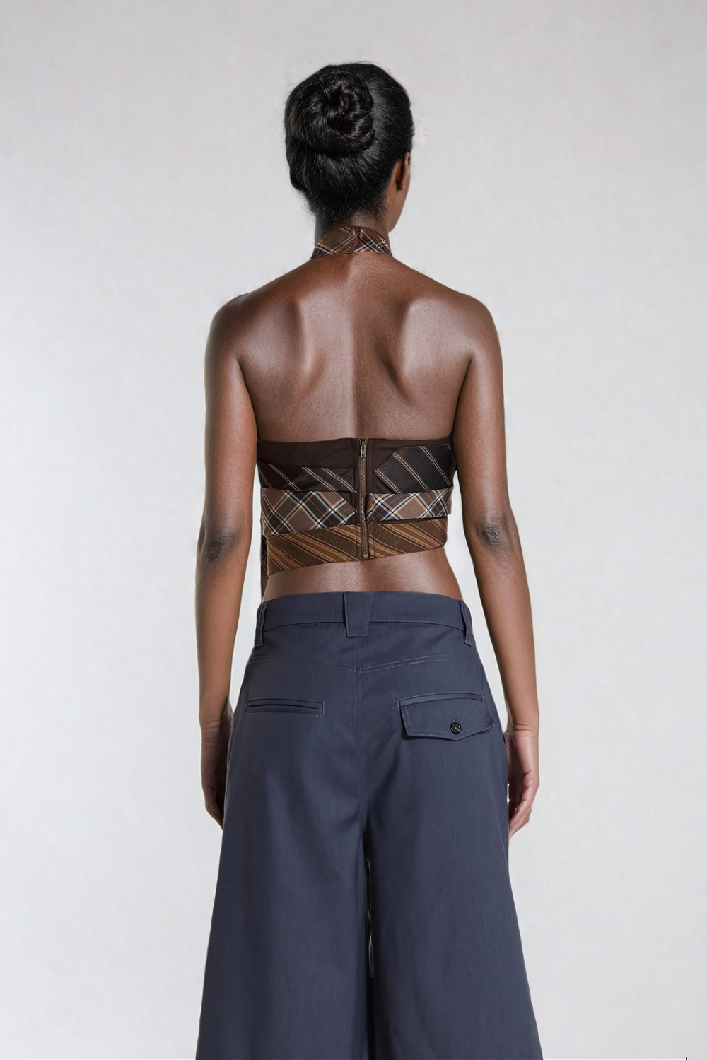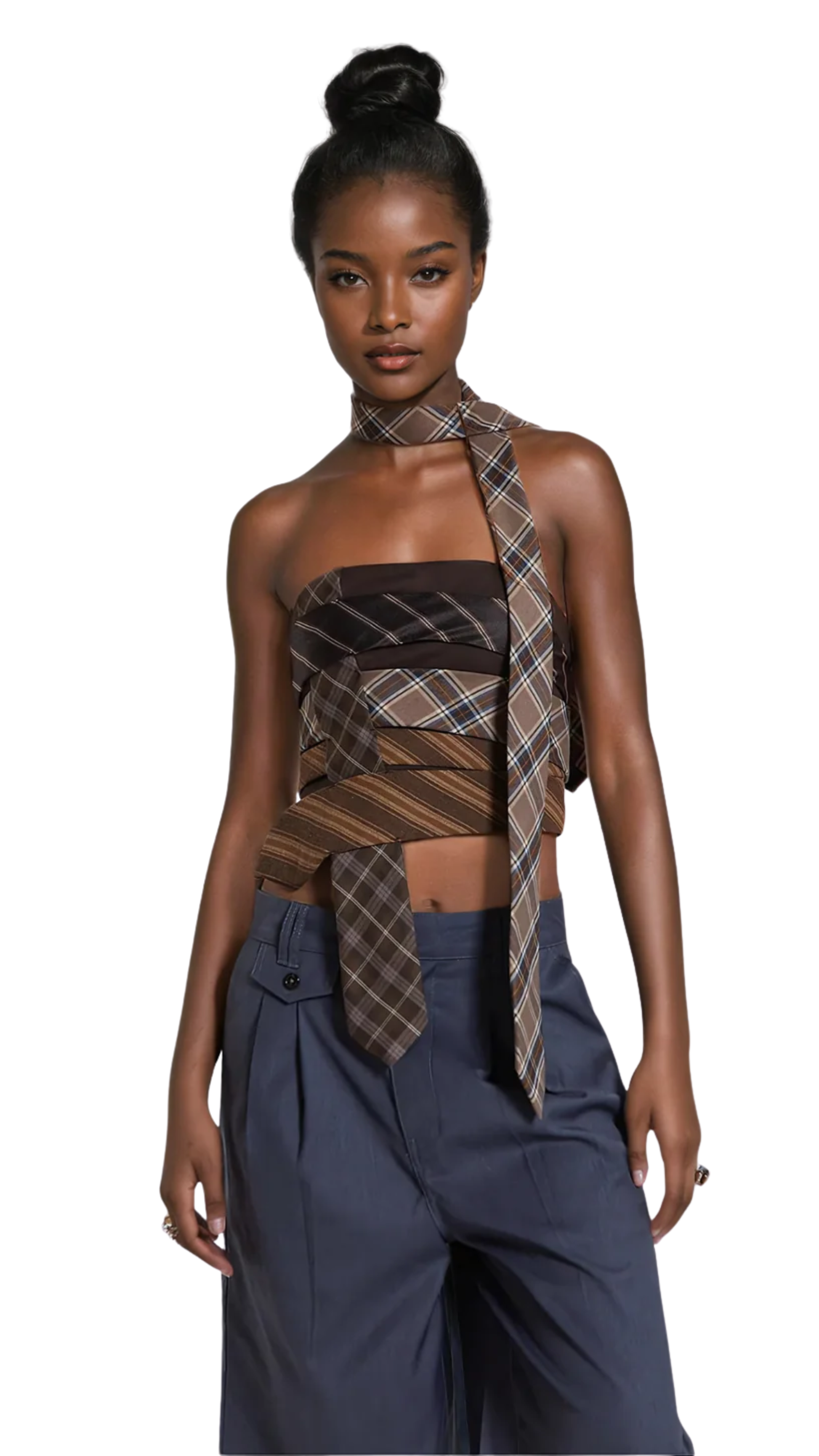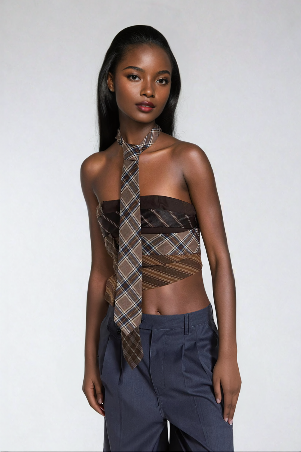 This wrap around tie top features bold mixed tartan print, a zip back closure, and an asymmetrical hemline. Additionally, a neck tie is included and the piece is fully lined for comfort.