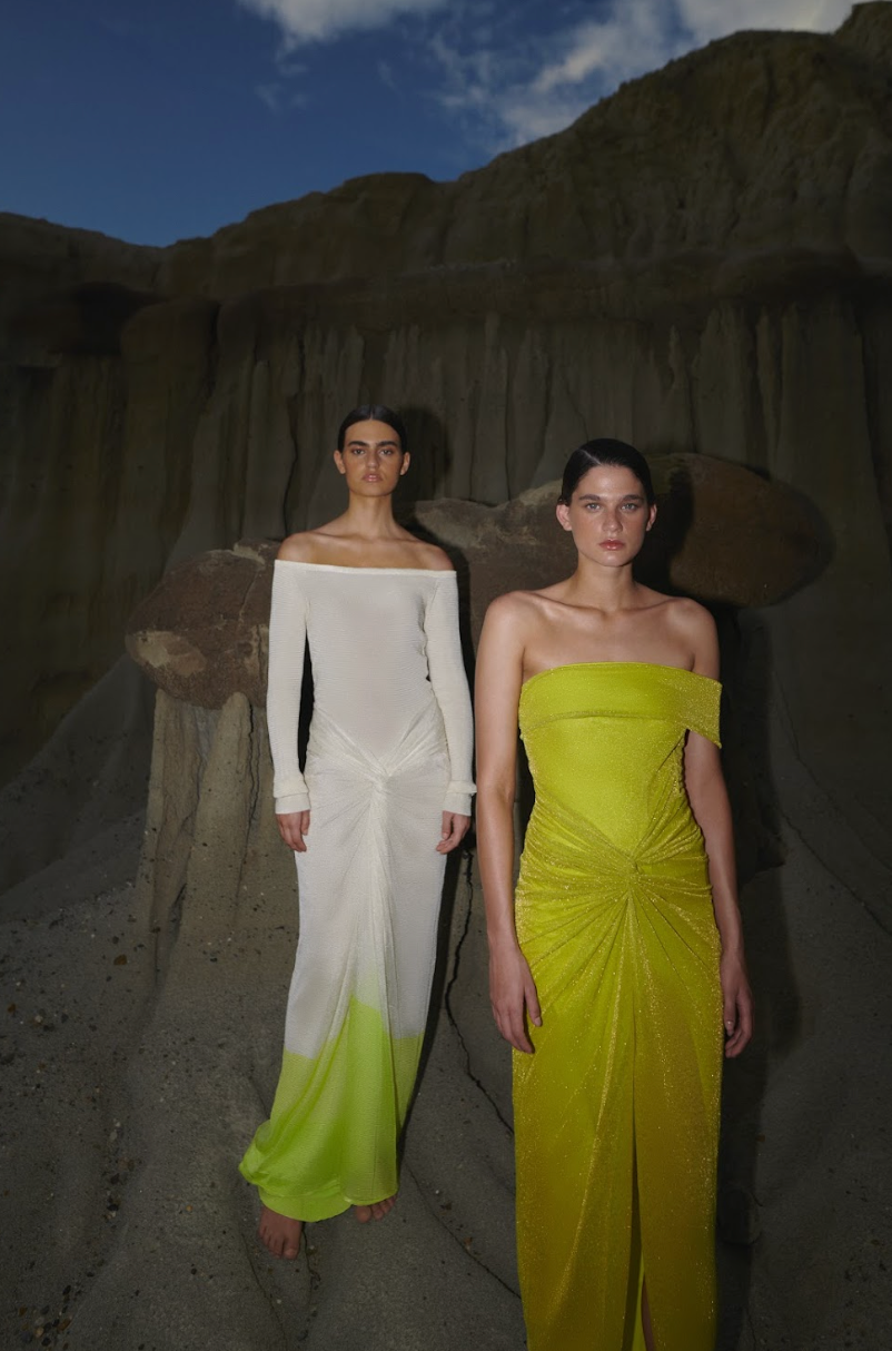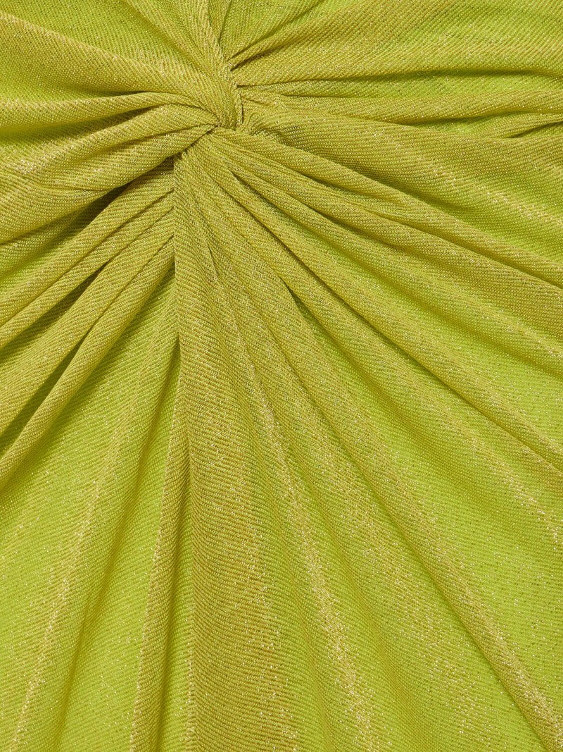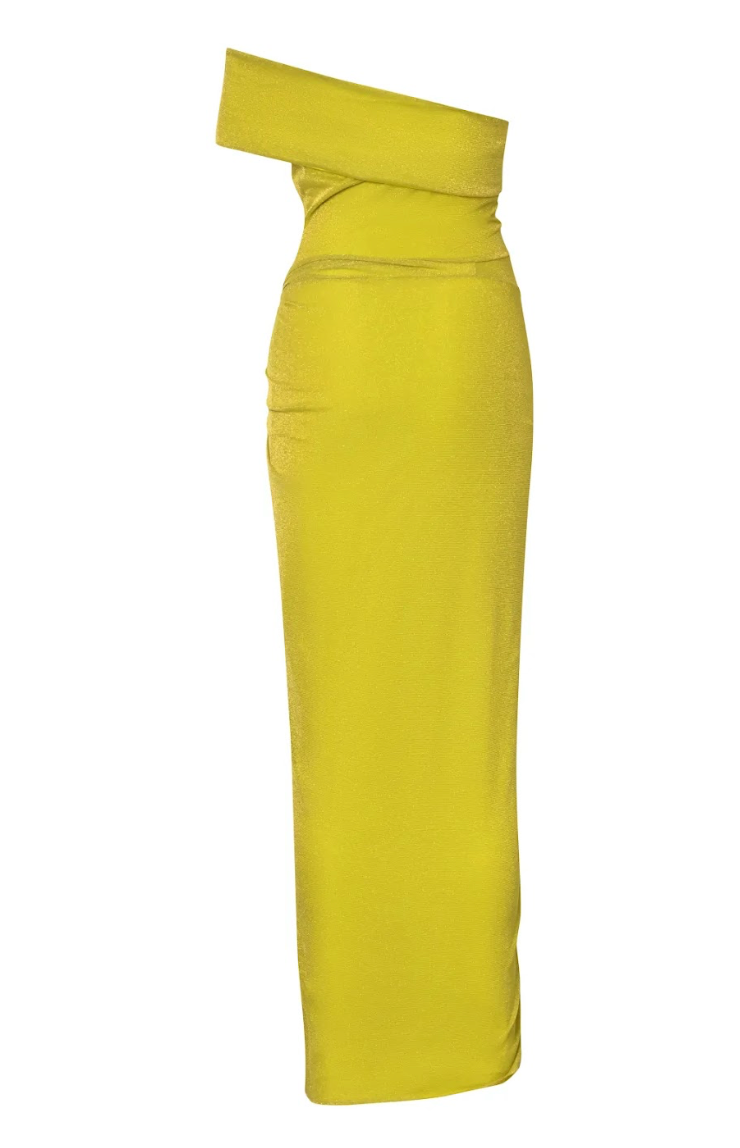 Introducing the "Aria Dress" in Lime Punch - An enchanting off-the-shoulder dress with intricate front knot detailing, sustainably crafted from glossy, figure-hugging lycra fabric. This dress is the epitome of conscious design and sustainability making it the perfect choice for summer nights attire.