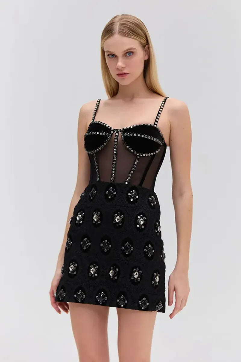 A true statement piece, this velvet mini dress is designed to captivate. Featuring a structured corset bodice with sheer mesh paneling, delicate boning, and adjustable straps for the perfect fit. The skirt is adorned with hand-embroidered brooches and crystals, adding a touch of glamour to every step. Finished with a lace-trimmed hem and invisible back zipper for a seamless silhouette.