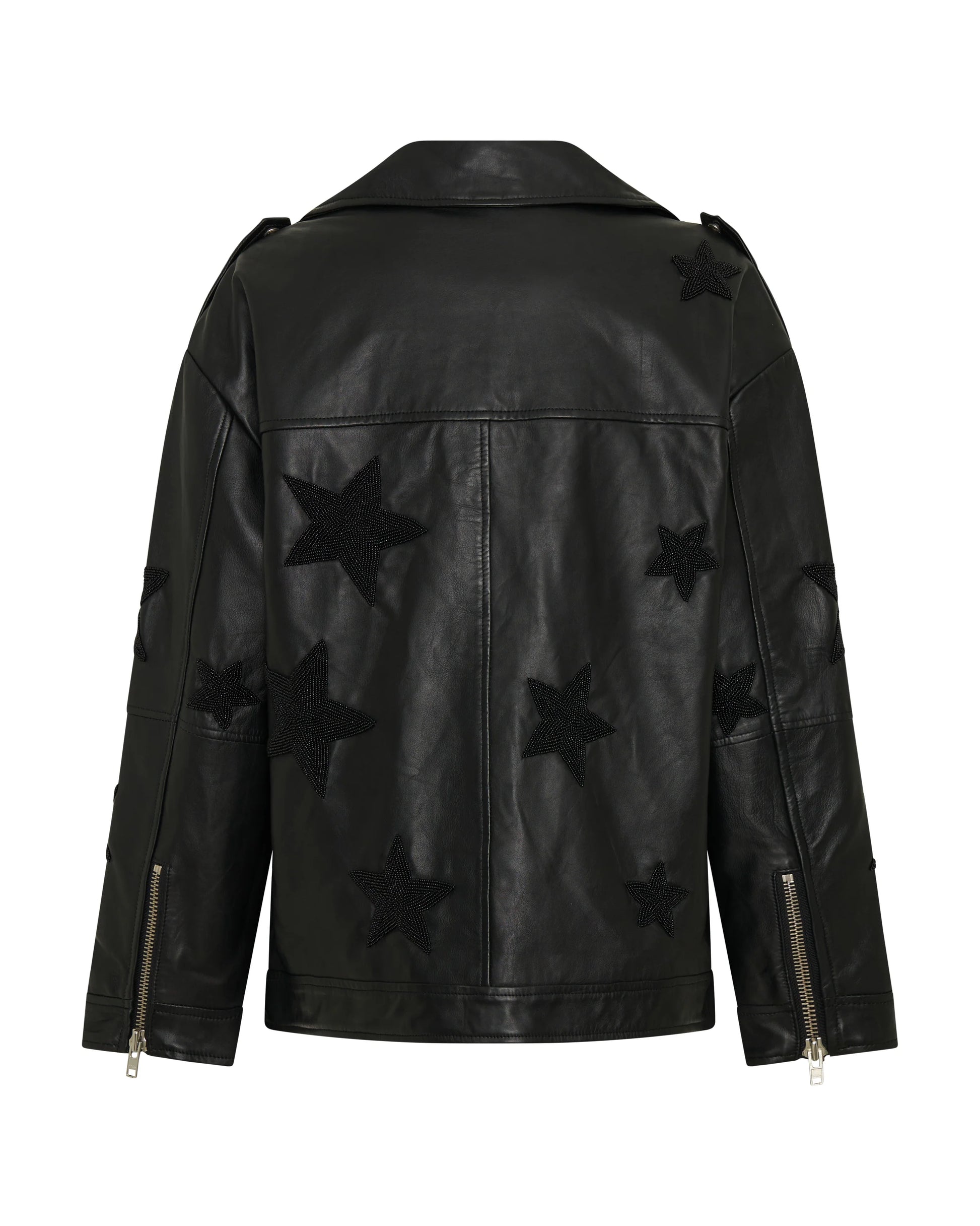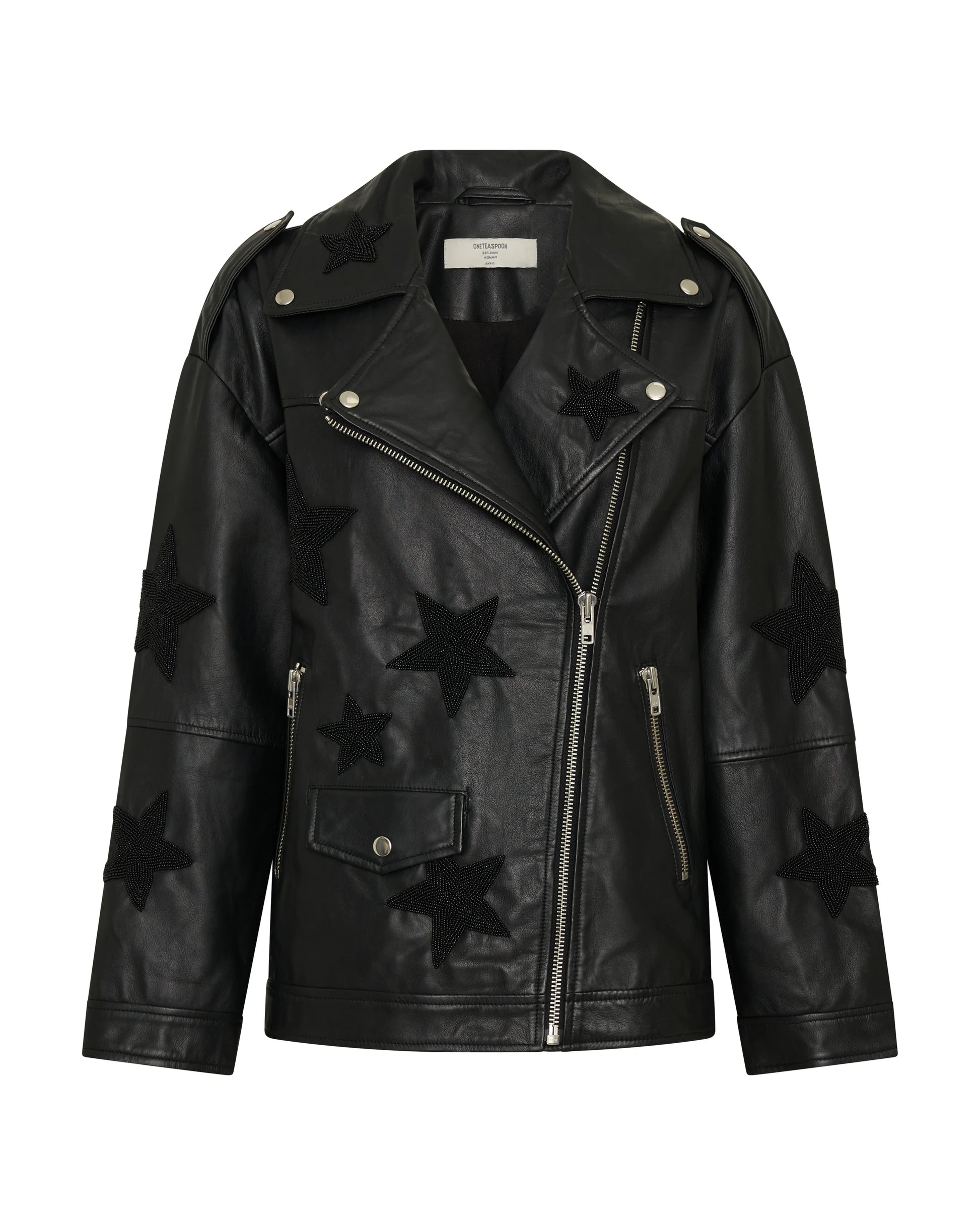 Biker Boyfriend Embellished Moto Leather Jacket- Black Star