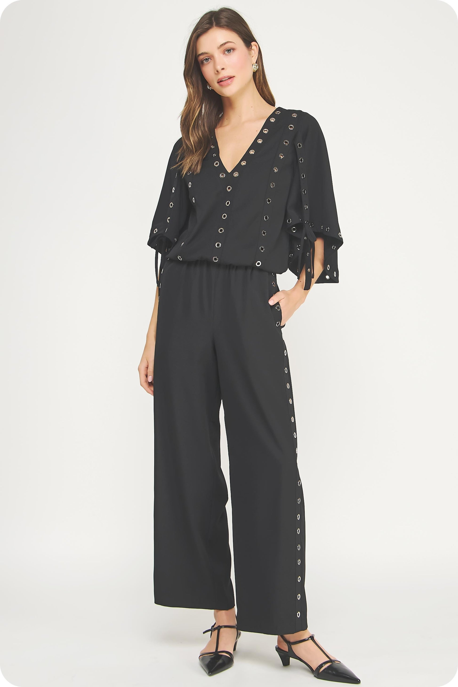 A sophisticated two-piece set featuring a relaxed blouse with delicate eyelet detailing and soft flutter sleeves, paired with high-waisted wide-leg pants. Designed for effortless elegance and comfort, this set offers a polished yet relaxed silhouette perfect for both daytime and evening wear.
