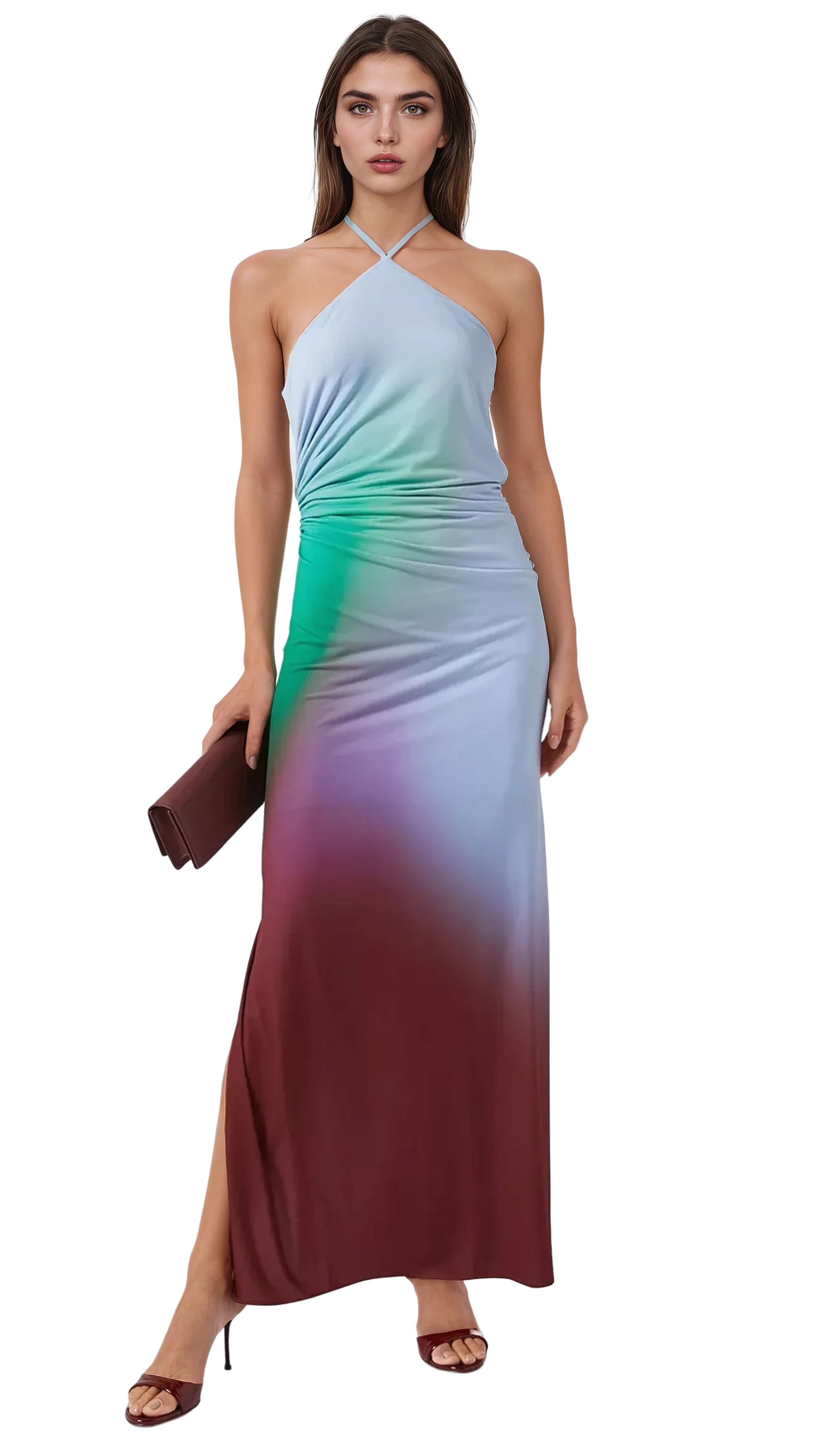 Introducing the "Blake Dress" in Wines – a stunning maxi dress with a flattering halter neck and open back. Ruched detailing and a side slit add movement and sophistication. The lined design ensures comfort, making this dress perfect for a chic, elegant look.