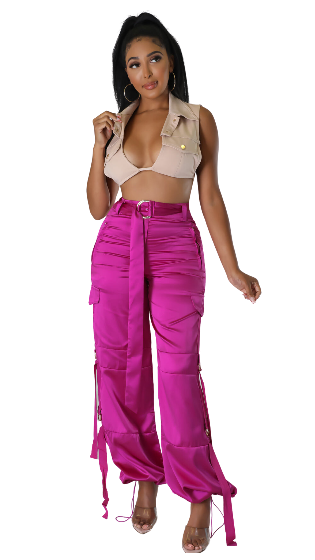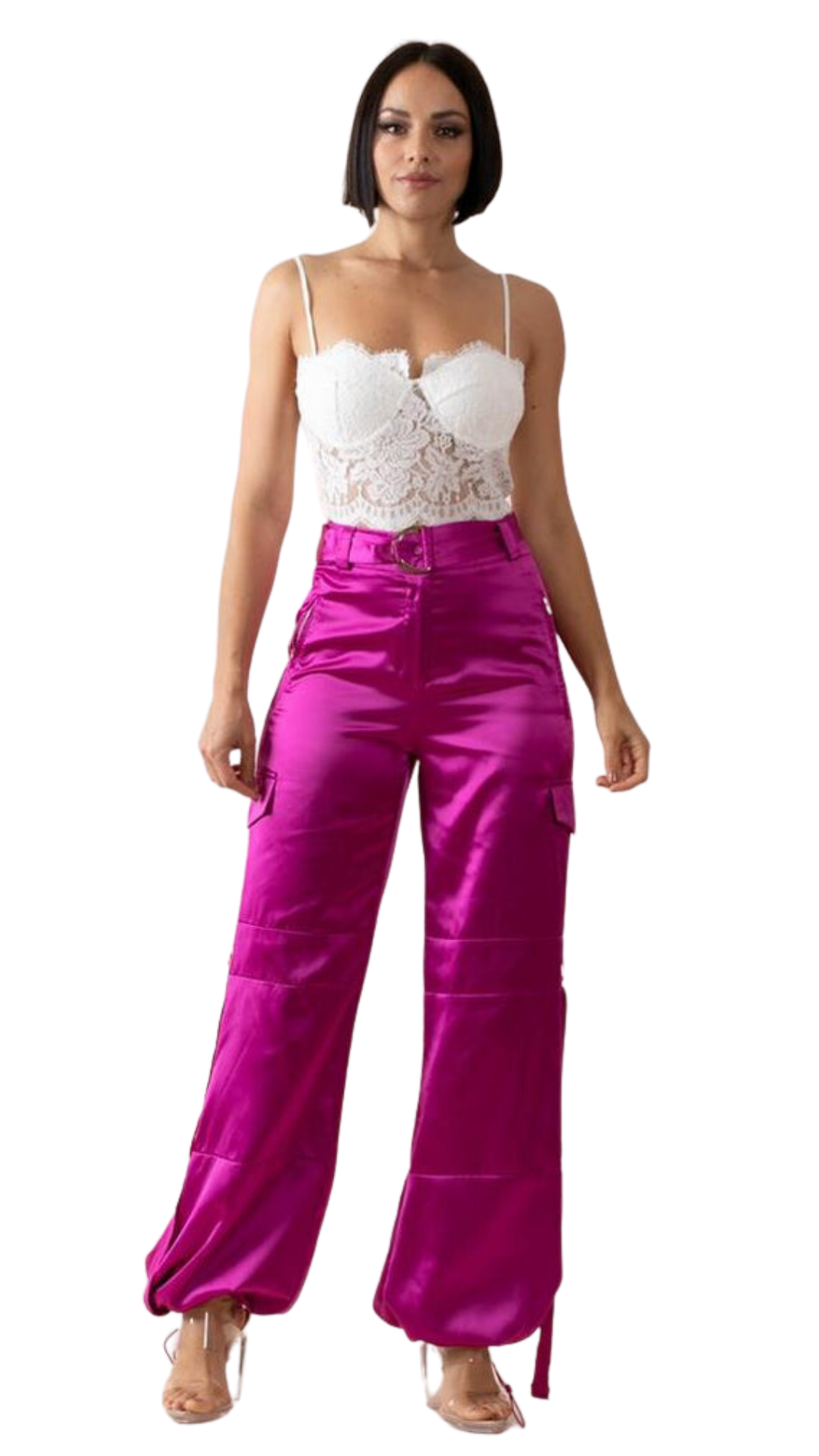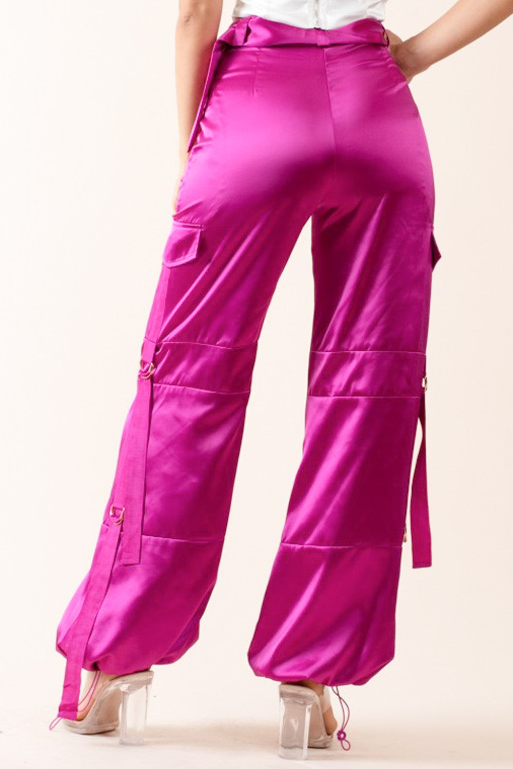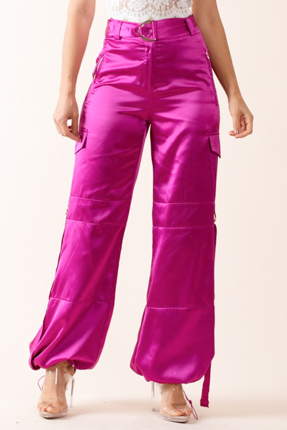 Stay comfortable and stylish with these Satin Cargo Pants, featuring a belt for a secure fit. Made of quality, wrinkle-resistant satin in magenta, they're ideal for any occasion.