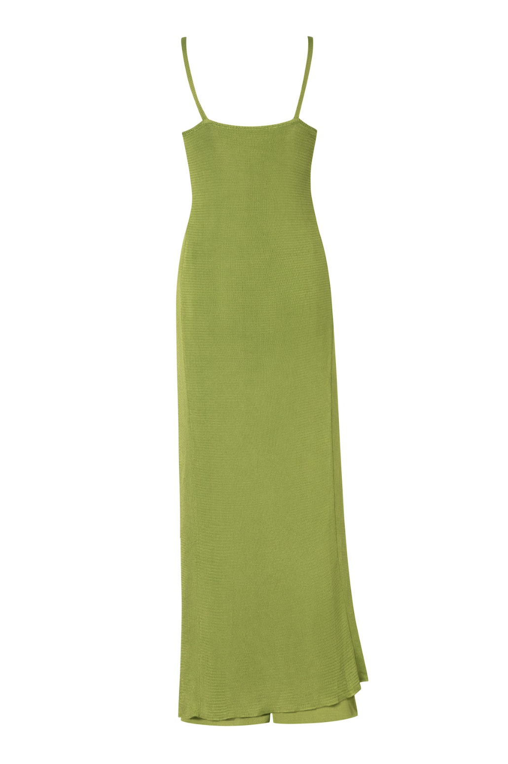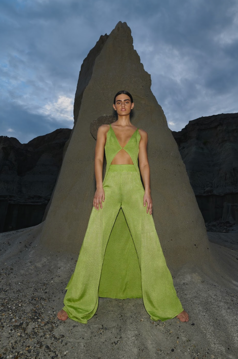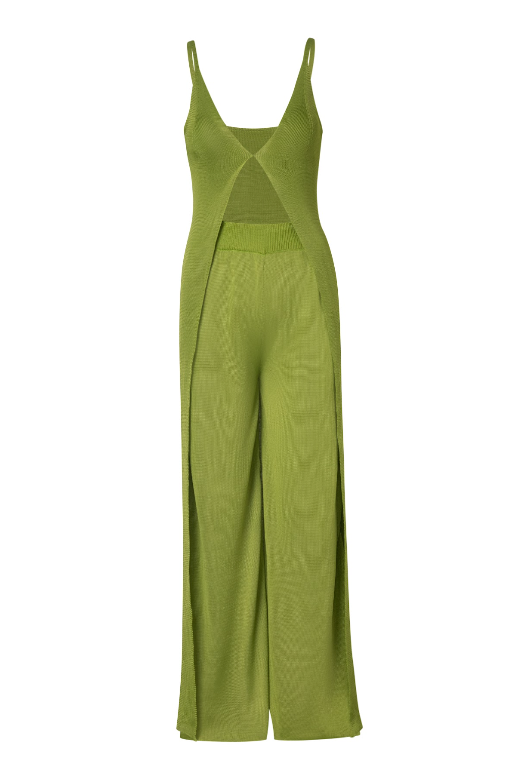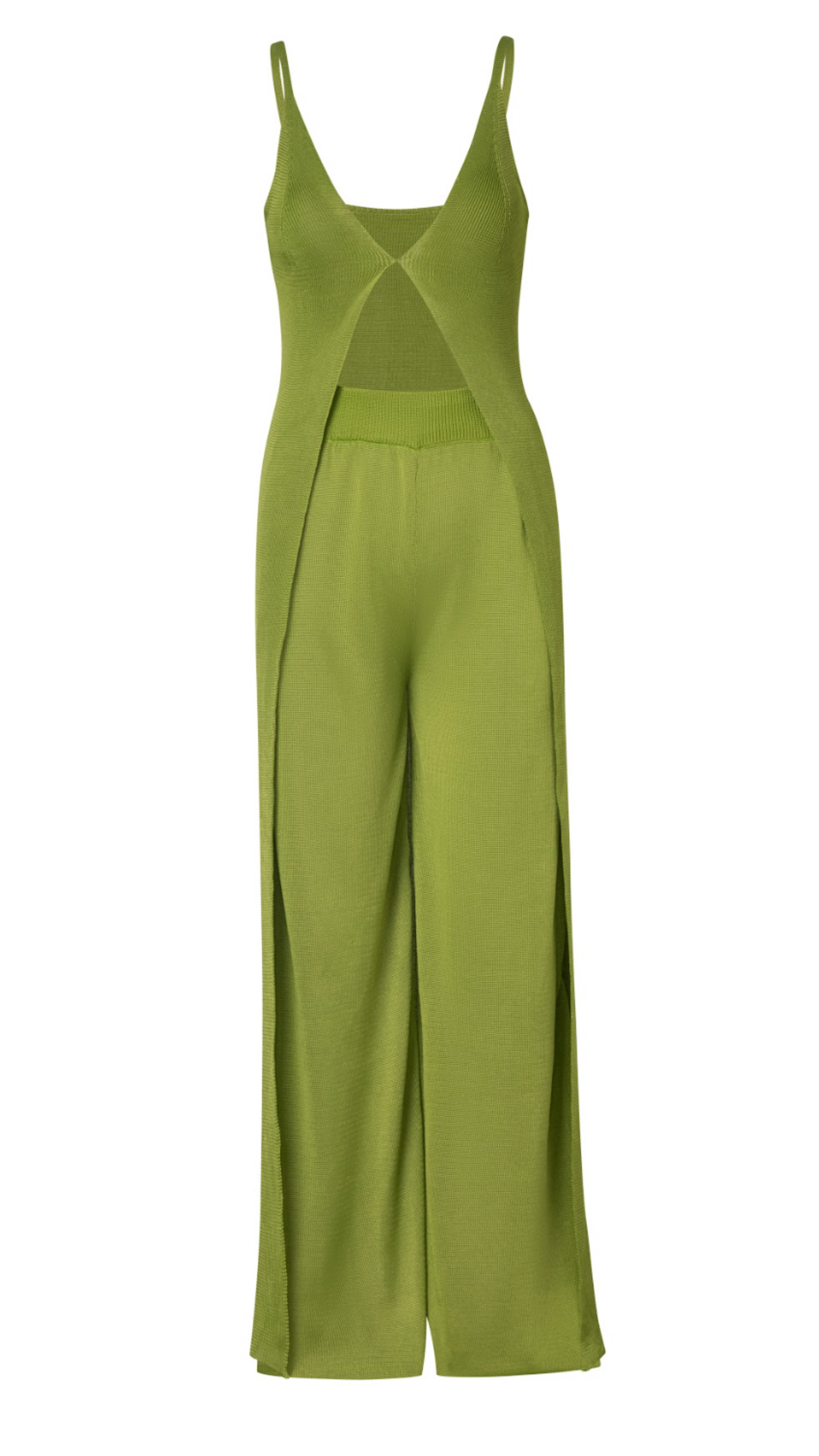 Introducing the "Clarrisa set" in Edamame - A sustainably crafted knitted piece. This long, floor-length top is designed with an attached front,These pants feature a loose, stretchy waistband, guaranteeing a relaxed and comfortable fit. creating a captivating cutout design that adds a touch of allure to the ensemble.