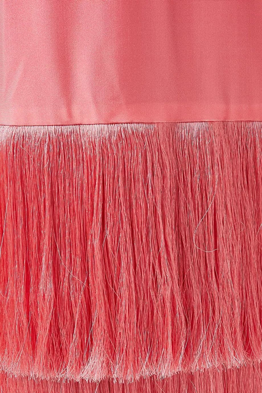 Indulge in the beauty and elegance of the "Cleo Dress" in Corales. This strapless maxi dress features stylish fringe detailing that adds movement and texture, making it a perfect choice for any special occasion. The comfortable lining and modern design will help you make a bold and sophisticated statement with ease!