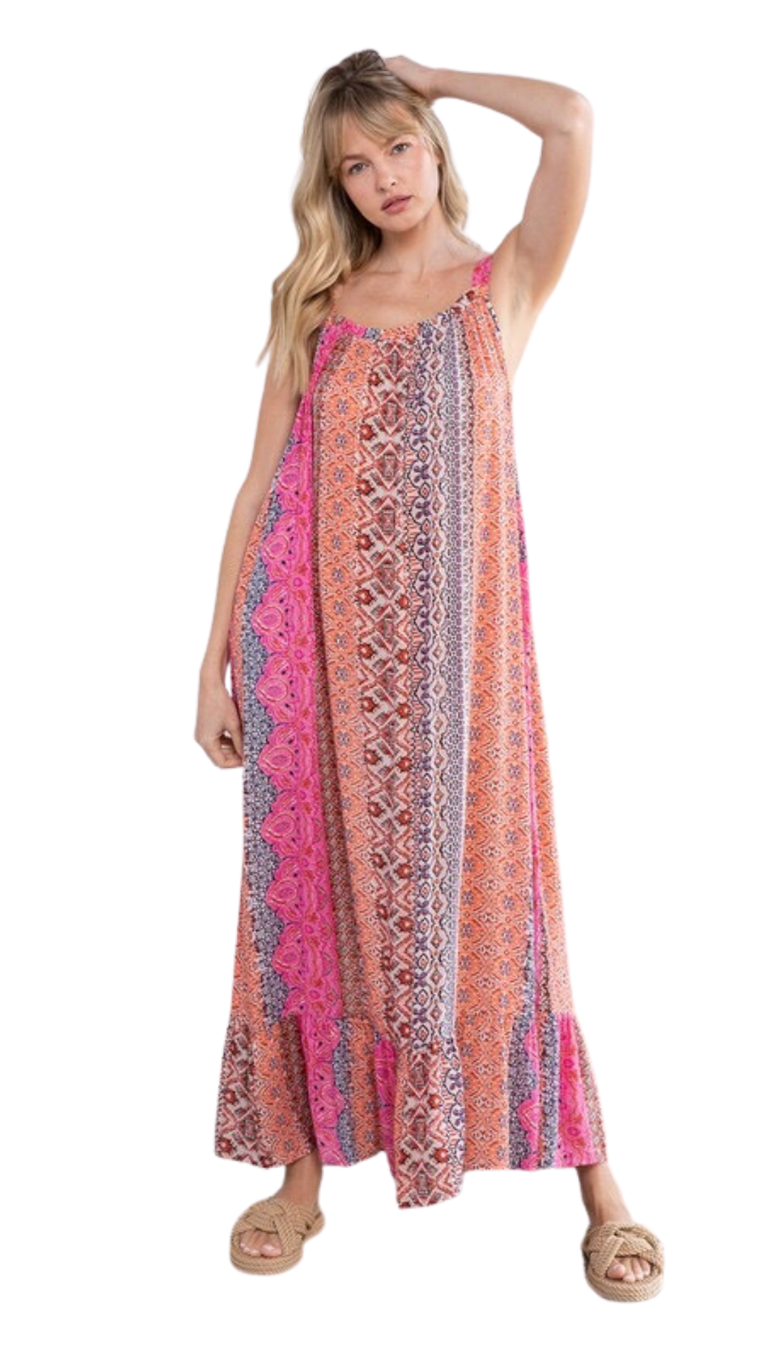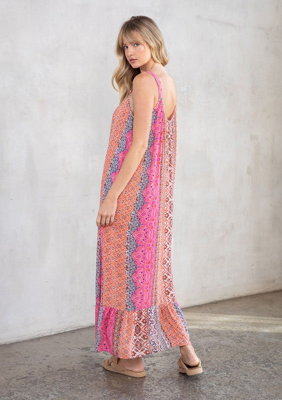 A resort-ready maxi dress worthy of a vacation! Designed in an ultra-bohemian mixed print, this flowy sleeveless maxi dress features light-catching gold metallic thread details and a flirty ruffle-trimmed round neckline. Throw it on over your swimsuit at the beach, or dress it up with sandals for balmy late nights.