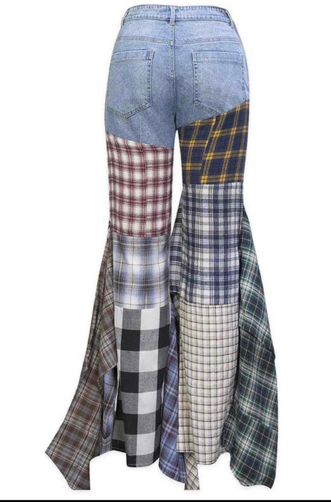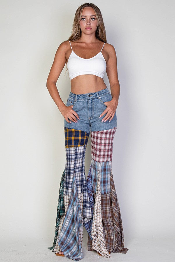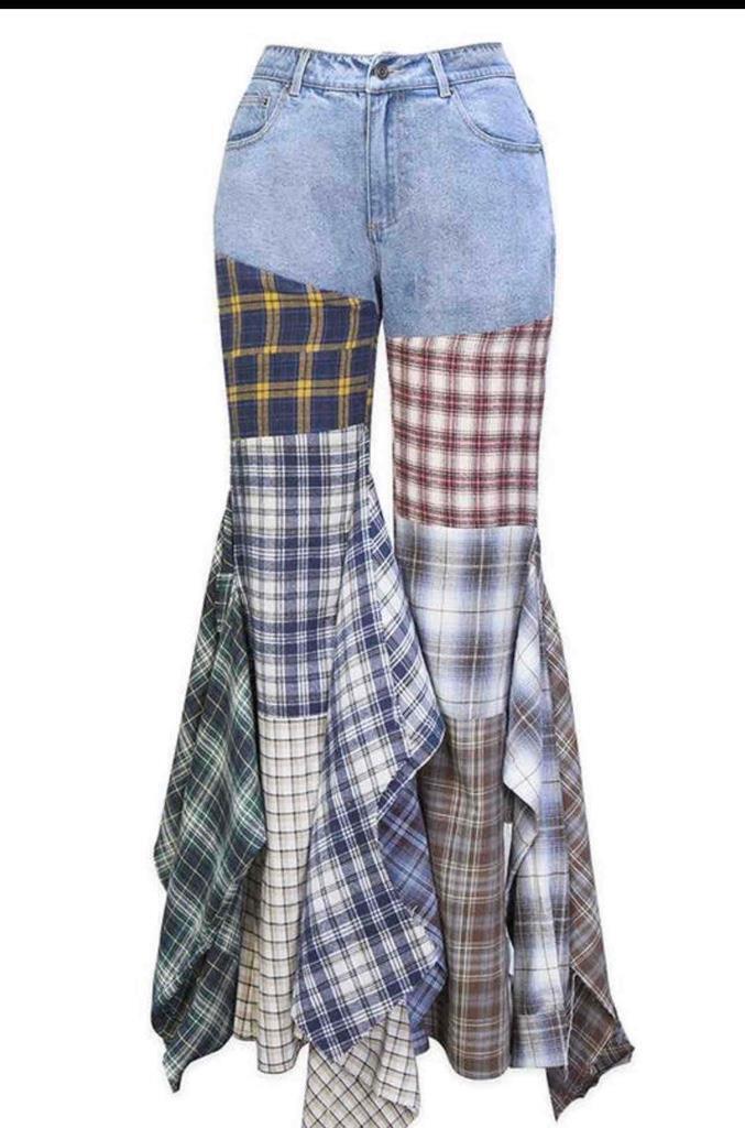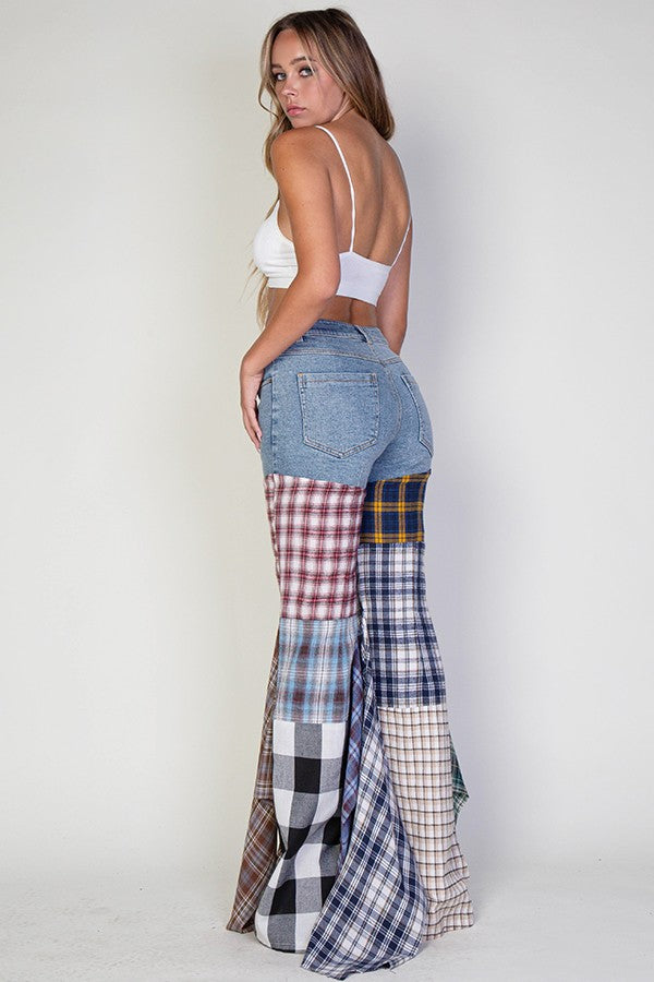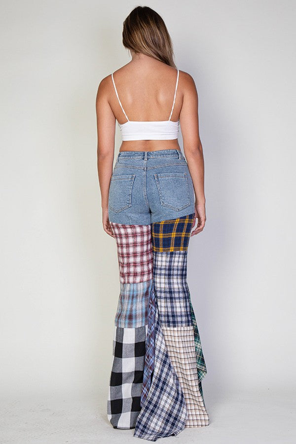 Plaid Patchwork Flared Jeans are made from a mixed fabrication and feature a washed denim fabrication top with a high rise waist, working belt loops, and a five-pocket design. Complete with color block plaid flannel patchwork flared legs with distressed plaid flannel tissue detailing.