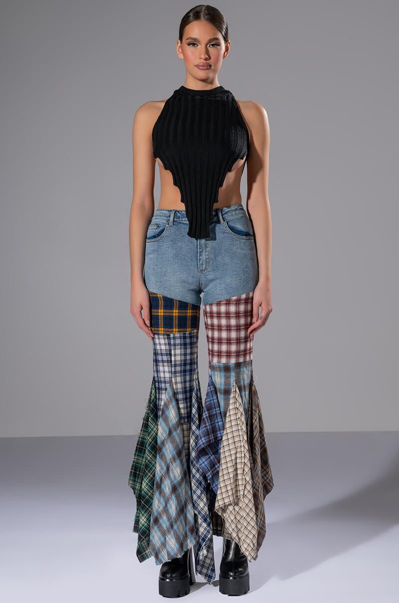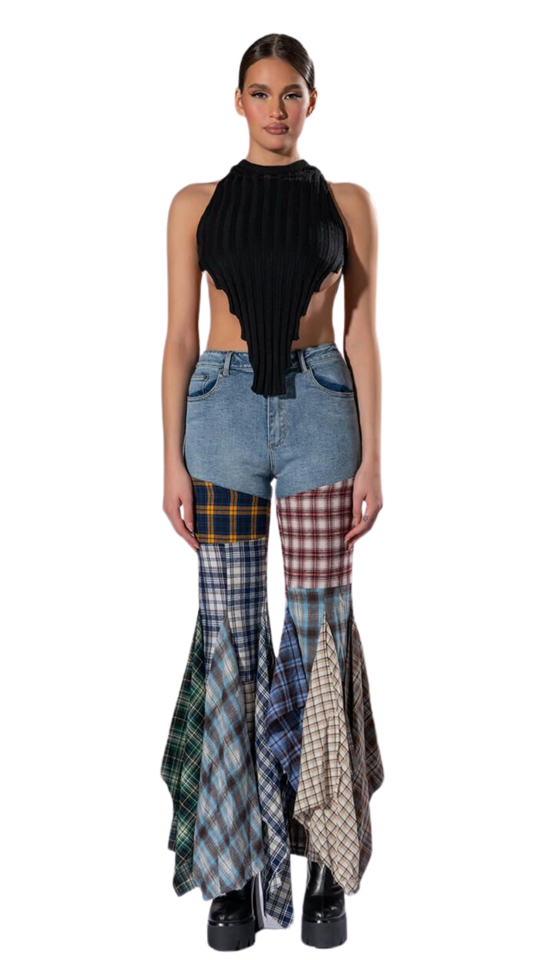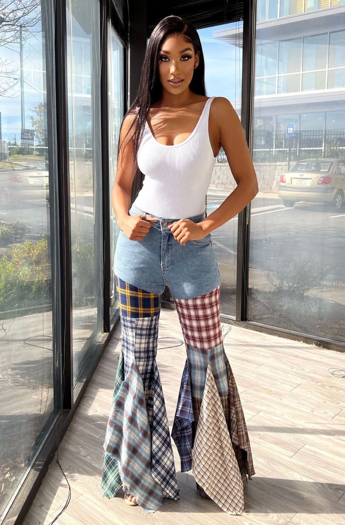 Plaid Patchwork Flared Jeans are made from a mixed fabrication and feature a washed denim fabrication top with a high rise waist, working belt loops, and a five-pocket design. Complete with color block plaid flannel patchwork flared legs with distressed plaid flannel tissue detailing.