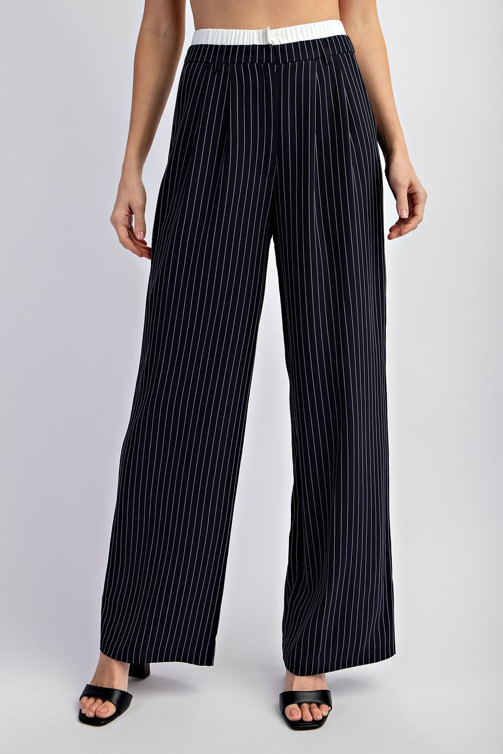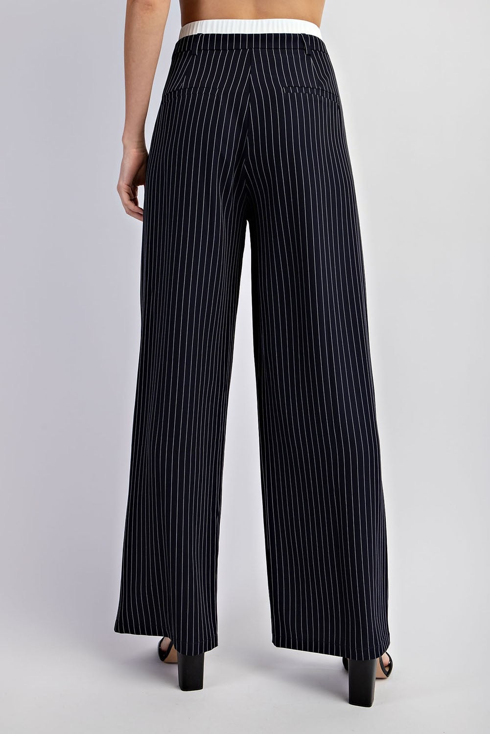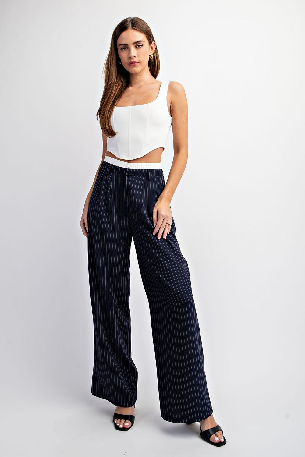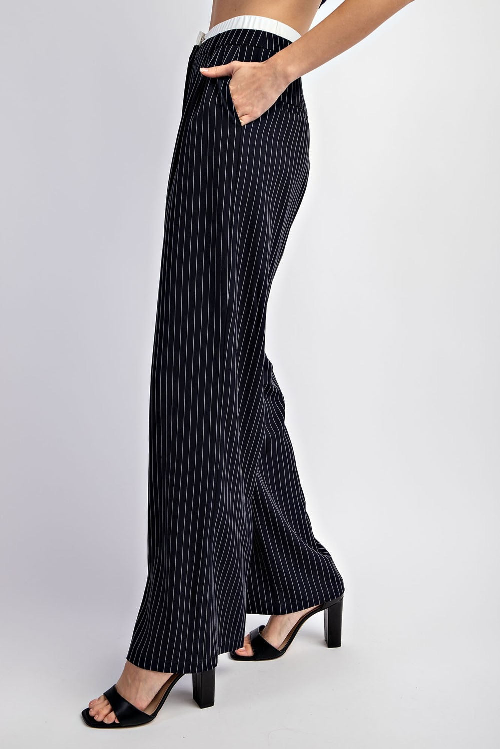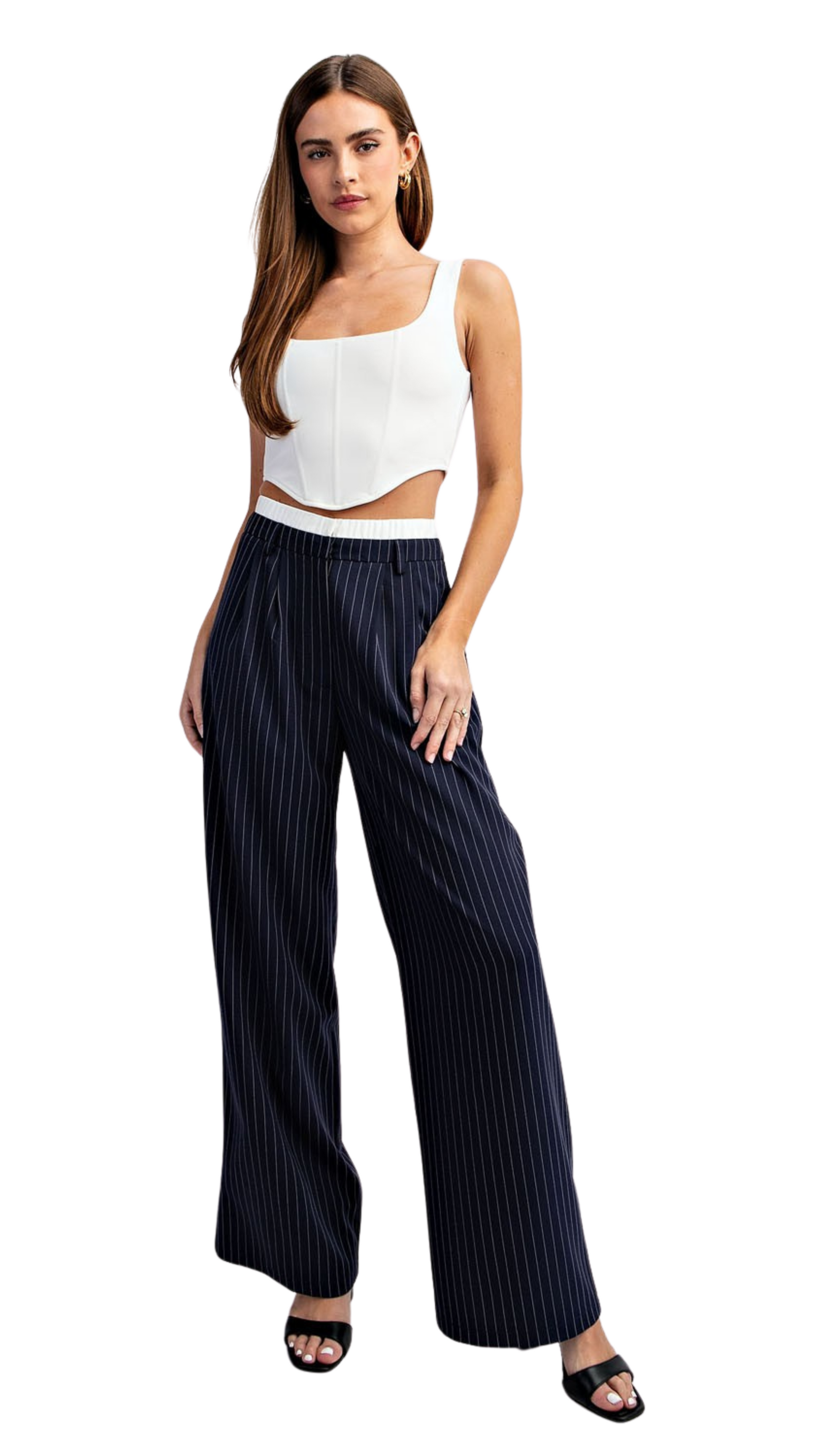 Maritime Elegance Double-Waist Pants: Sail into style with these sophisticated pants featuring a unique double-waist design. The top waist, adorned with a comfortable white elastic band, offers a modern twist, while the navy-striped white fabric below adds a nautical flair. Crafted with attention to detail, these pants exude elegance and versatility, perfect for both casual outings and more formal occasions. Whether you're strolling along the coast or attending a seaside soirée, these pants will keep you looking chic and polished.