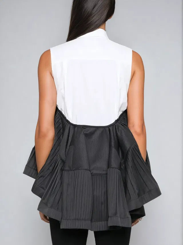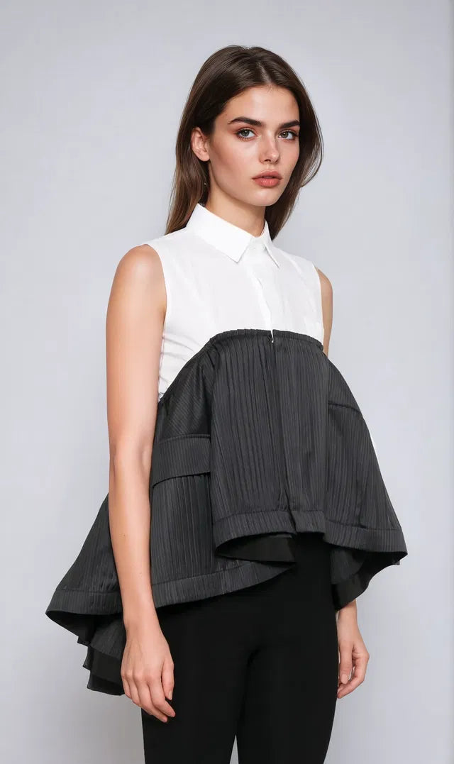 This layered vest brings a smart-meets-street edge with its crisp white shirt base and pleated pinstripe overlay.