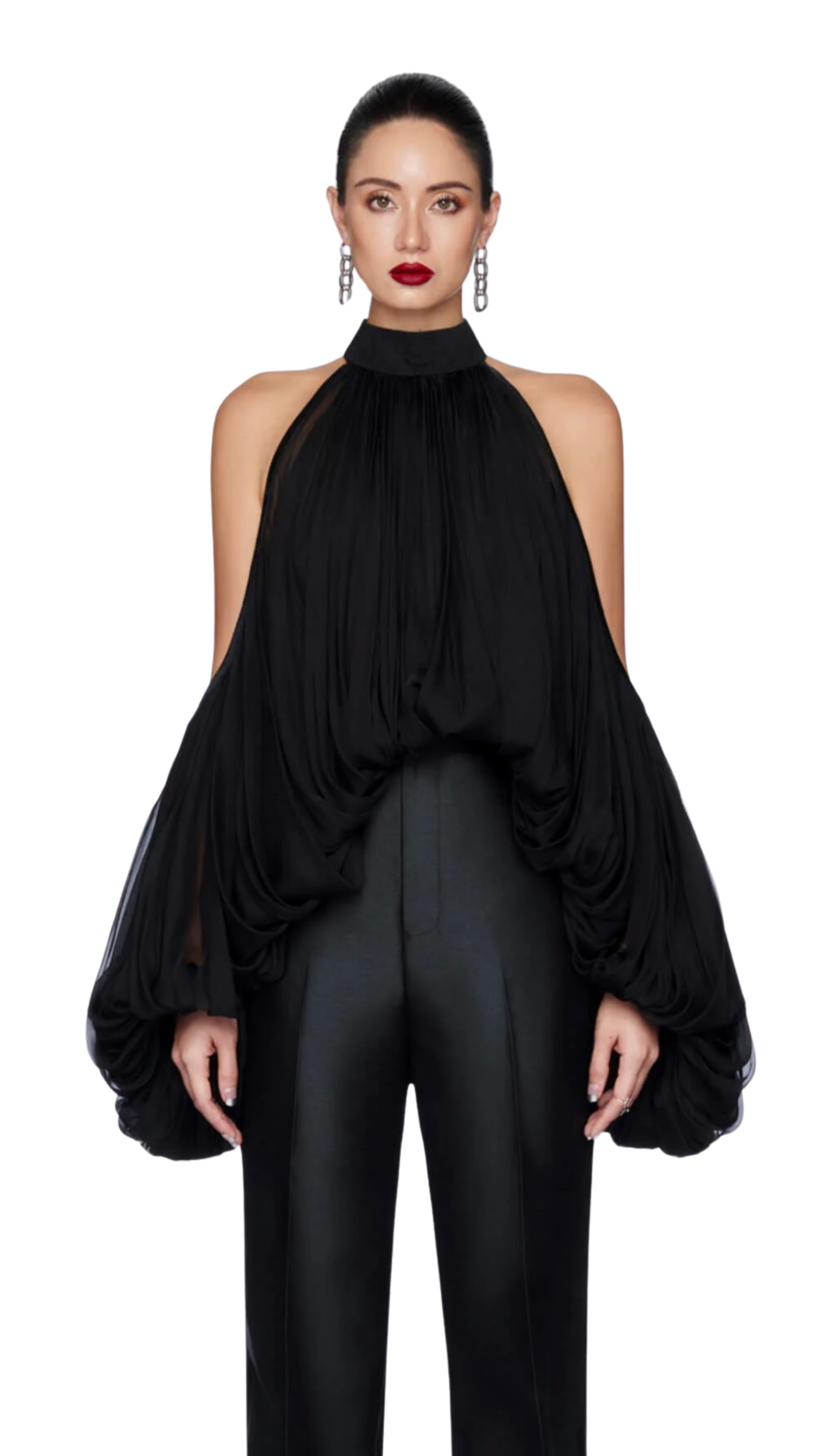Draped Lantern Sleeve Halter Top- Black