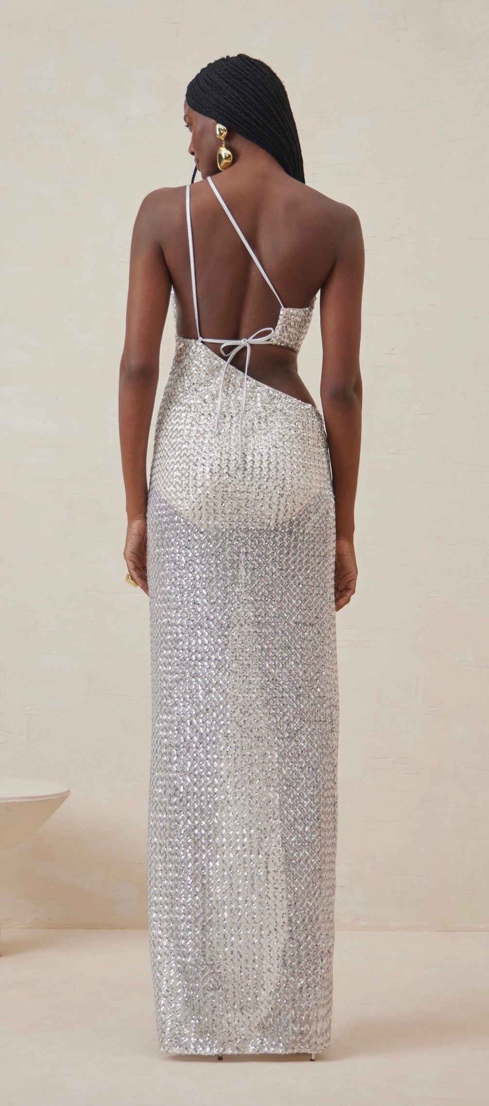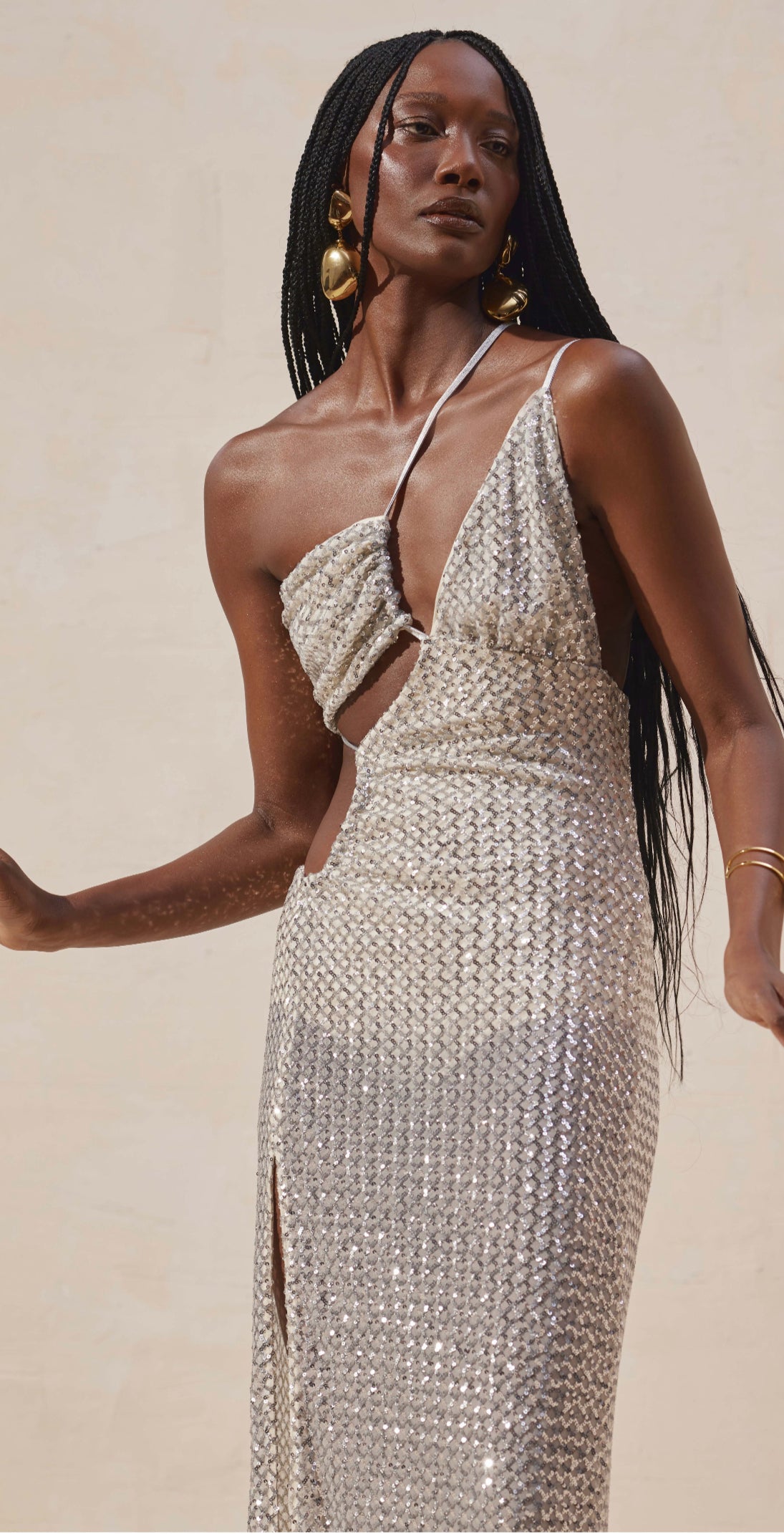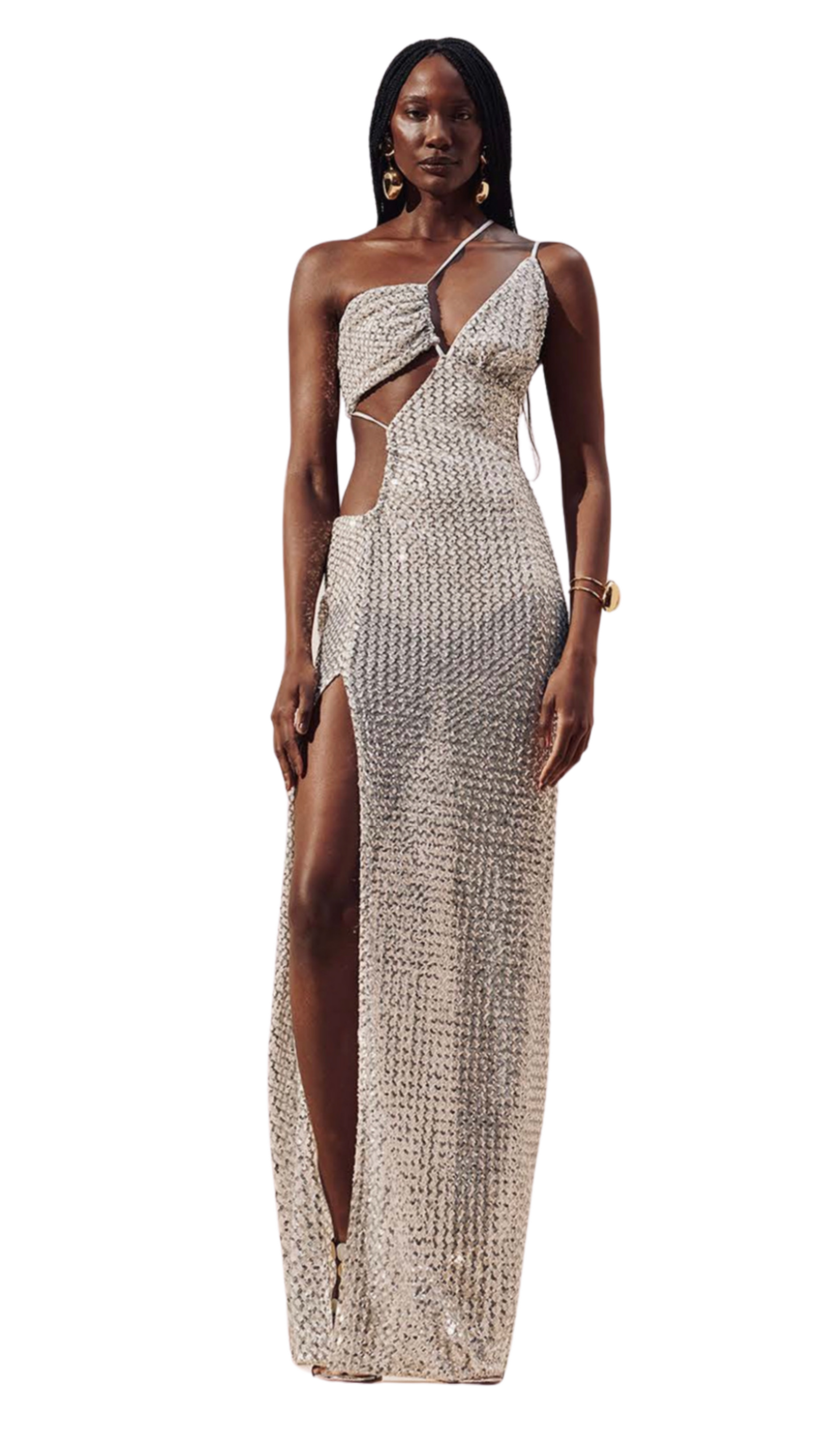 Introducing our stunning Silver Sequin Gown, designed to turn heads at any event. This glamorous floor-length dress features shimmering silver sequins that catch the light beautifully, ensuring you shine all night long. The elegant slit adds a touch of allure, while the strategically placed cutouts offer a modern and sophisticated twist. Perfect for evening soirées, galas, or any special occasion where you want to make a statement, this dress combines classic elegance with contemporary style. Step out in confidence and elegance with this dazzling masterpiece.