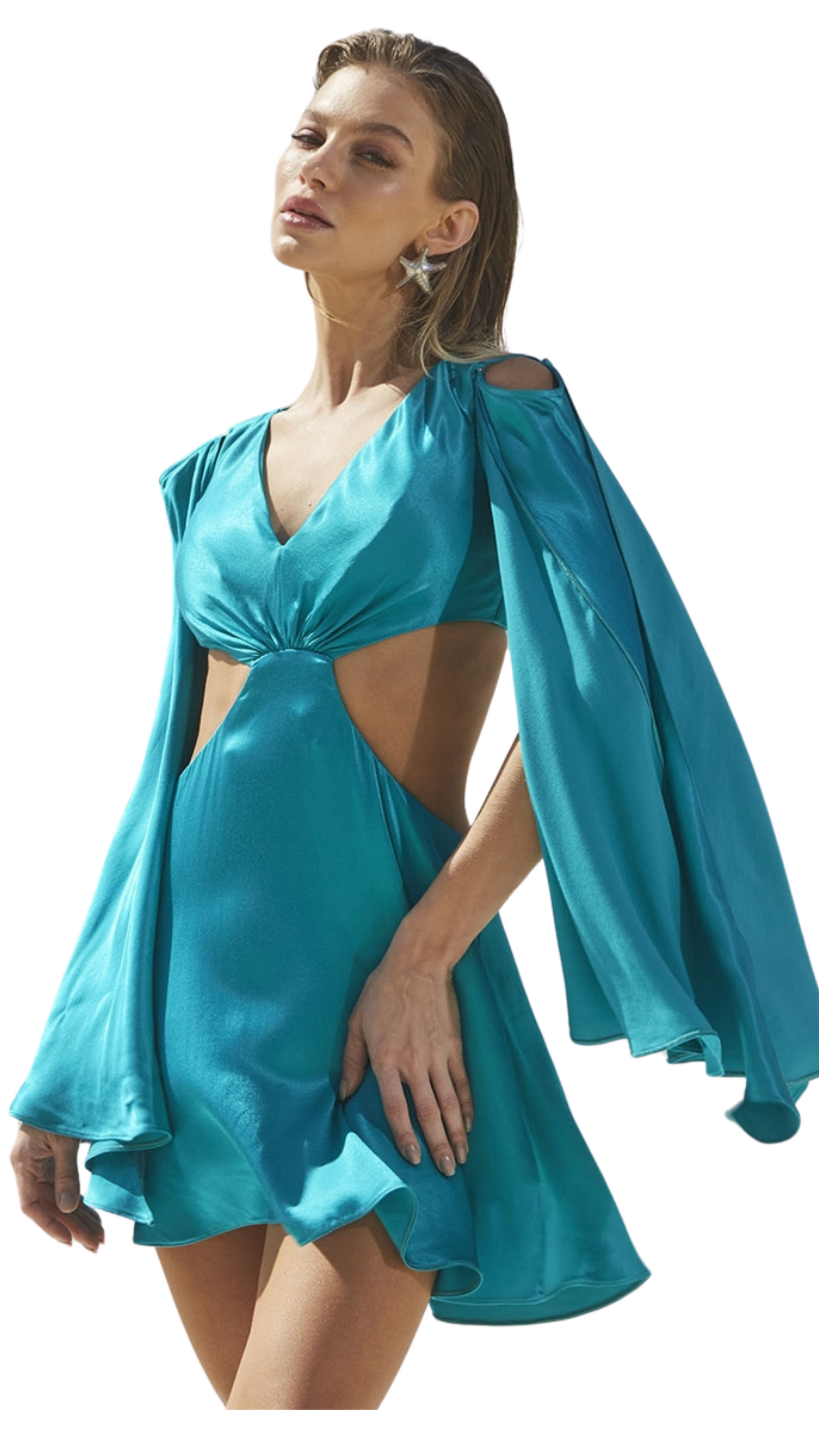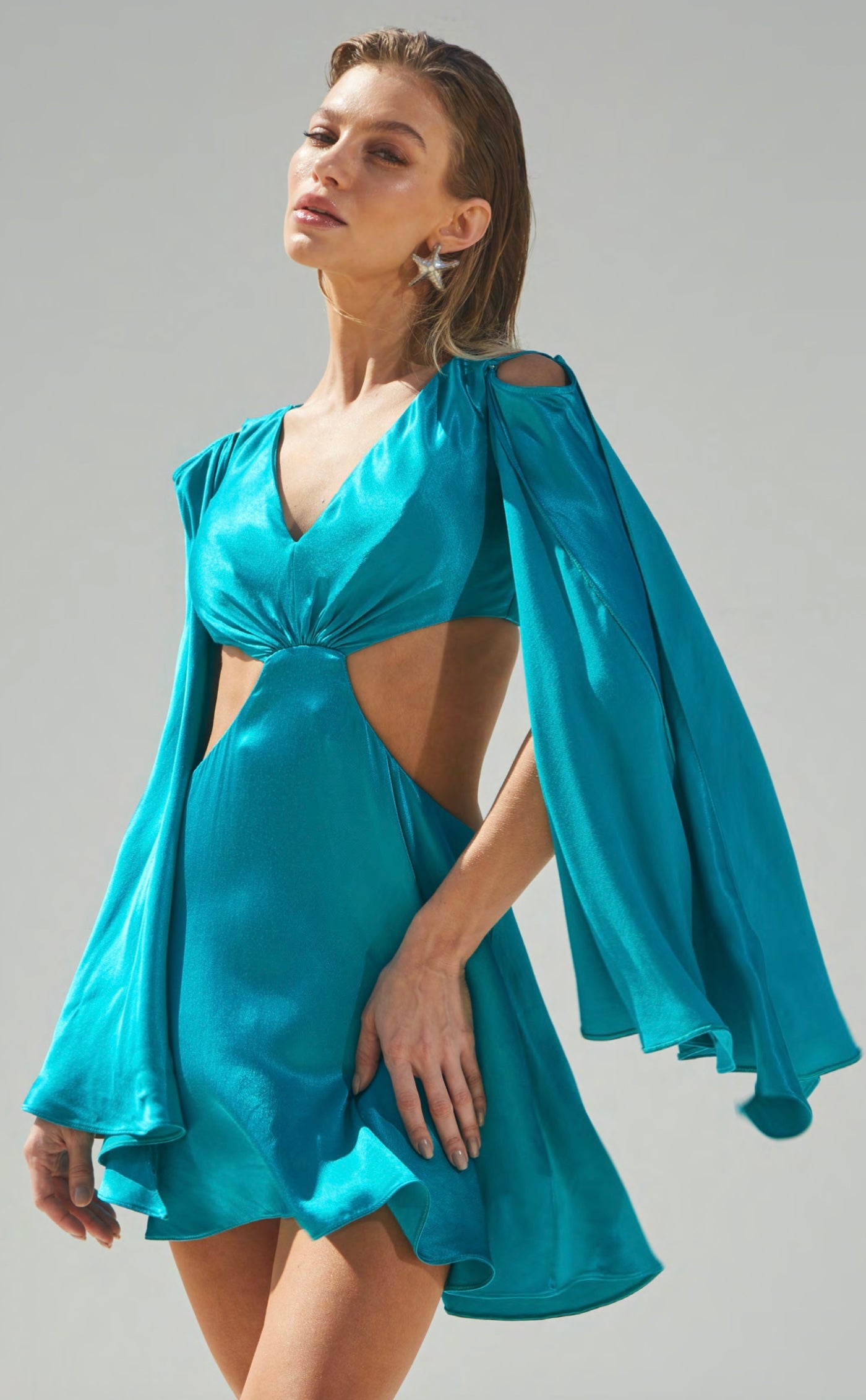 The Satin Cut-Out Kelly Dress combines elegance and boldness in a balanced manner. Strategically positioned cut-outs subtly reveal the skin, adding a touch of sensuality. The satin fabric lends a soft glow, elevating the sophistication of the piece.
