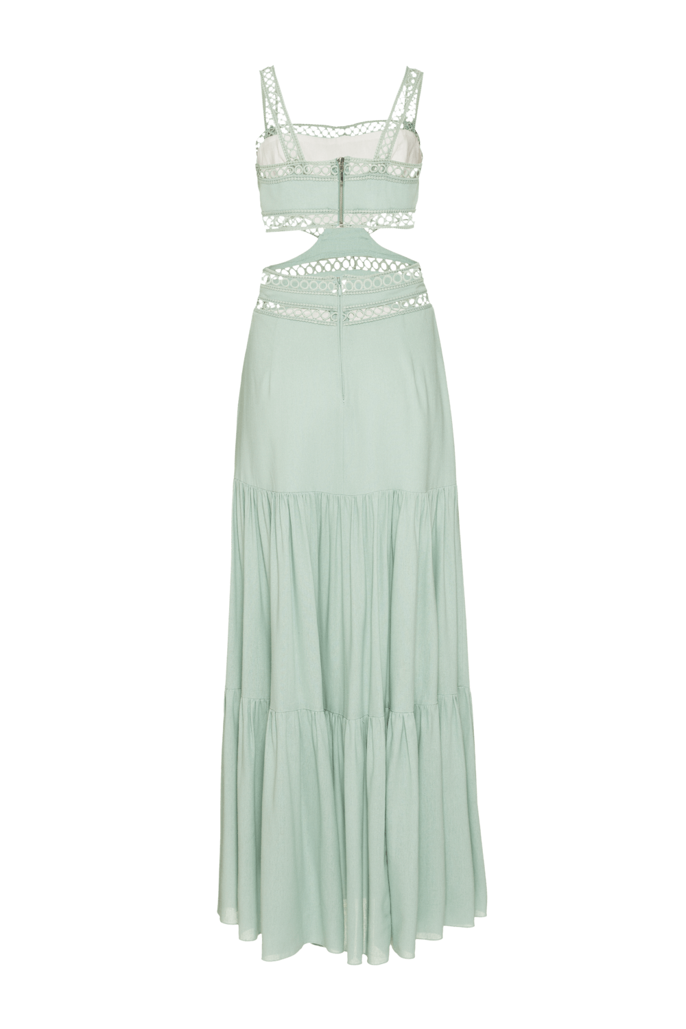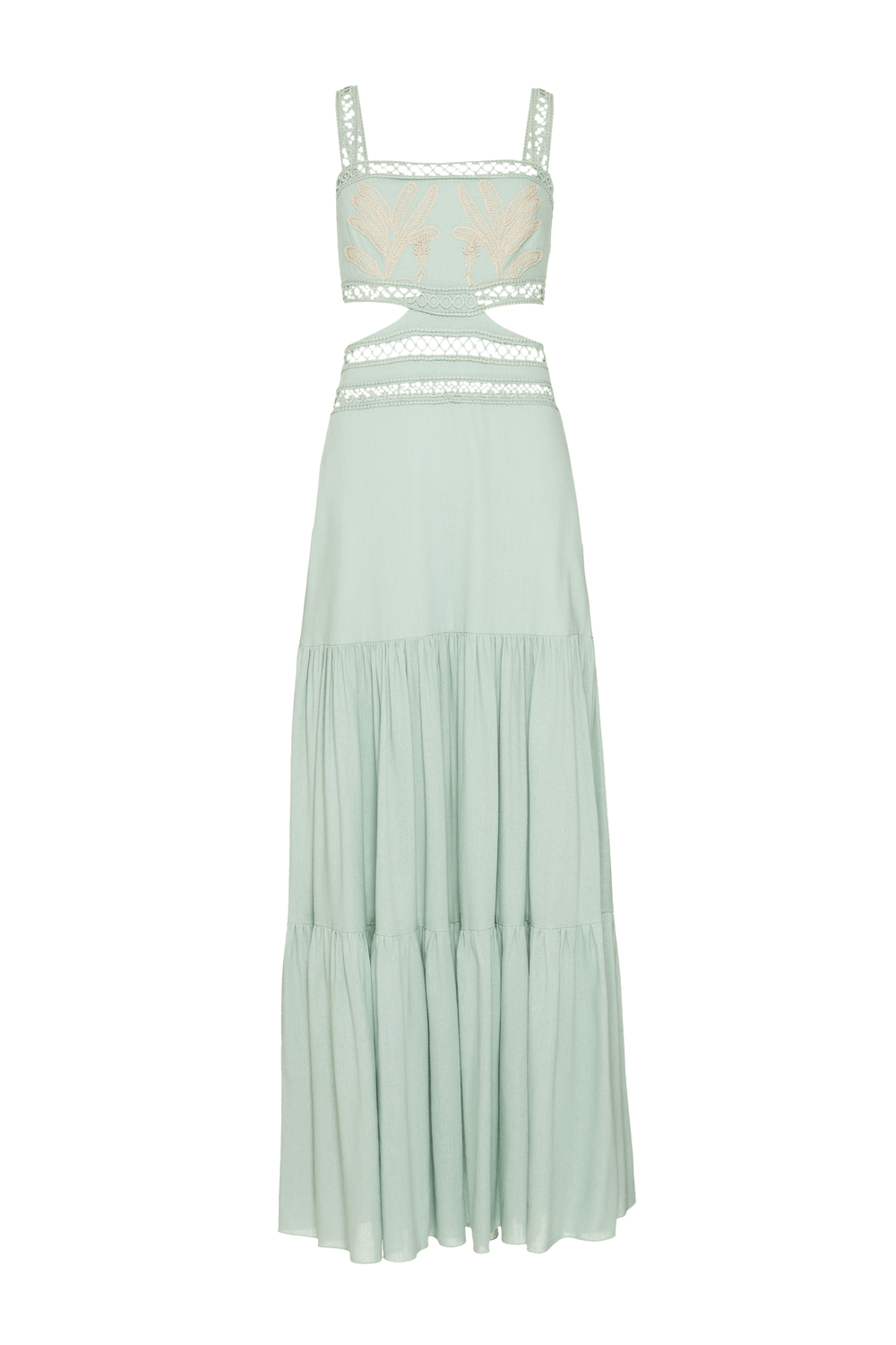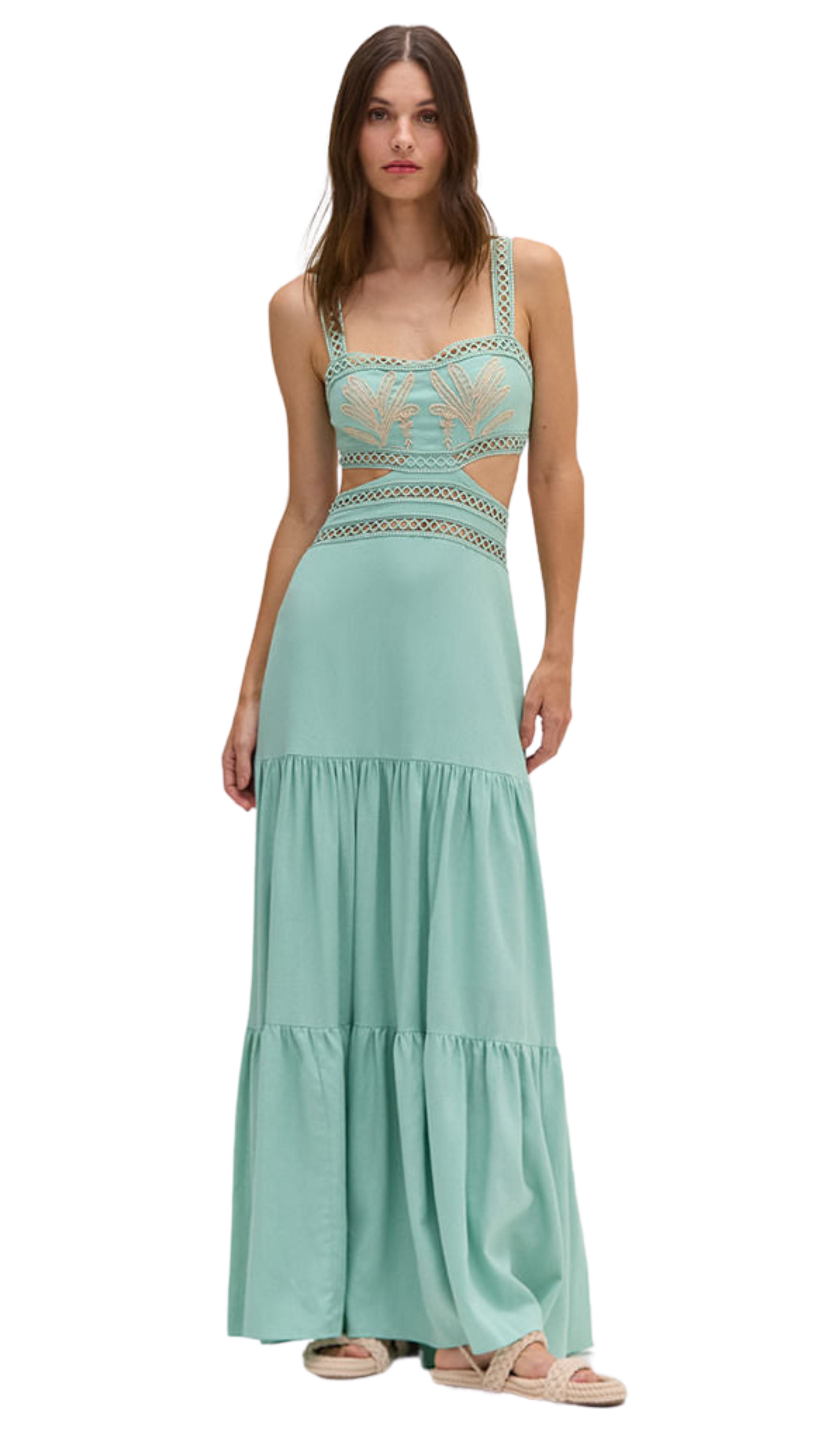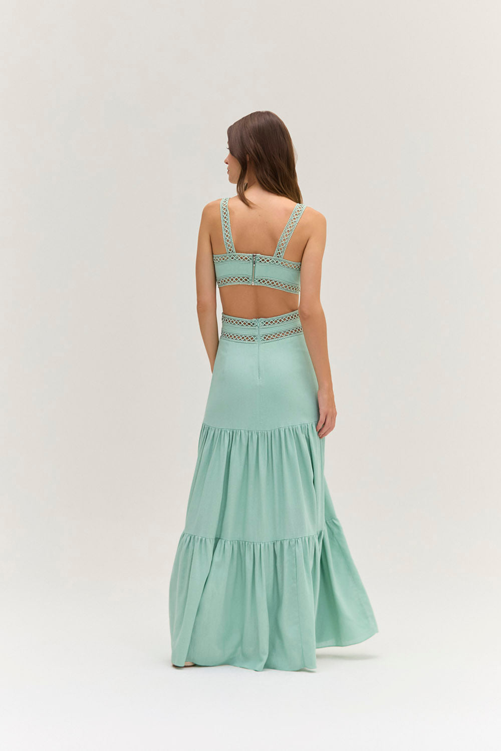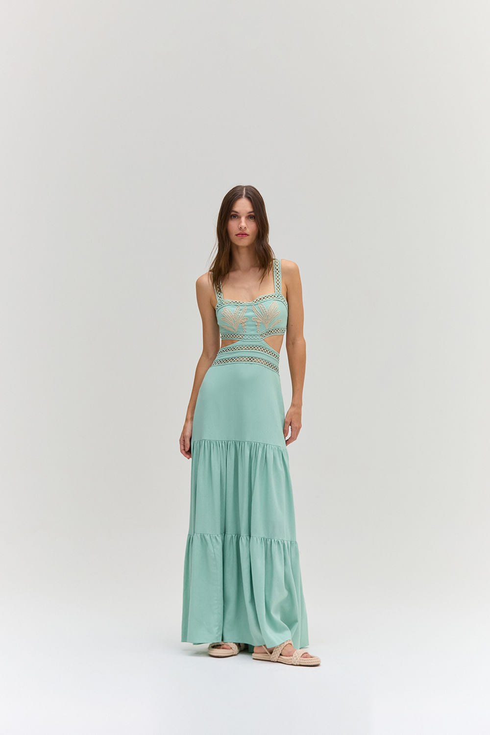 Long dress made of linen with 100% cotton lining, open side cutout on the bust, inset applied to the front and back neckline, straps and lower bust, has a gathered skirt, built-in finish and metal zipper for the bust and invisible zipper for the skirt