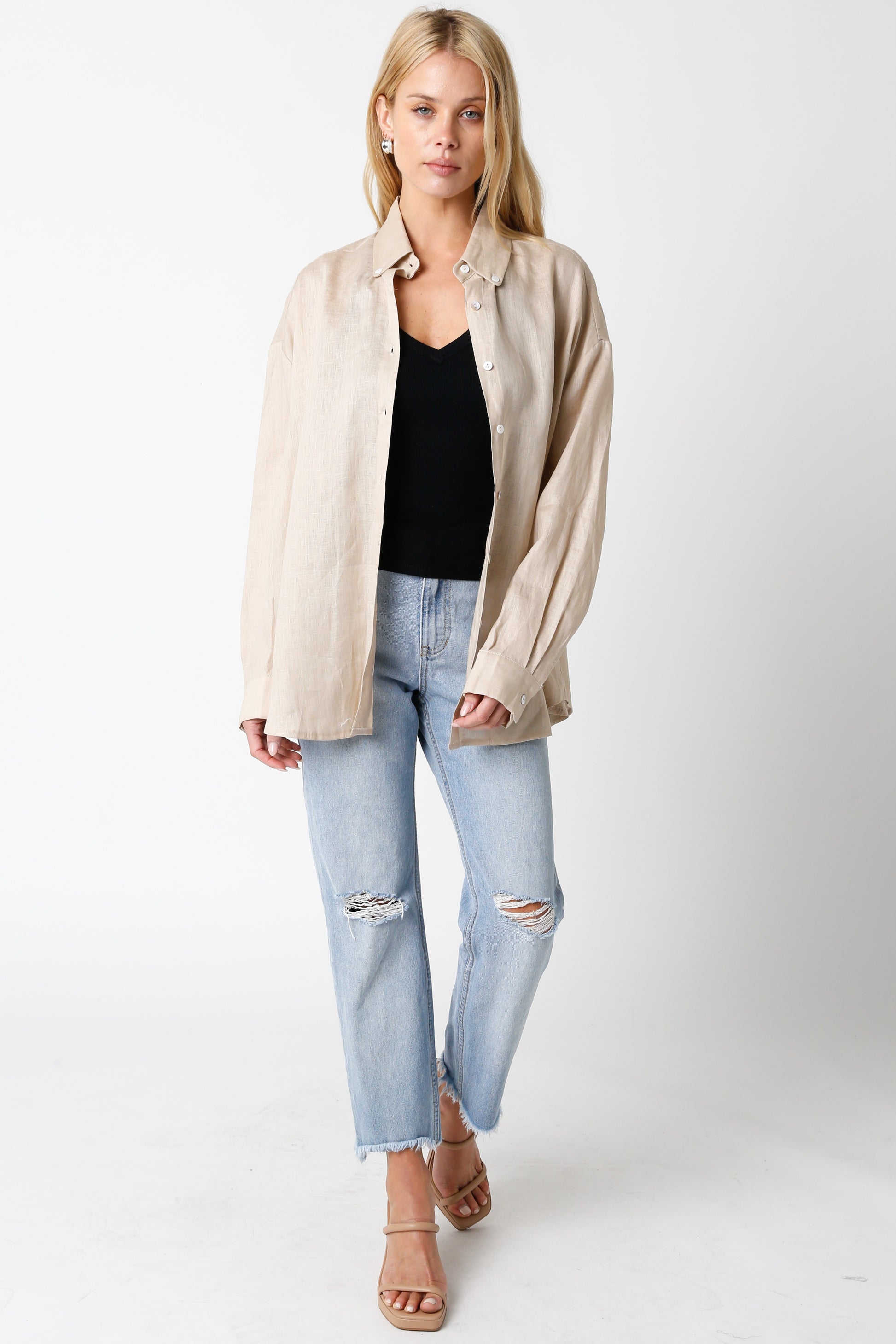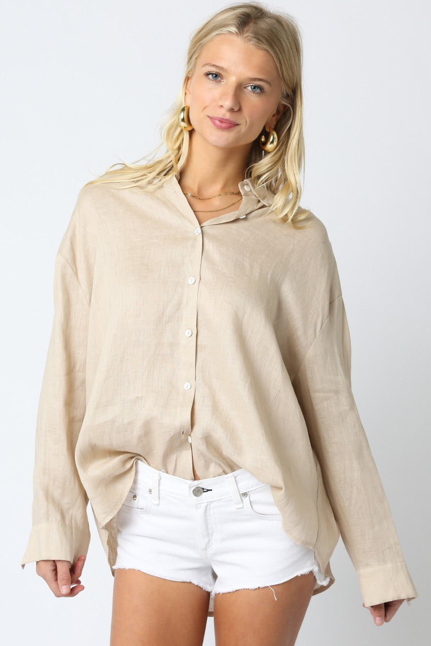 An oversized button-down crafted from breathable beige linen. A relaxed essential with a slightly dropped shoulder and classic collar – perfect for layering or wearing solo.