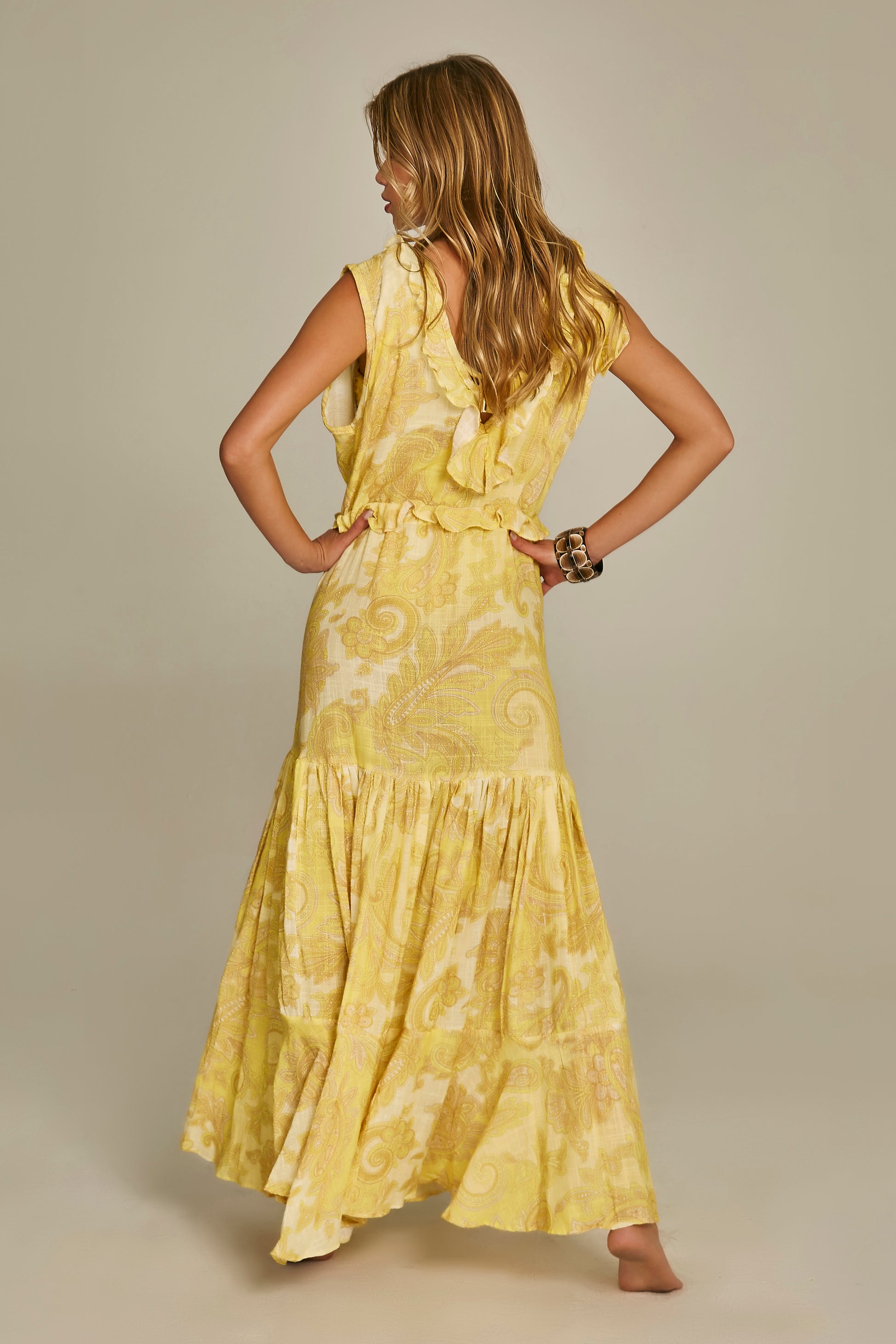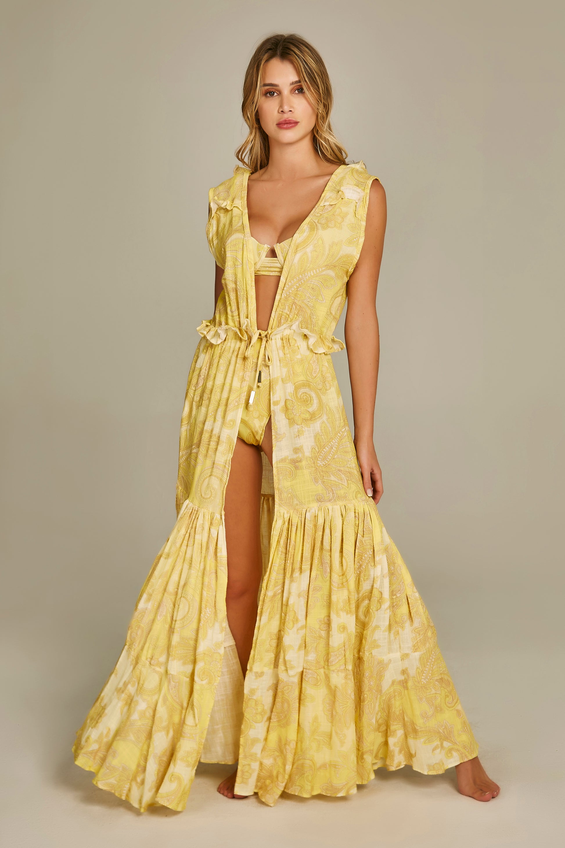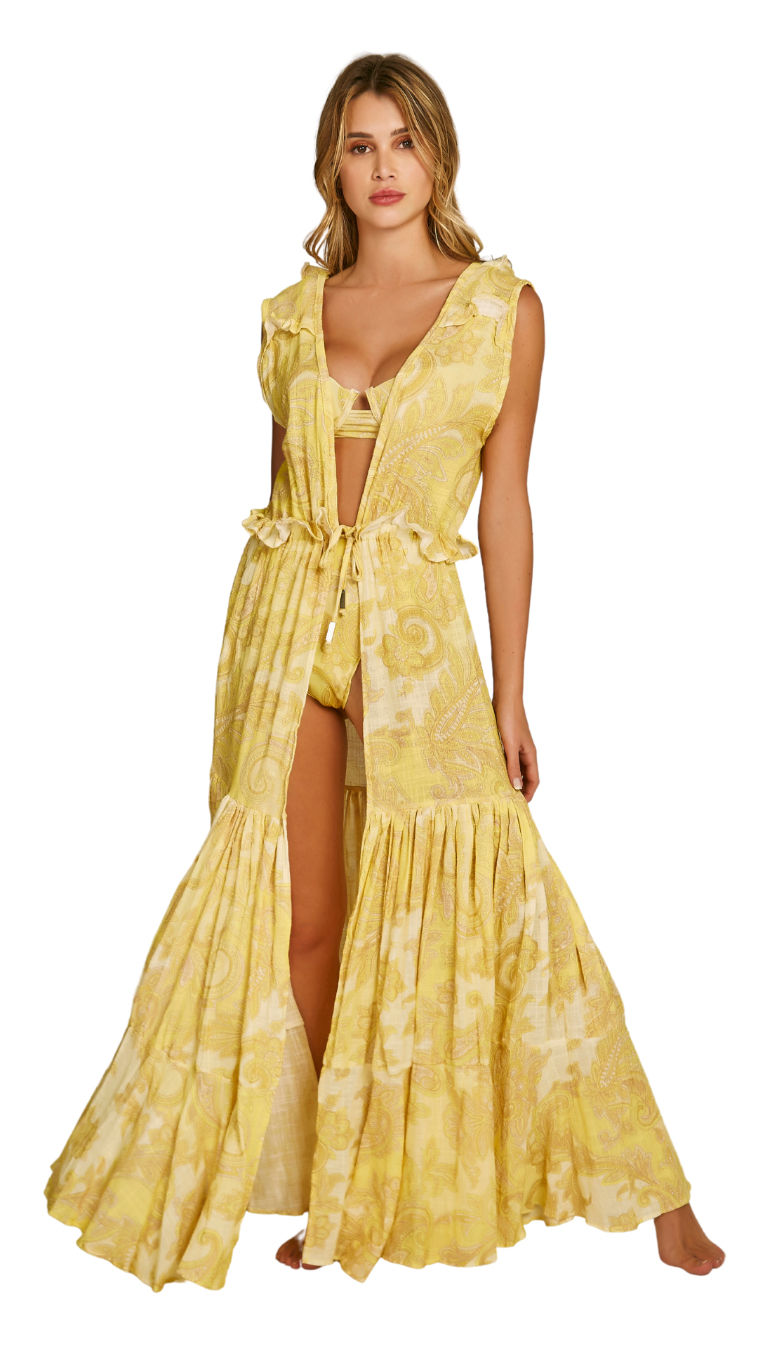 This cover up is one size and is adjustable at the waist. The ruffles give this style a romantic and feminine look that goes perfectly with other bikinis and swimsuits in the Yellow Baroque Print