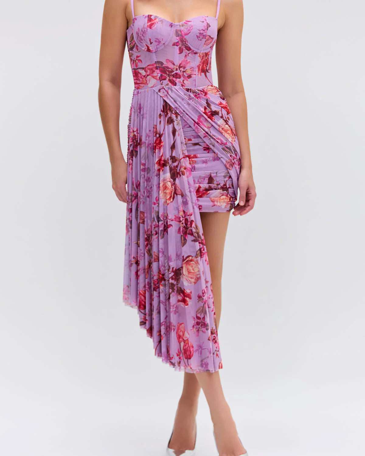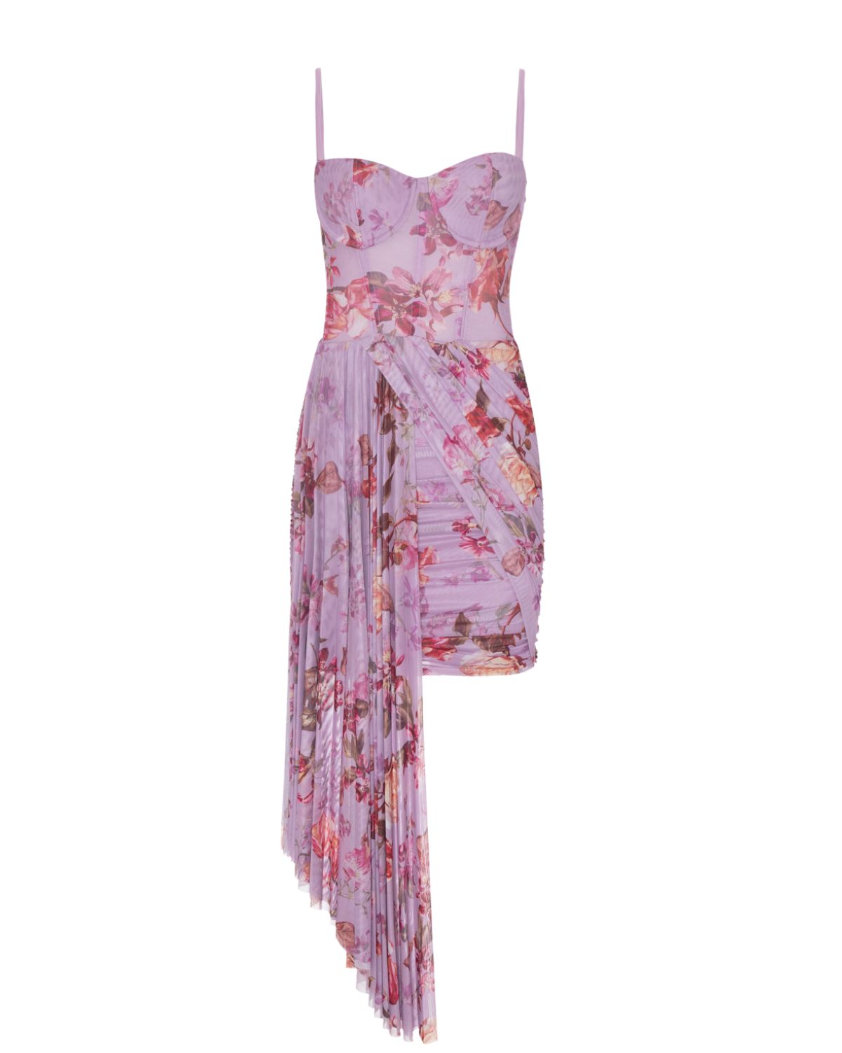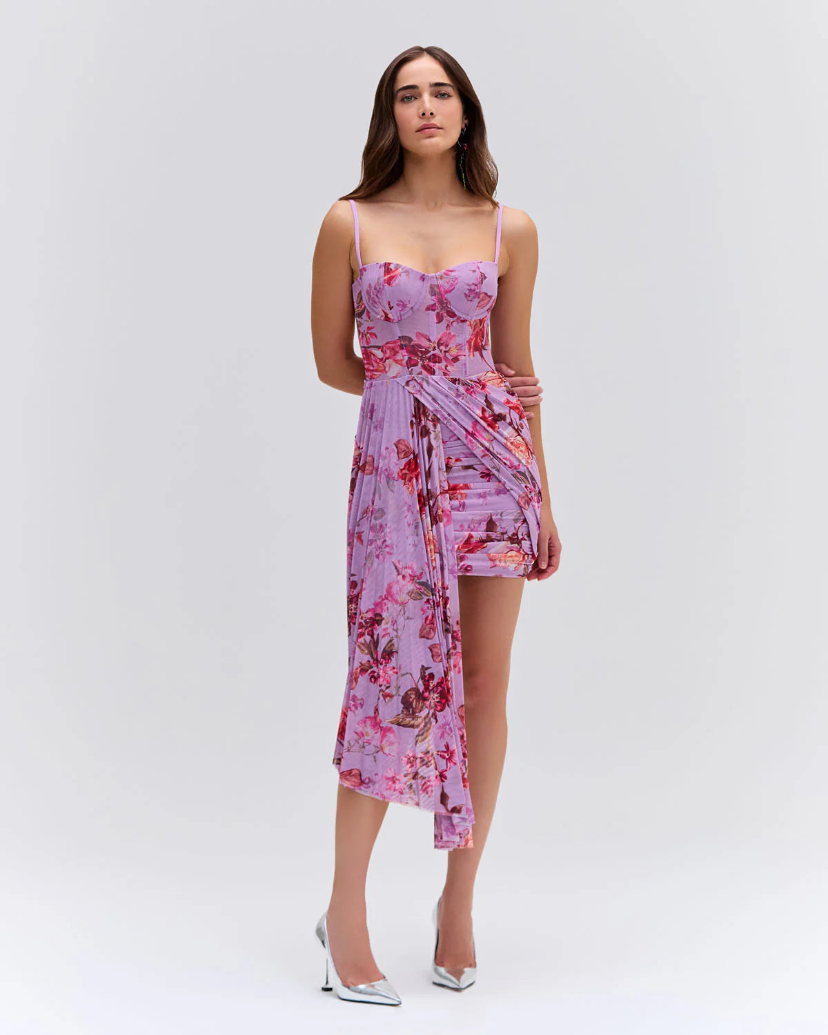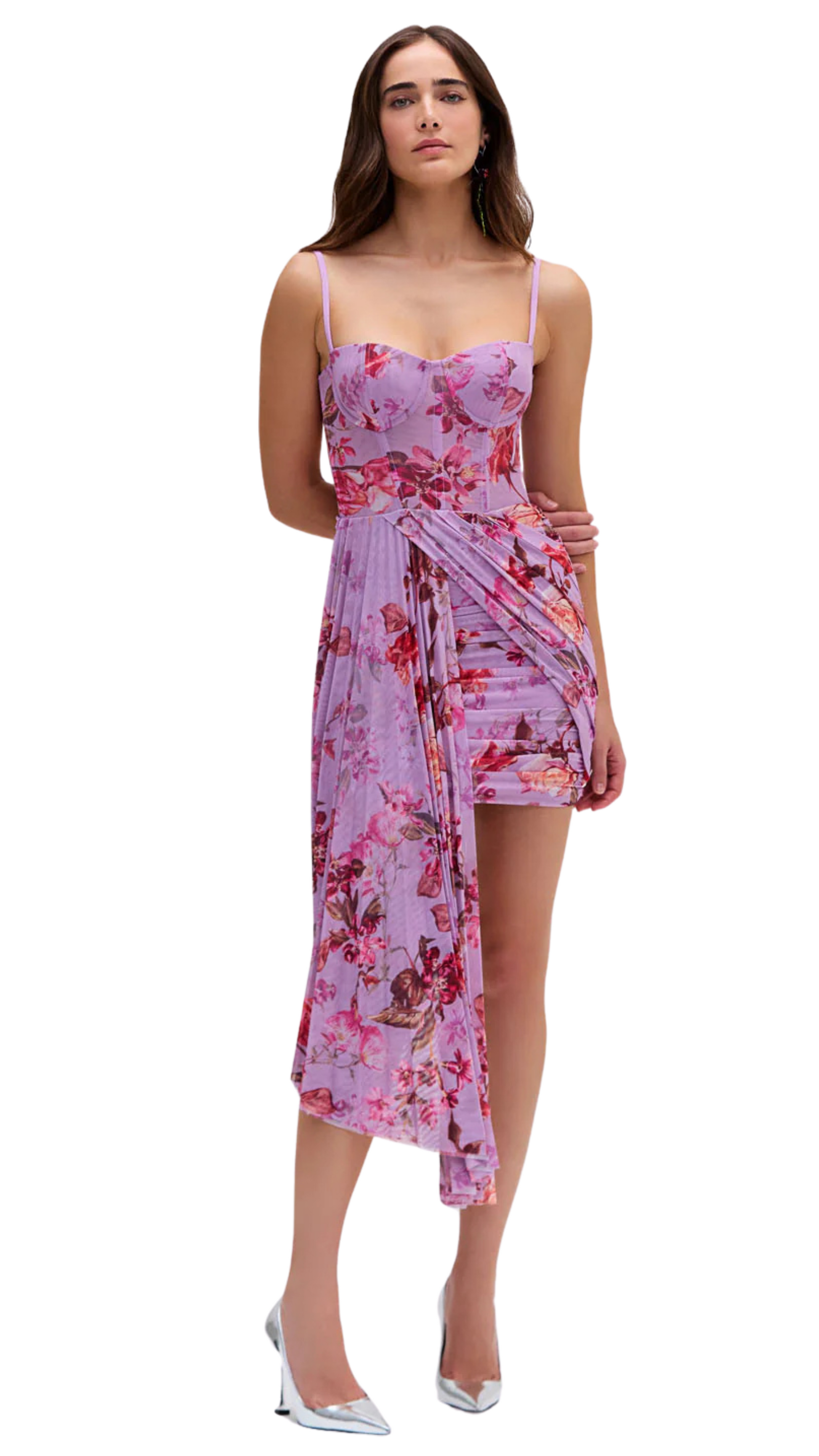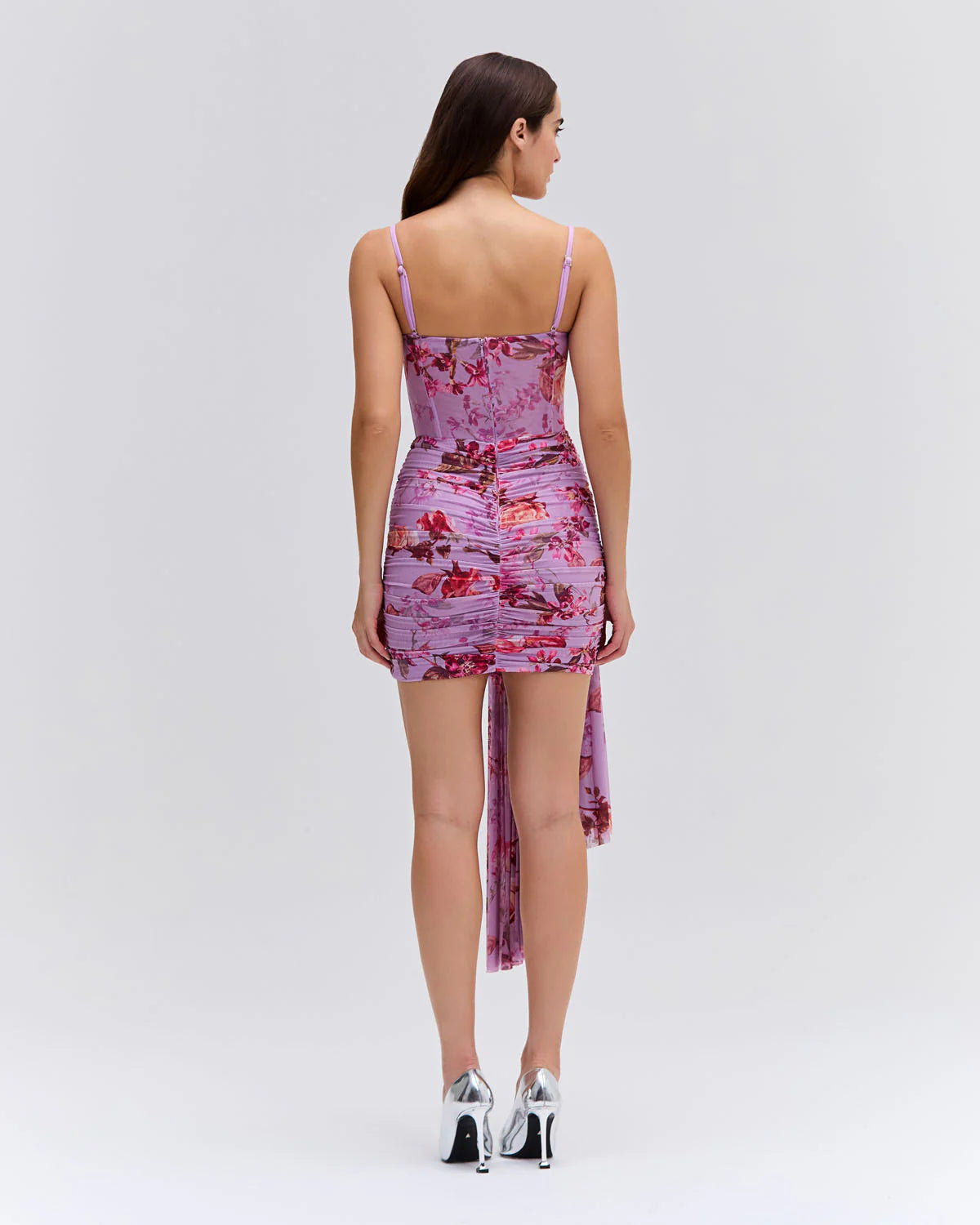 Floral Haze Bustier Mini Dress is crafted from a stretch tulle fabric. The bodice features a corset bralette detail and a sweetheart neckline. Mini-skirt with side-draping. Straps are adjustable. Back zipper closure, true to size.