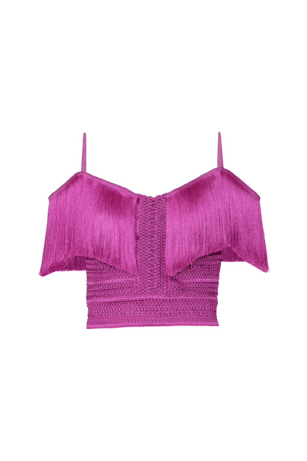 Sleeveless Fringe Cropped Top is crafted from woven trims. Fringe square neck bodice with shoulder straps. Cropped fit.