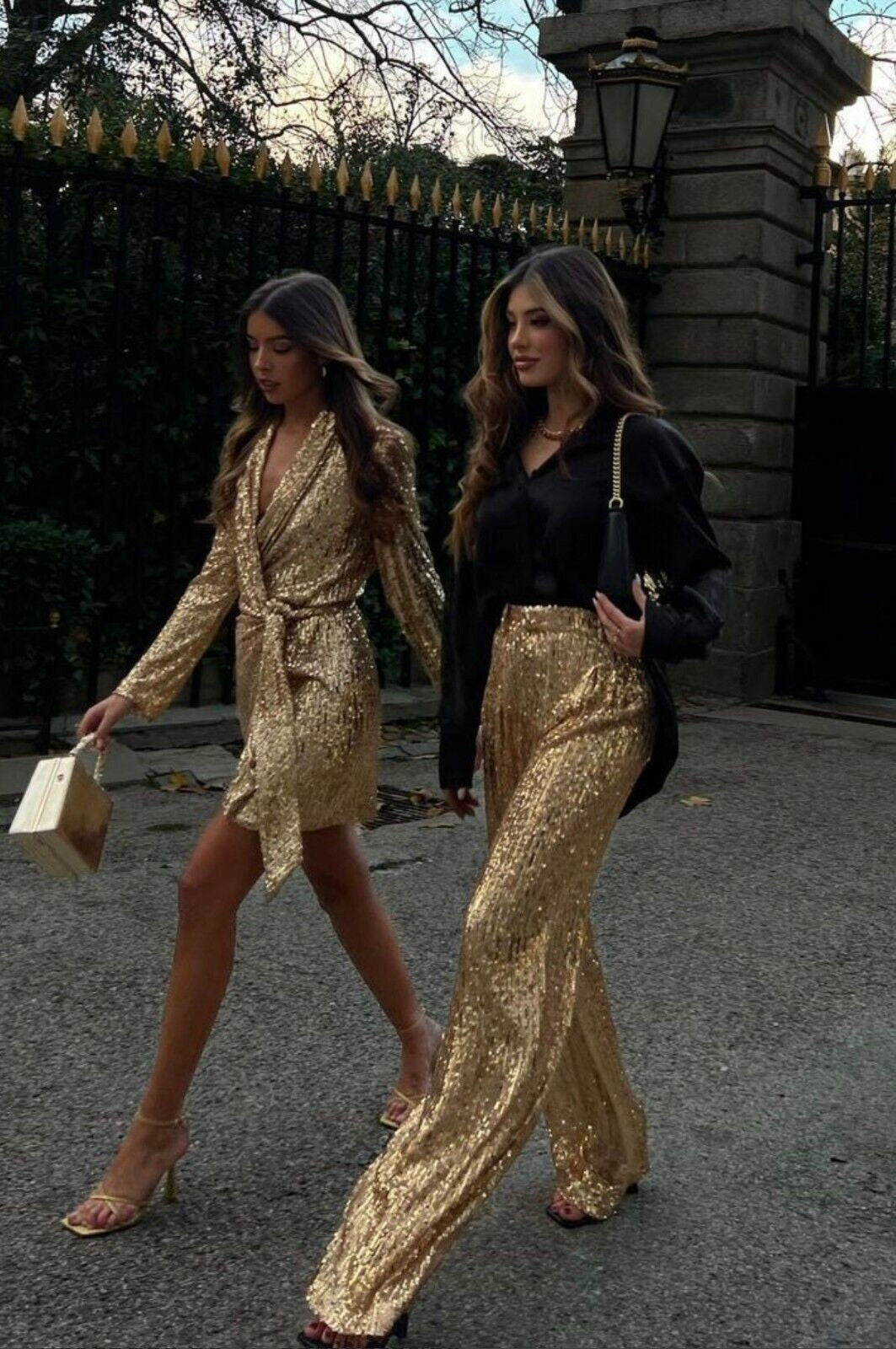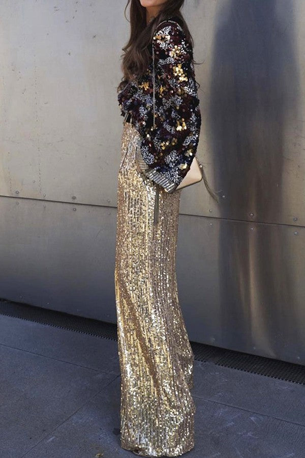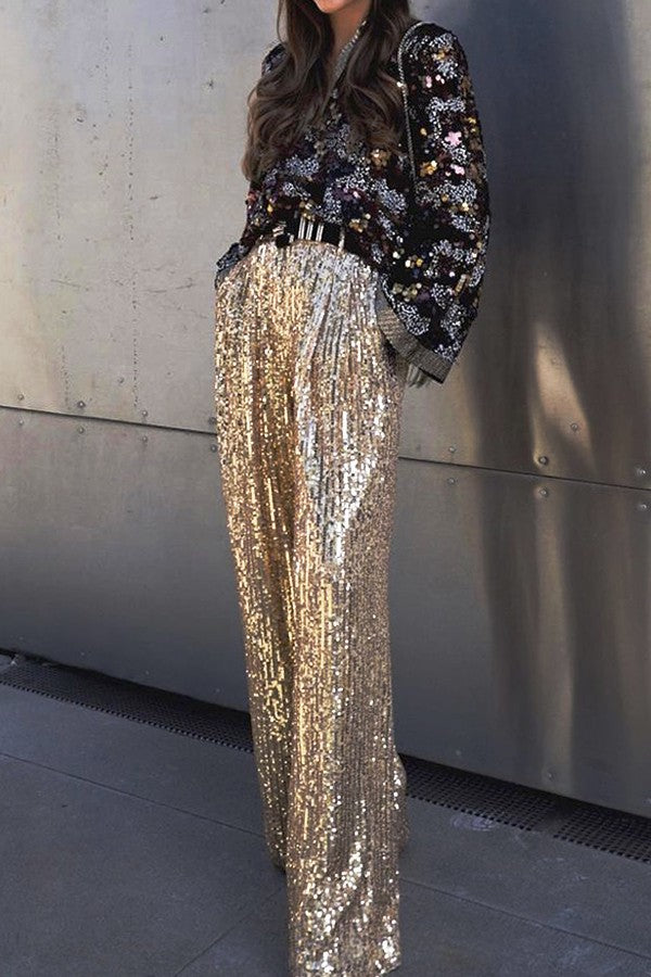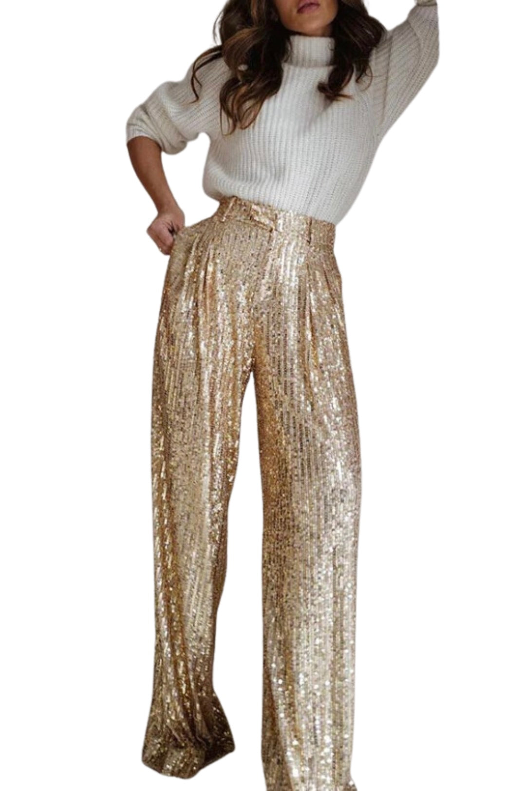 Structured wide legged pant in gold with all over sequins, perfect for the holidays.