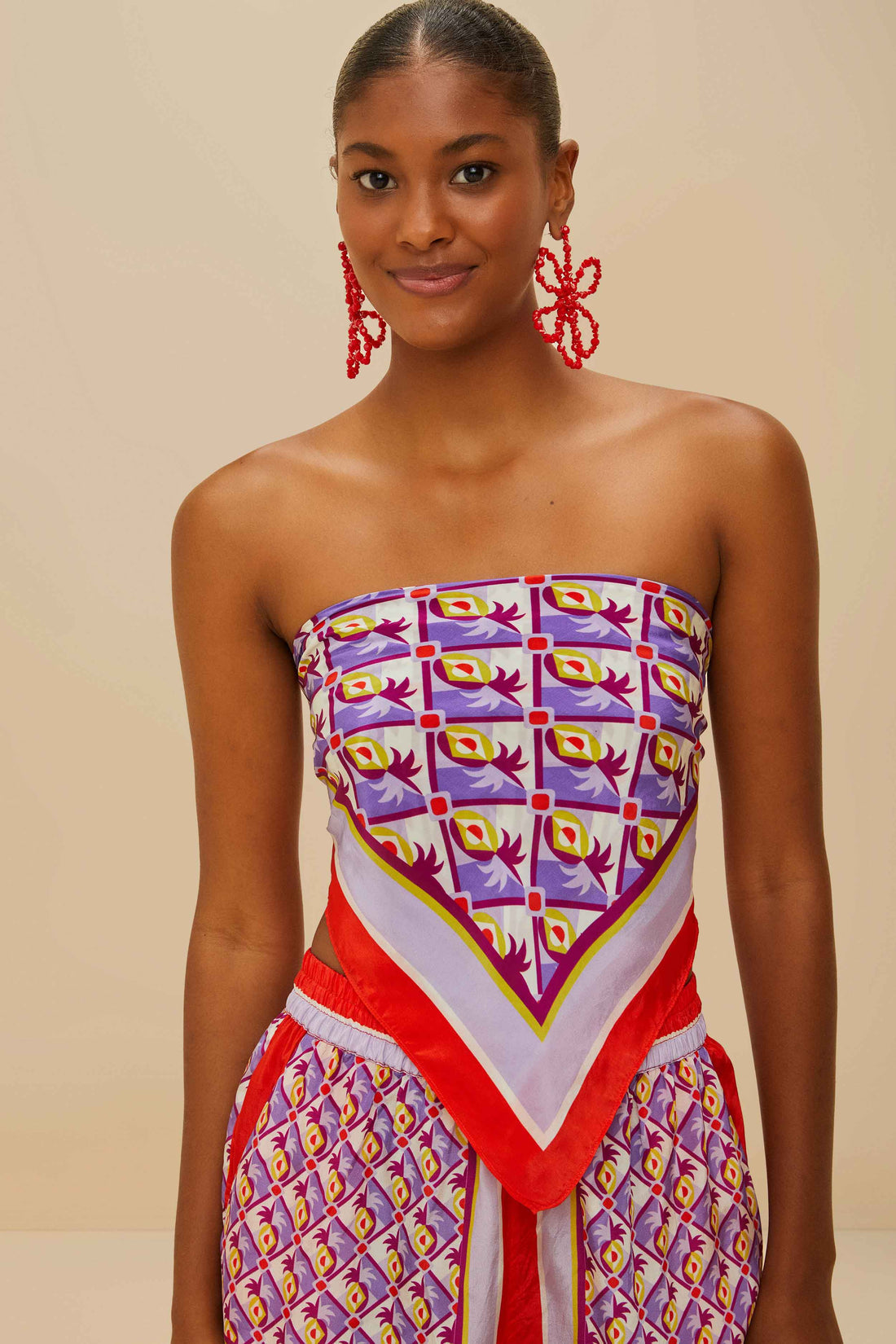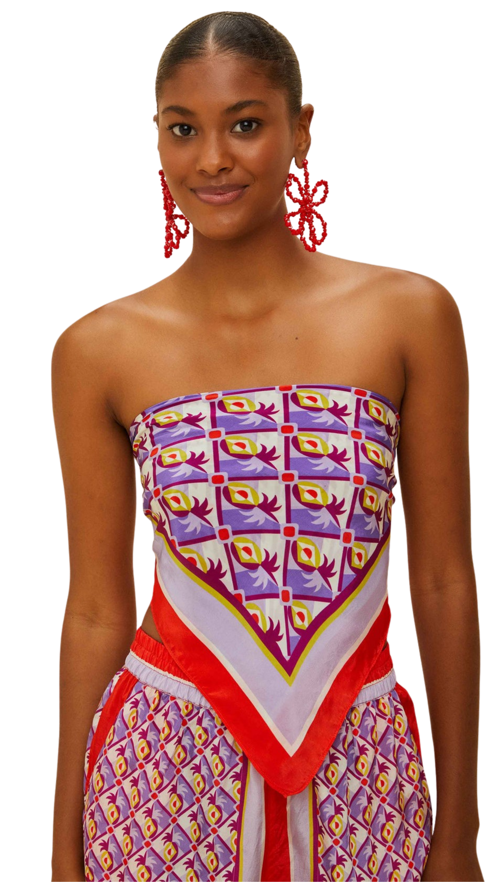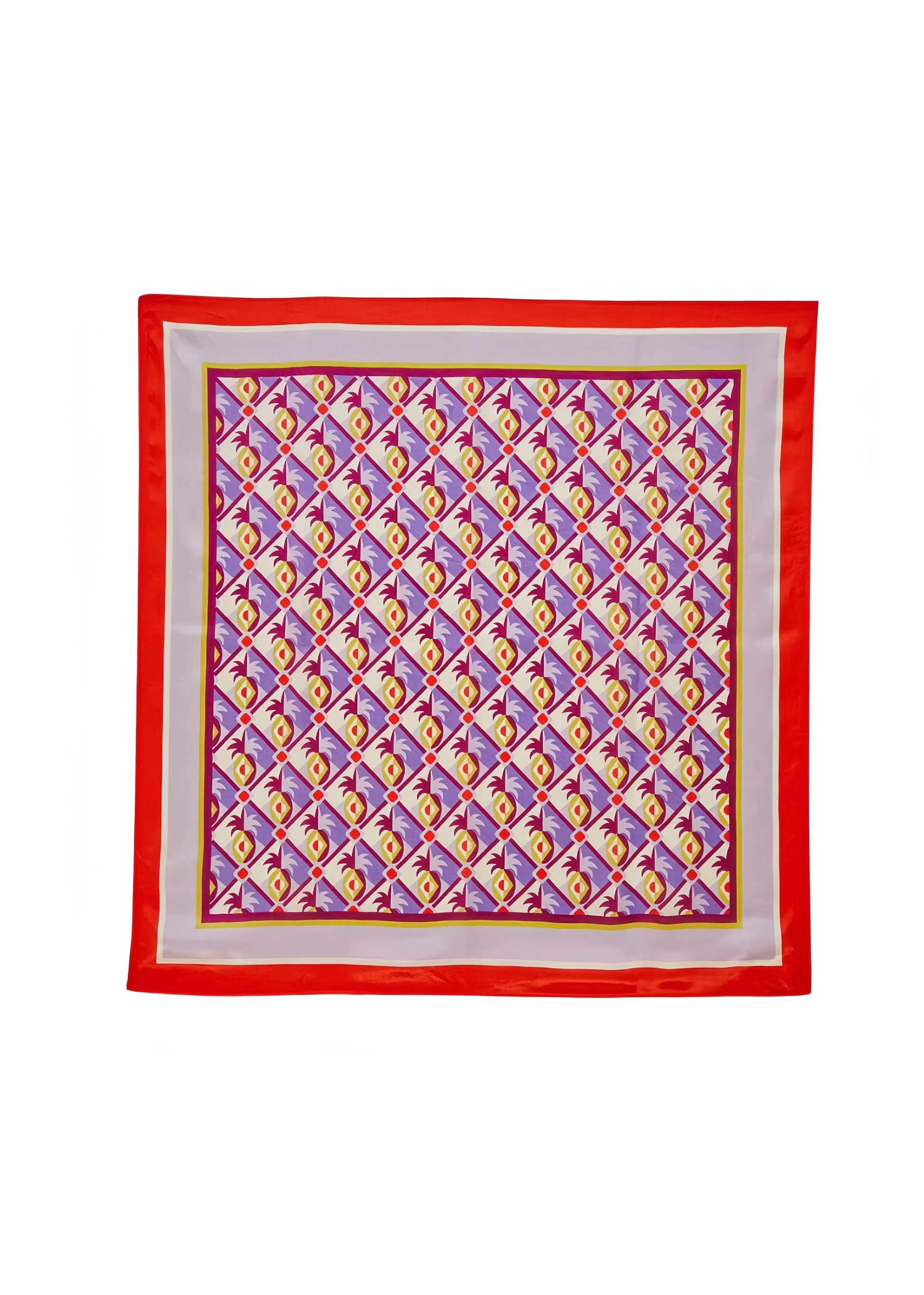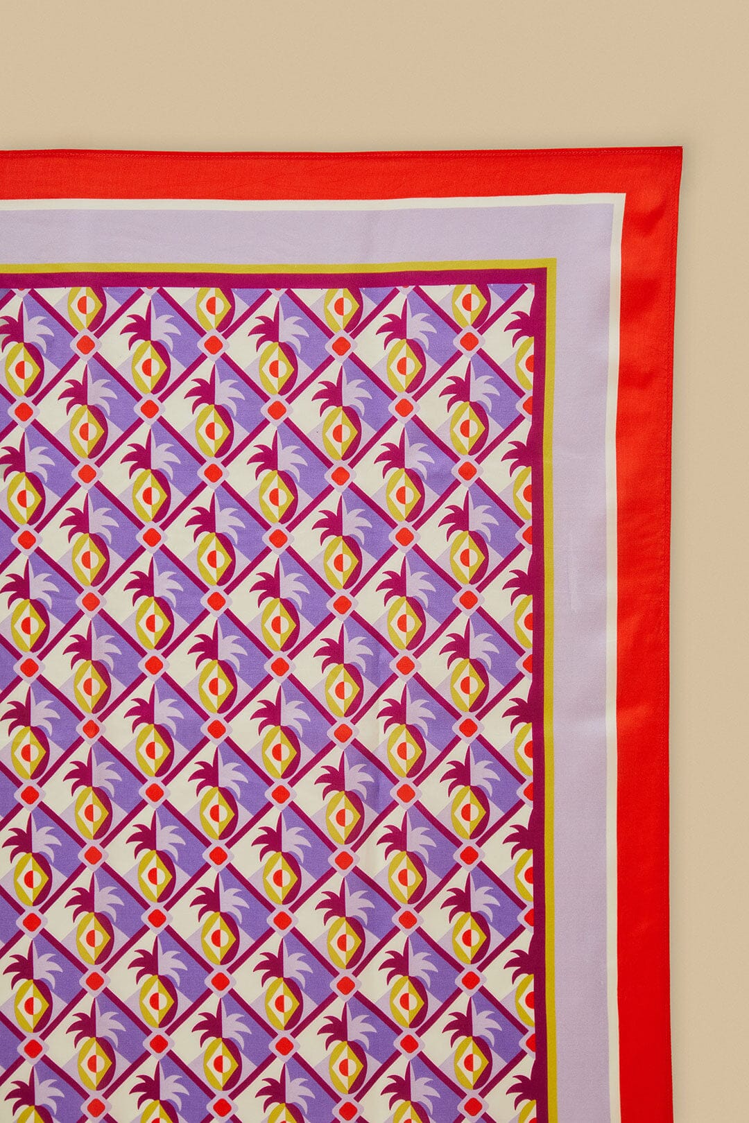Elevate your style with the multicolor graphic pineapple scarf from FARM Rio. Drenched in vibrant hues of purple, red, and yellow, this lively accessory features a playful pineapple motif set against a geometric backdrop. Tie it on your handbag, around a hat, use as a belt or tied back as a strapless top.