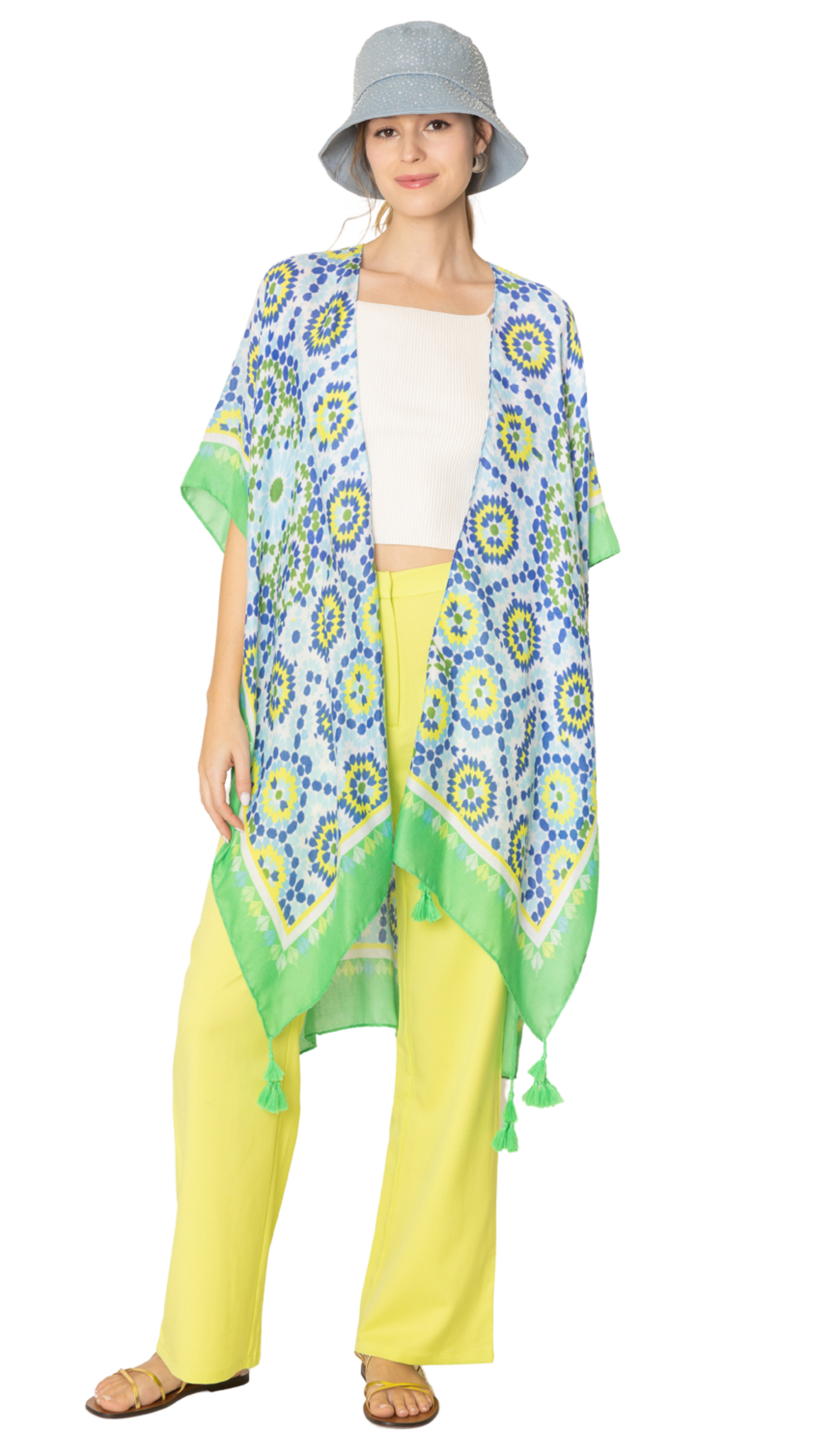 - Style Details: kimono with tassels. Perfect over a tee or swimsuit.