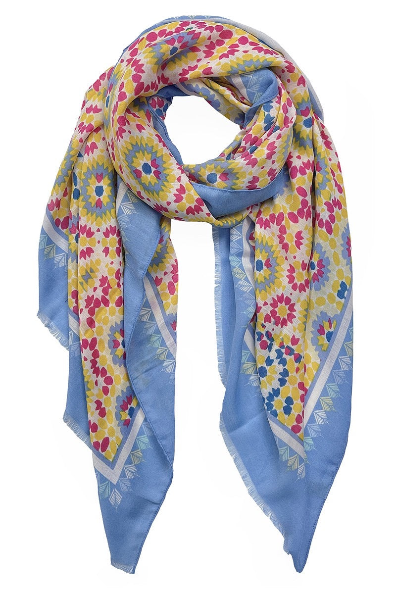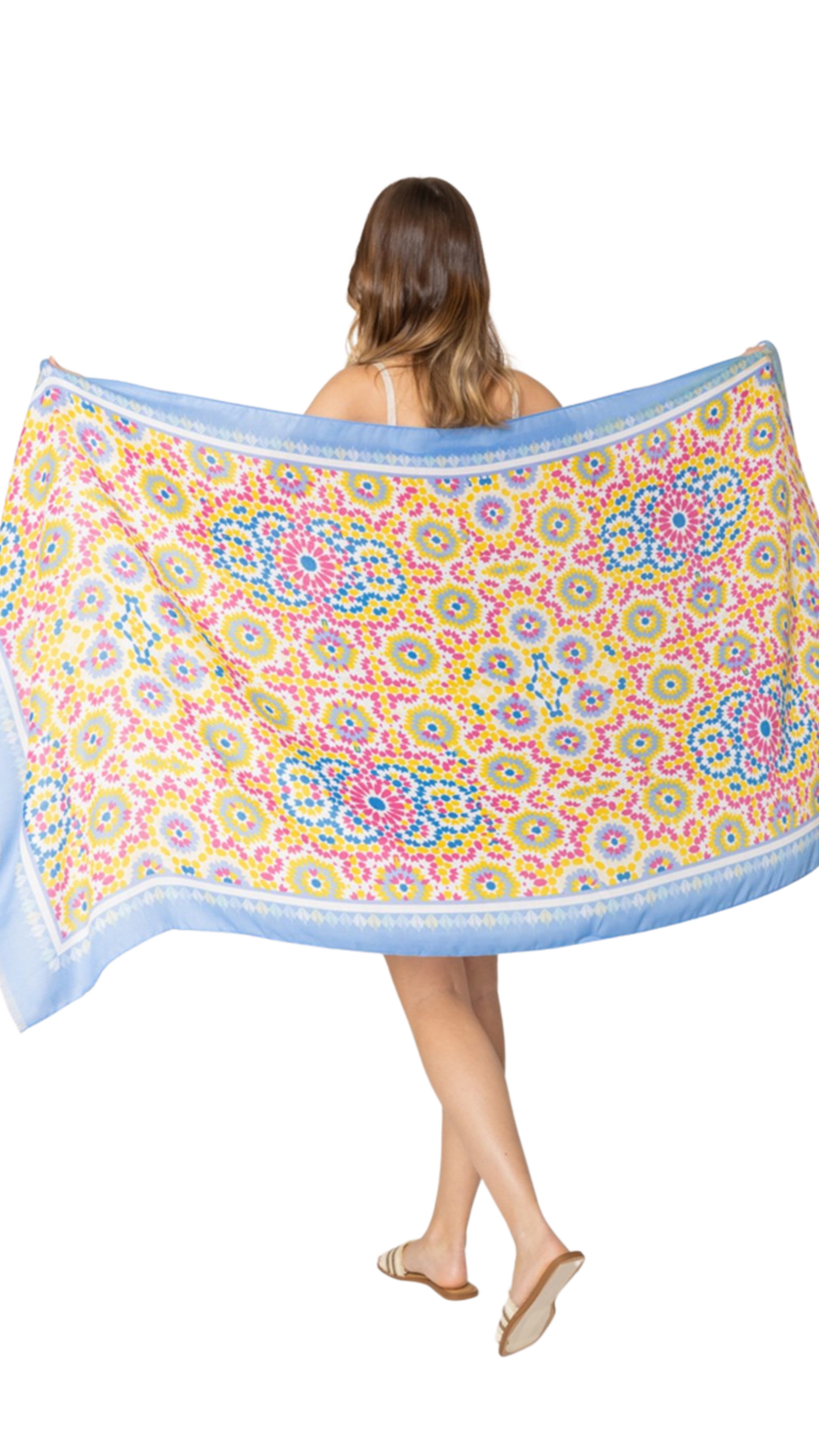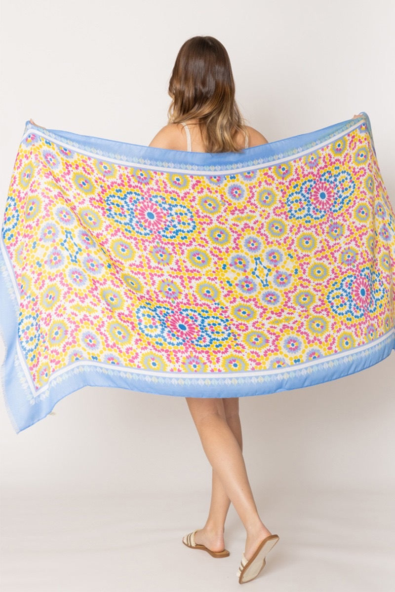 This beautiful scarf features a vibrant floral design, perfect for adding a pop of color to any outfit. Made from 100% polyester, it offers a soft and comfortable feel. The generous size allows for versatile styling options, whether wrapped around the waist as a pareo, draped around the shoulders or wrapped around the neck.