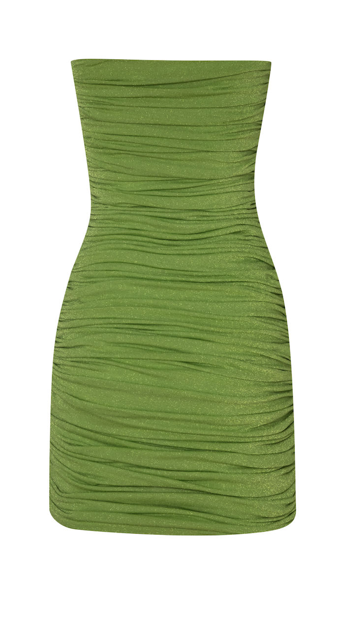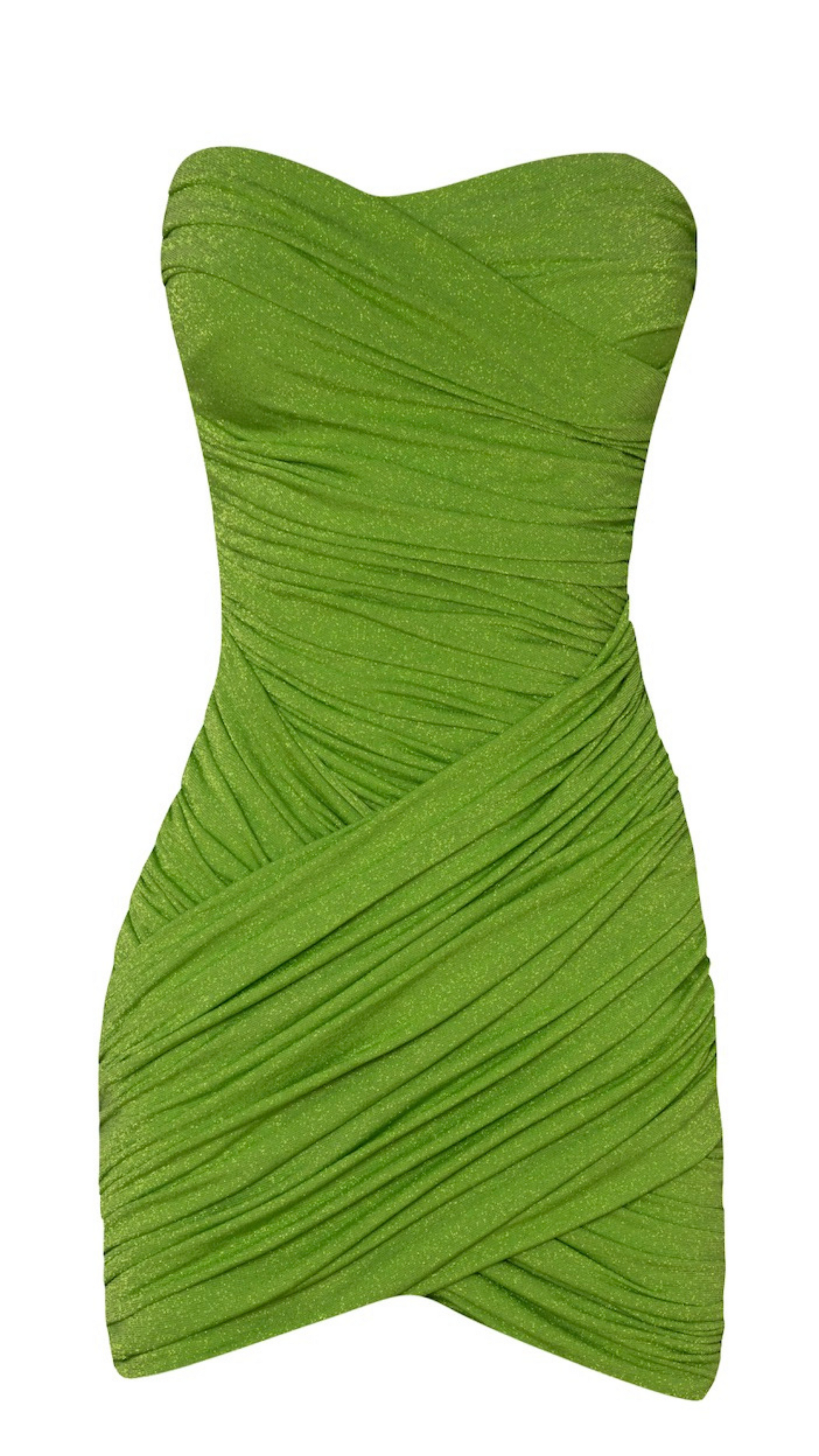 Introducing the "Irene Mini Dress" in Bahari - A strapless mini dress featuring elegant draped detailing, crafted from figure-hugging glossy fabric for a sleek and sophisticated look. Versatile enough to be dressed up or down for any occasion.