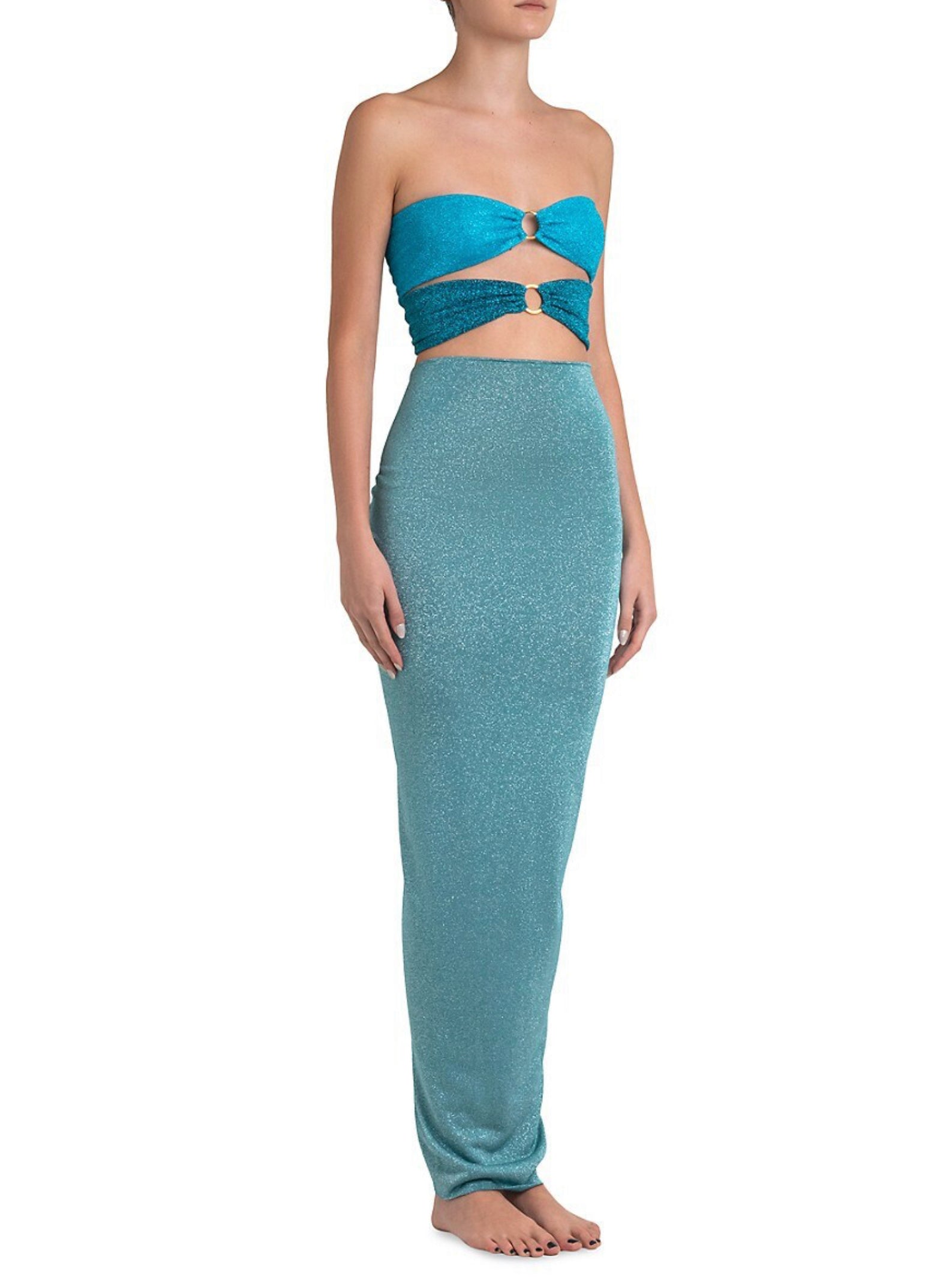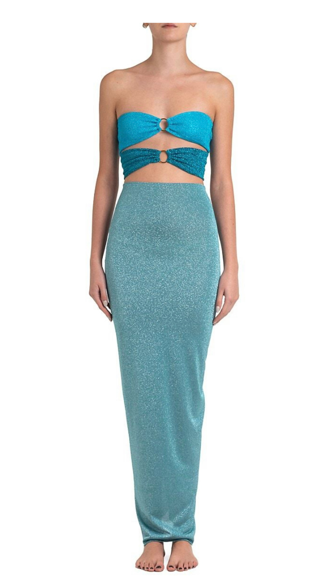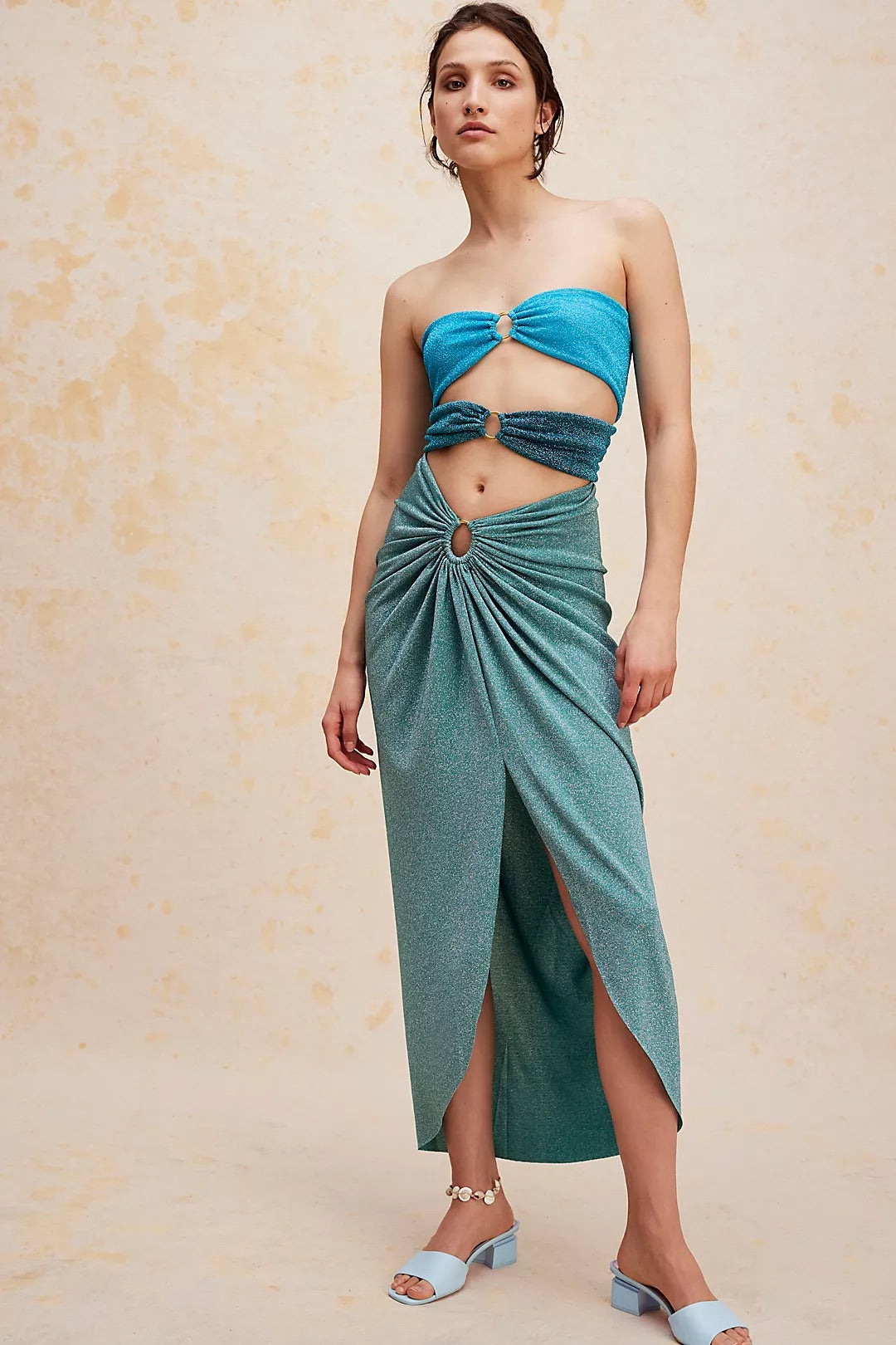 Isla maxi dress features a metallic texture with a sweetheart neckline, rings at the front and back and a deep slit skirt that offers wear options in the front or back.