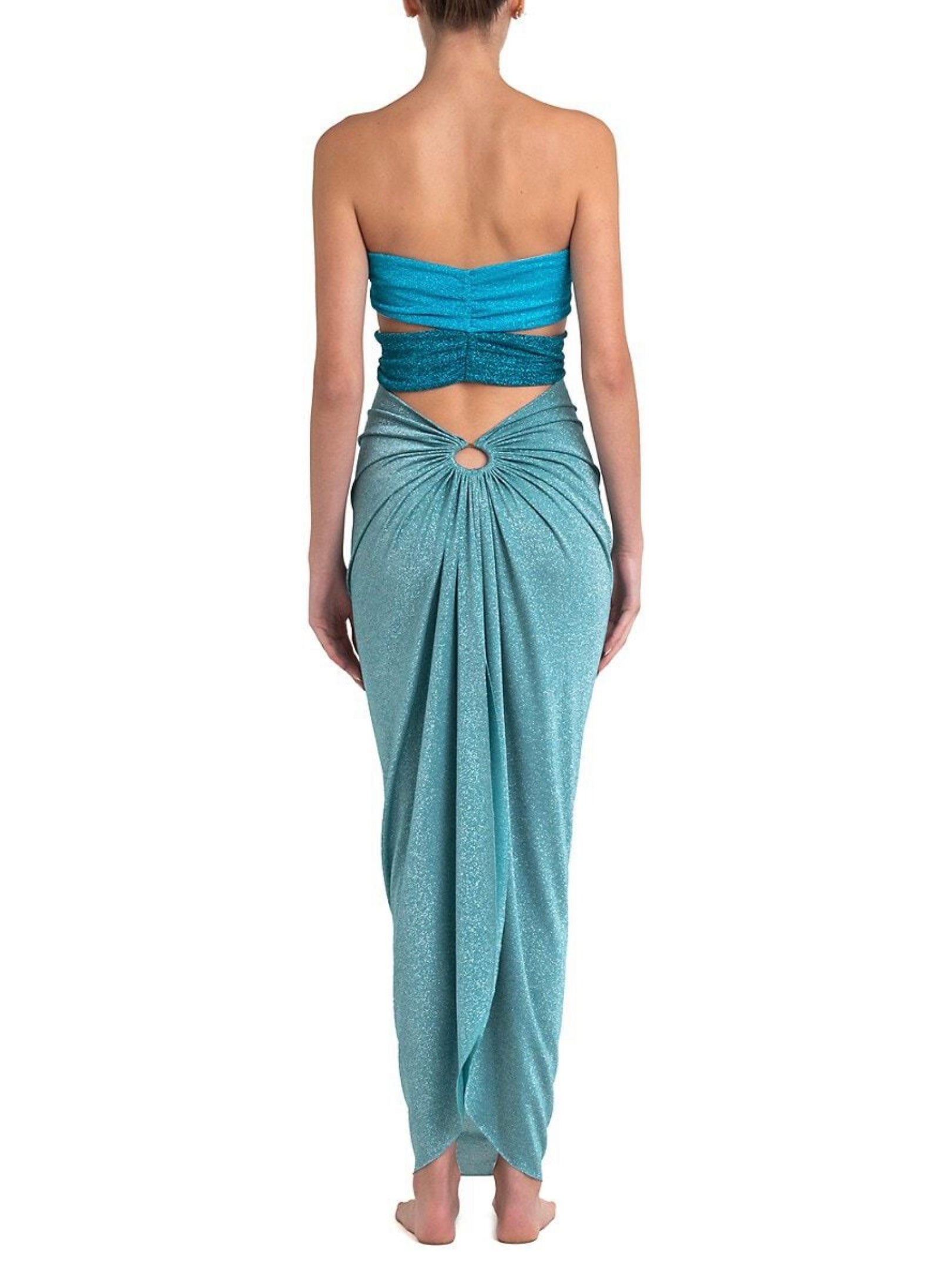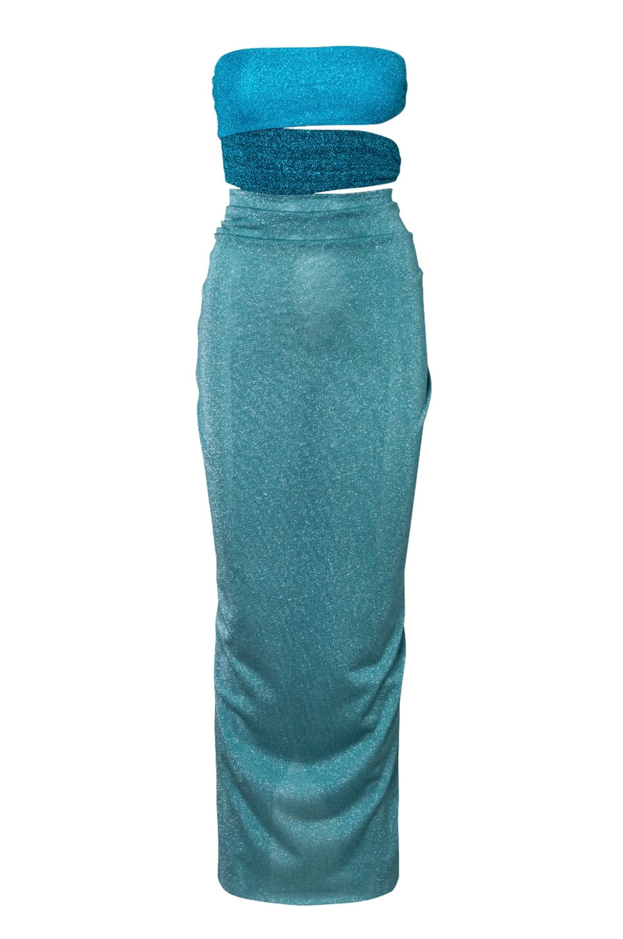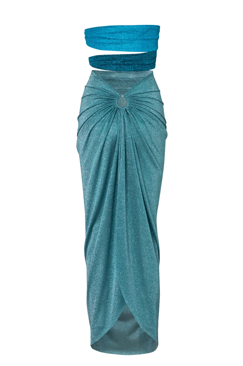 Isla maxi dress features a metallic texture with a sweetheart neckline, rings at the front and back and a deep slit skirt that offers wear options in the front or back.