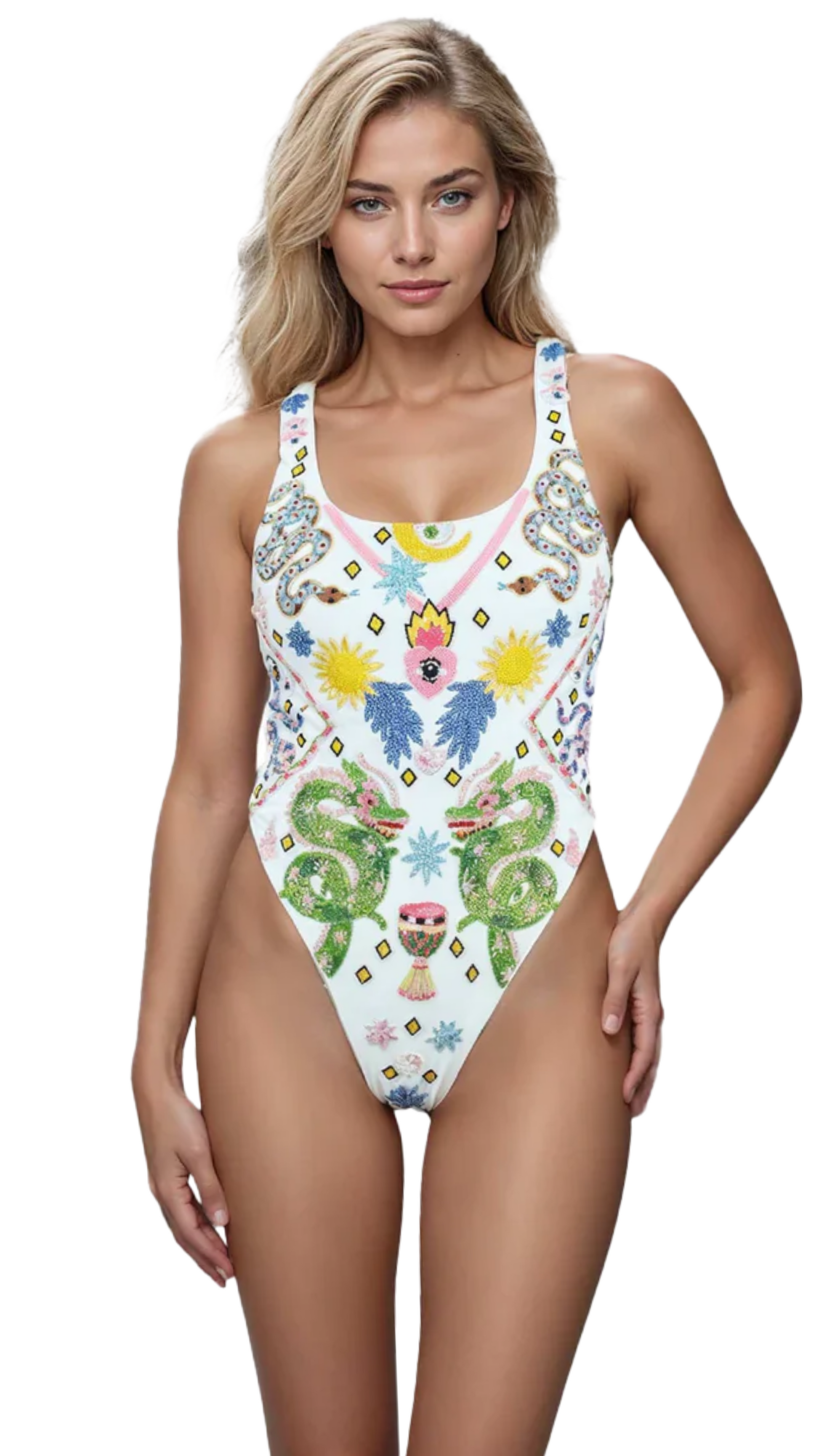 The Jamila Swimsuit is a new addition to our SS25 collection. This piece features hand-embroidered tropical elements on a White eco-friendly Italian lycra base.