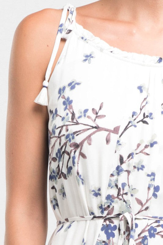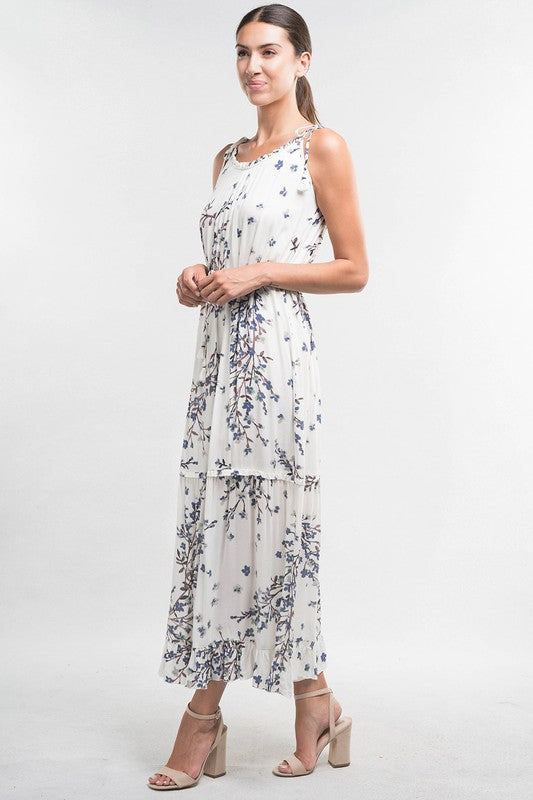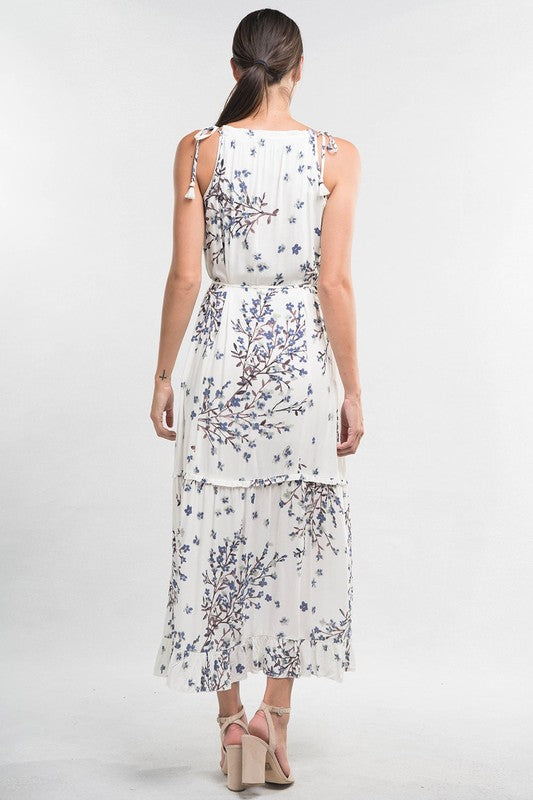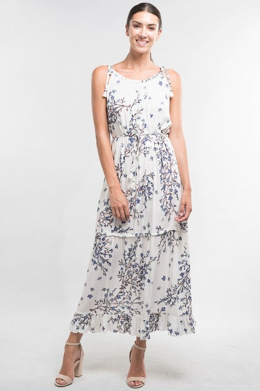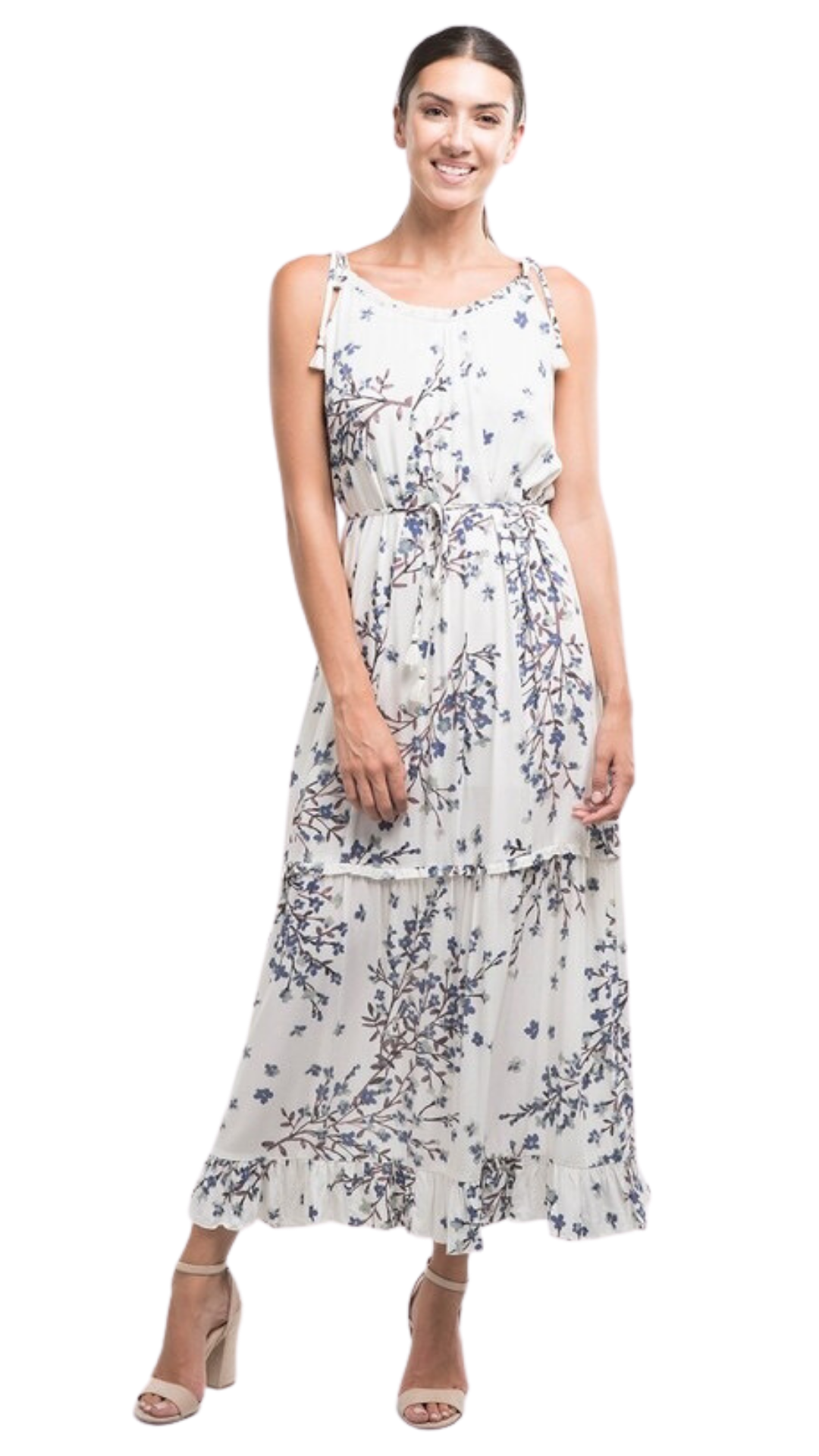 All over floral printed, dropped tiered maxi dress with self-belt and tie shoulder strap details.