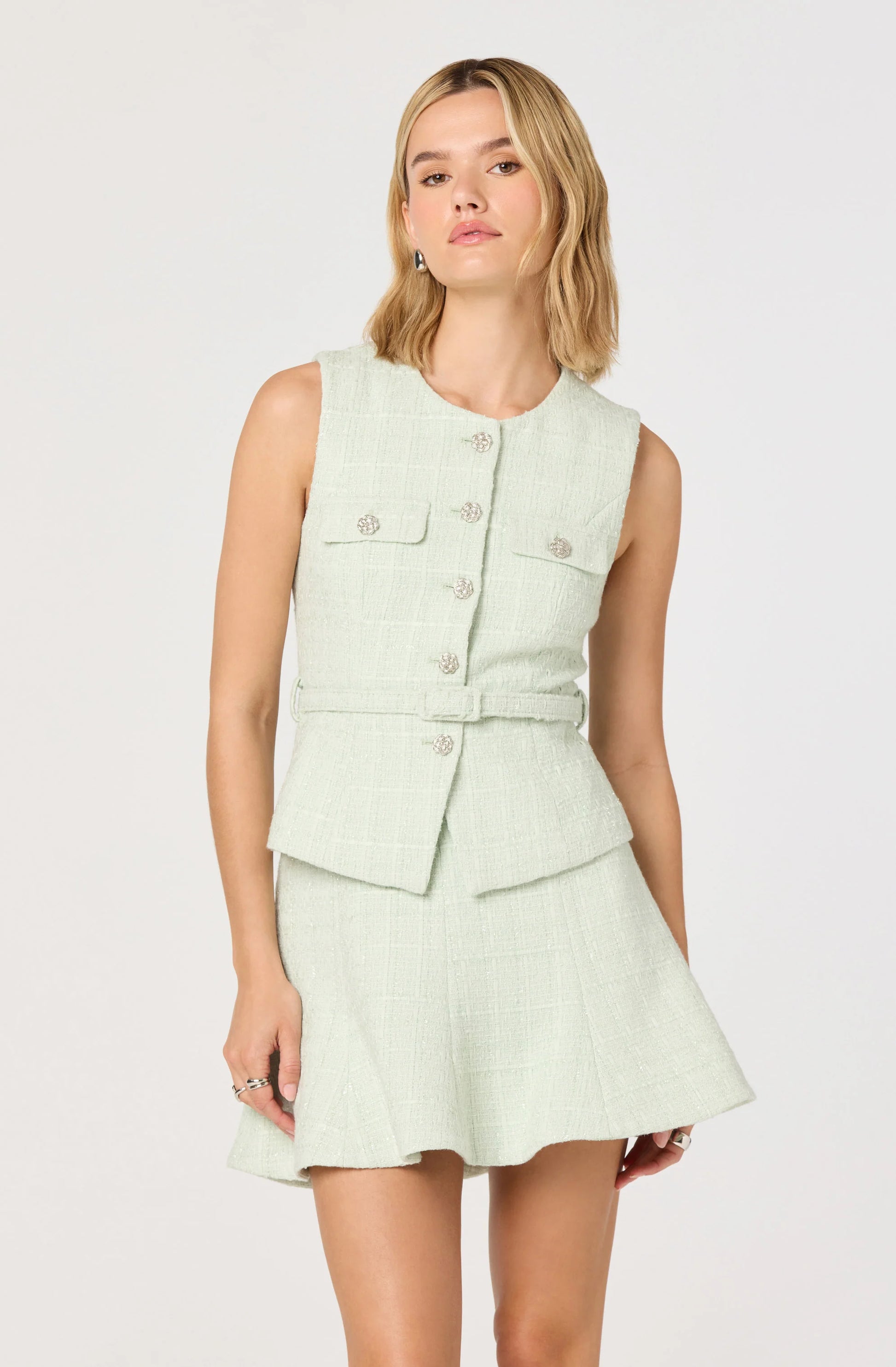 Structured and stylish, this floral button vest with a removeable belt pairs well with the matching skirt for a refined, going-out or office look.