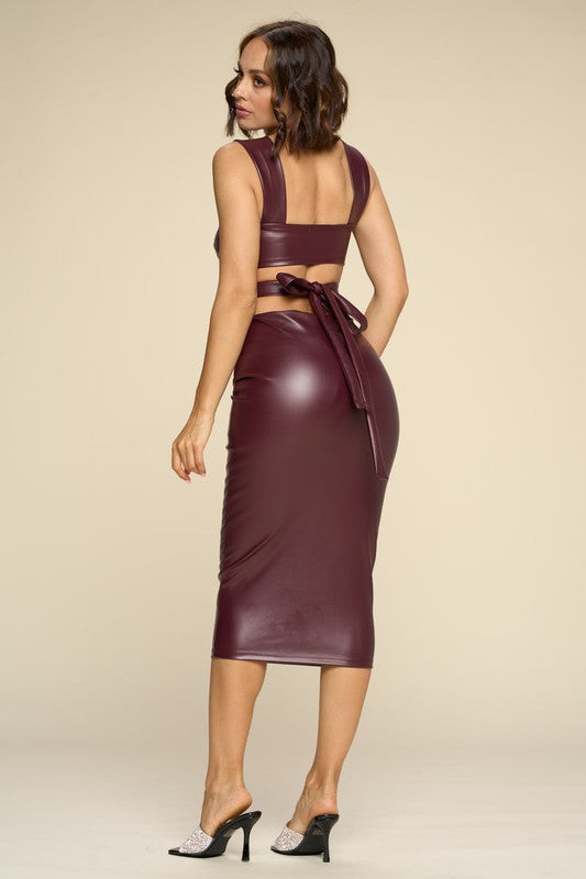 Make a statement with this one. This faux leather Vneck dress has a beautiful knot detail that is sure to get attention. Pair with gold accessories and a clear pair of heels and you're sure to be the talk of any event
