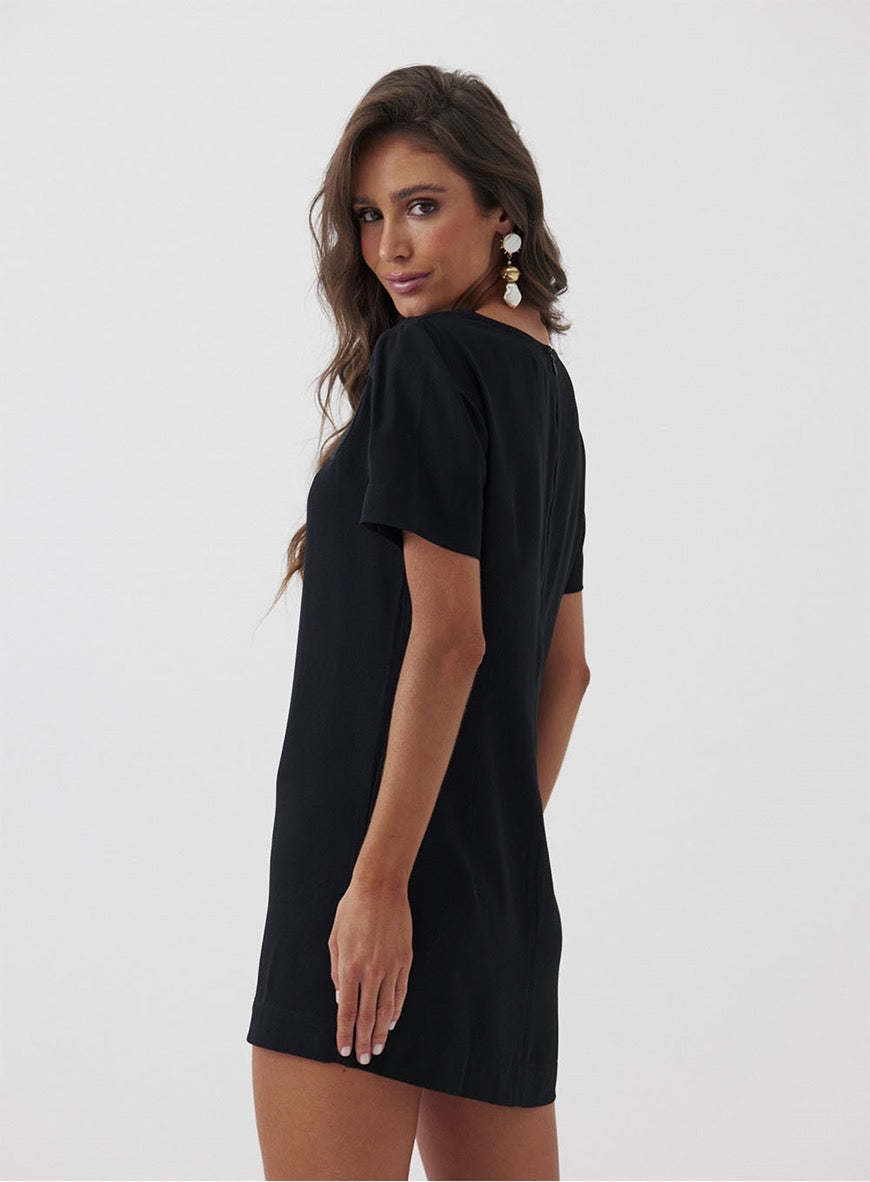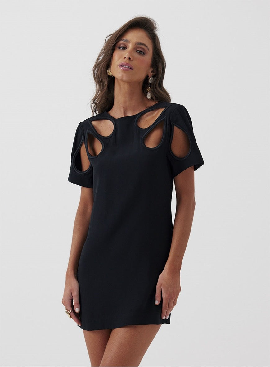 The Short Dress with Embroidered Cutouts Kim is a chic and sophisticated choice for women seeking a piece that exudes femininity, elegance, and sophistication. Its embroidered cutouts add a unique and striking element, making it a charming option for various events and special moments. The dress features a straight silhouette and comfy fit, with a boat neckline, short sleeves, cutout details on the front, an open back, concealed zipper closure, and a short length.