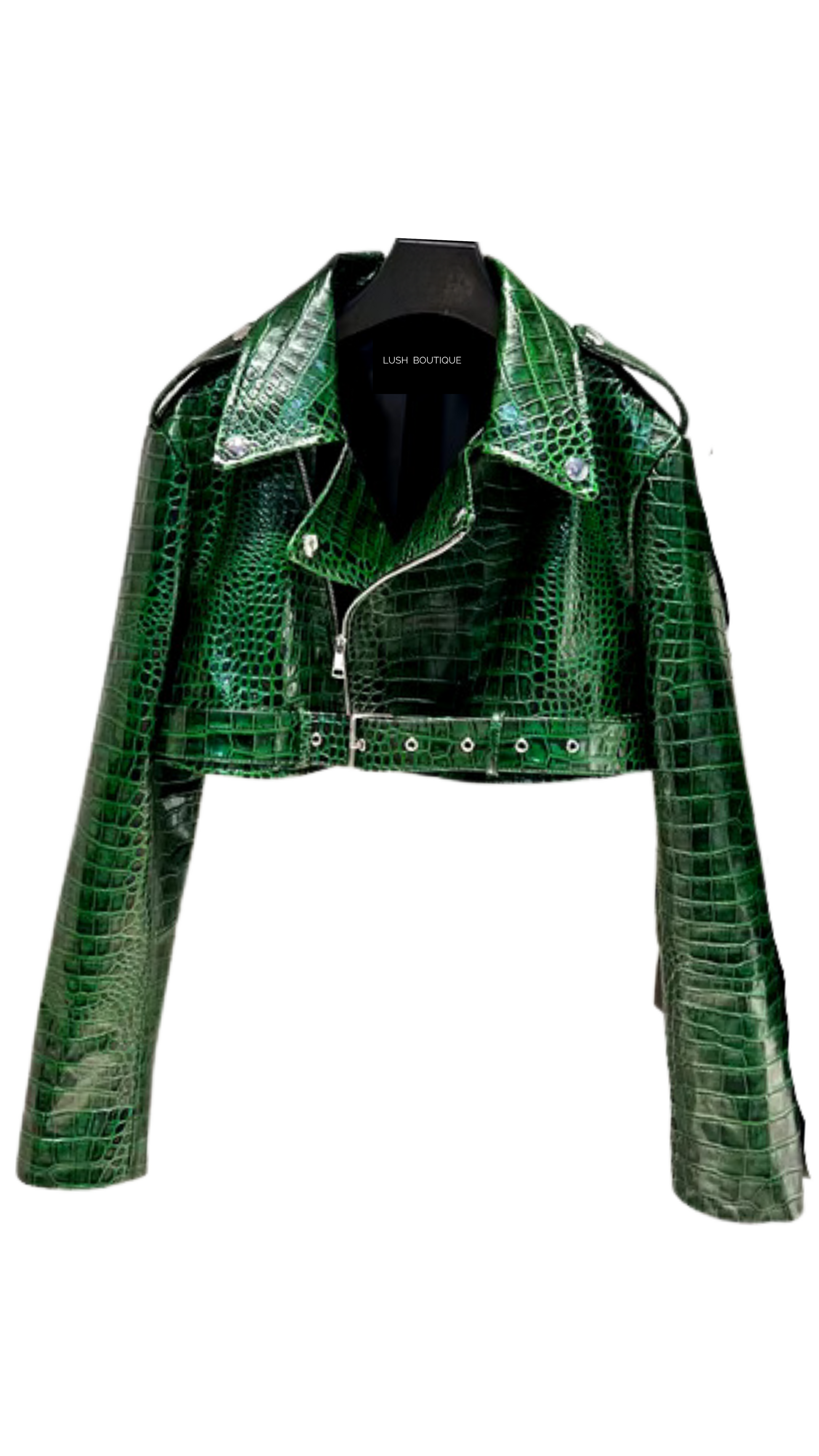 Our signature green croc leather jacket is crafted from genuine lambskin leather. Features an iconic slim straight and cropped cut, biker design, leather buttons fastening and leather belt for a defined waistline.