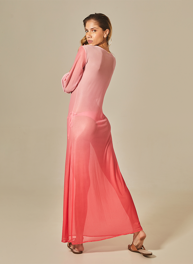 Achieve an understated yet sophisticated look with this Long Sixty Dress in Gradient Pink. Crafted from flowing tule, this dress features a luxurious gold buckle and a plunge neck, for maximum elegance. Create an eye-catching outfit and achieve the ultimate in luxury.