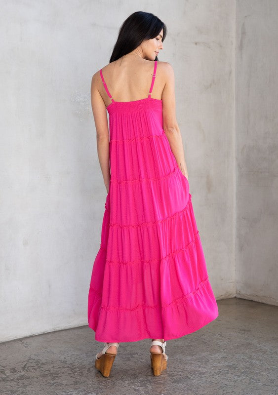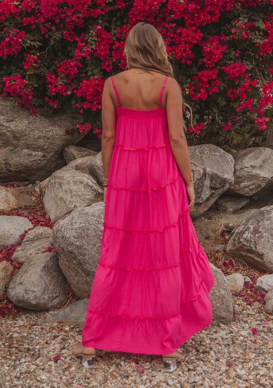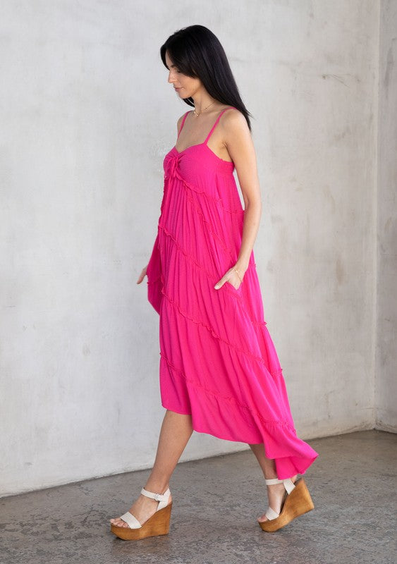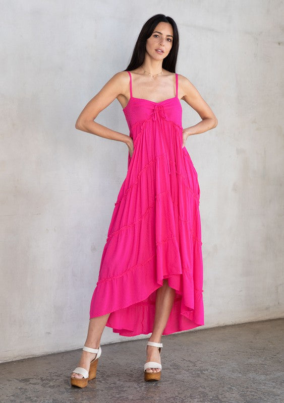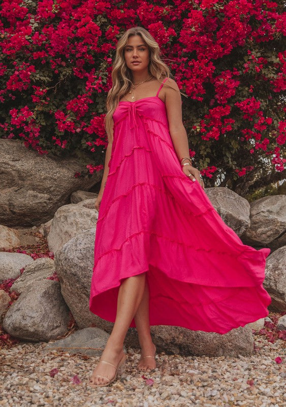 This ultra-flowy maxi dress was made for warm days! The breezy silhouette is elevated with effortlessly chic details throughout. Featuring a pretty sweetheart neckline with an adjustable tie, a flattering empire waist with a tiered skirt, and whimsical ruffled details throughout. Perfect for the beach or wherever warm weather takes you.