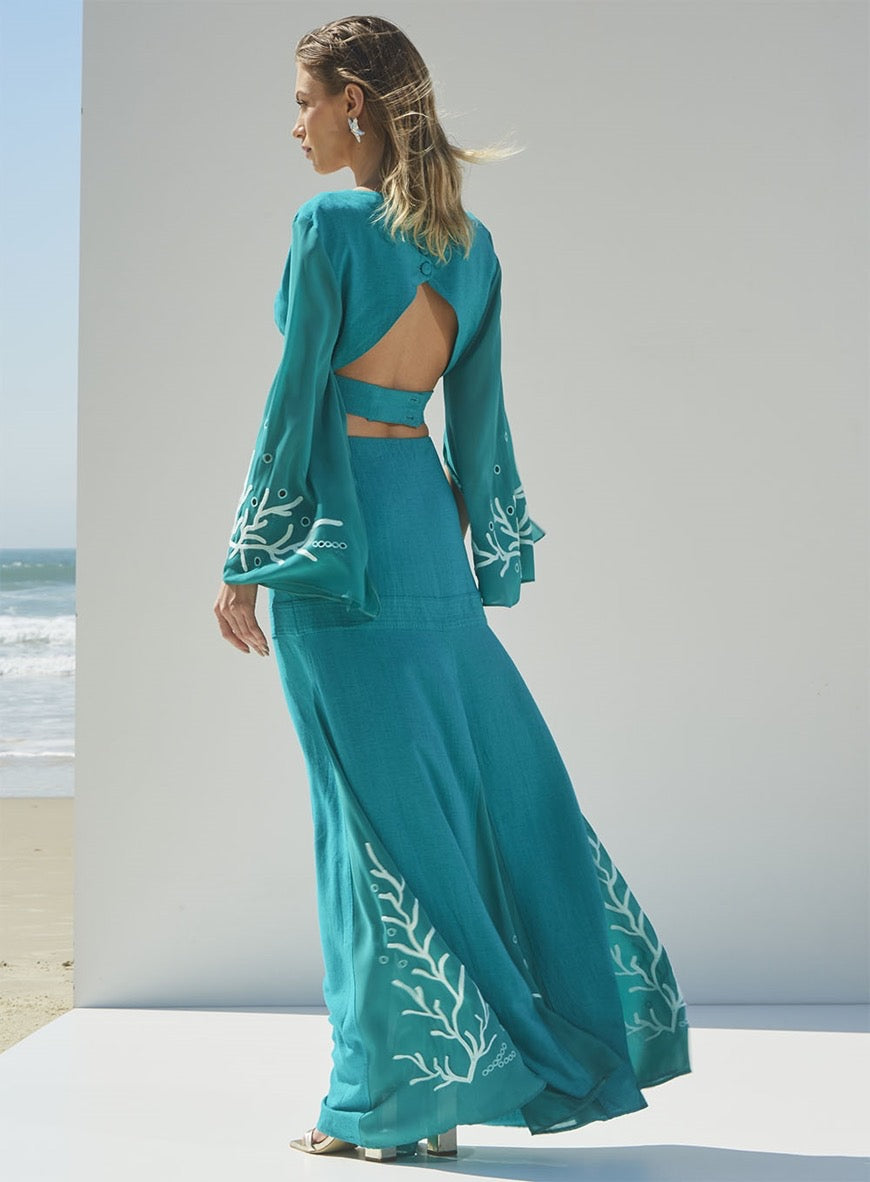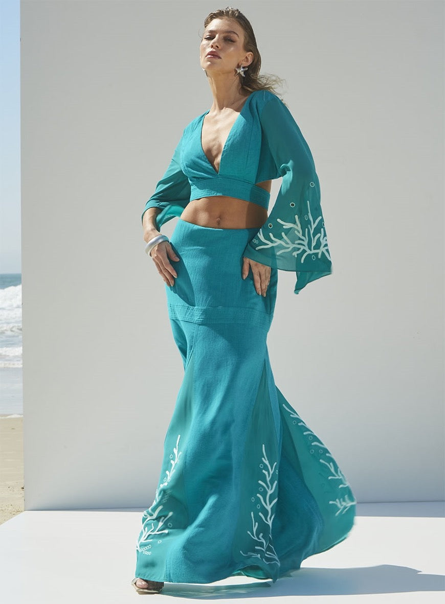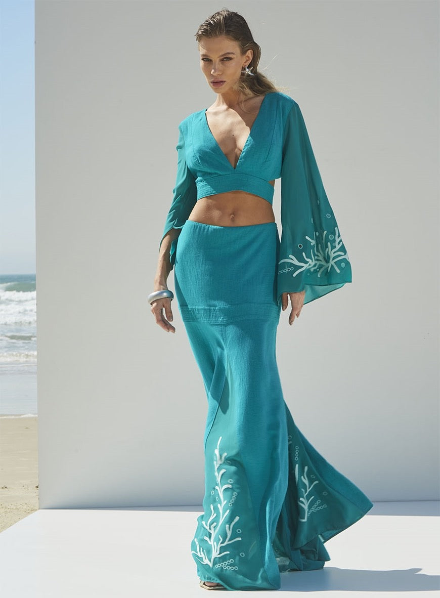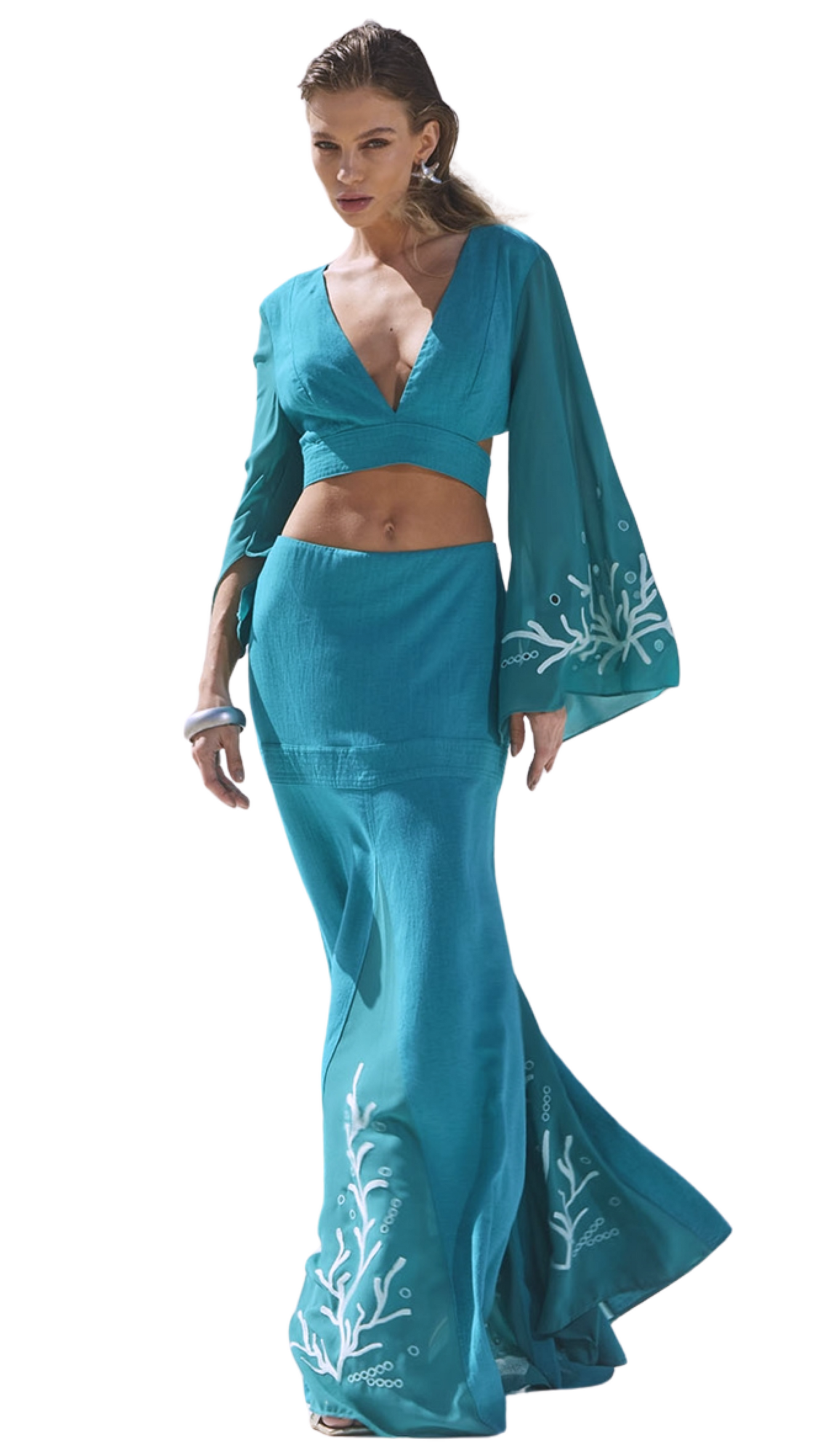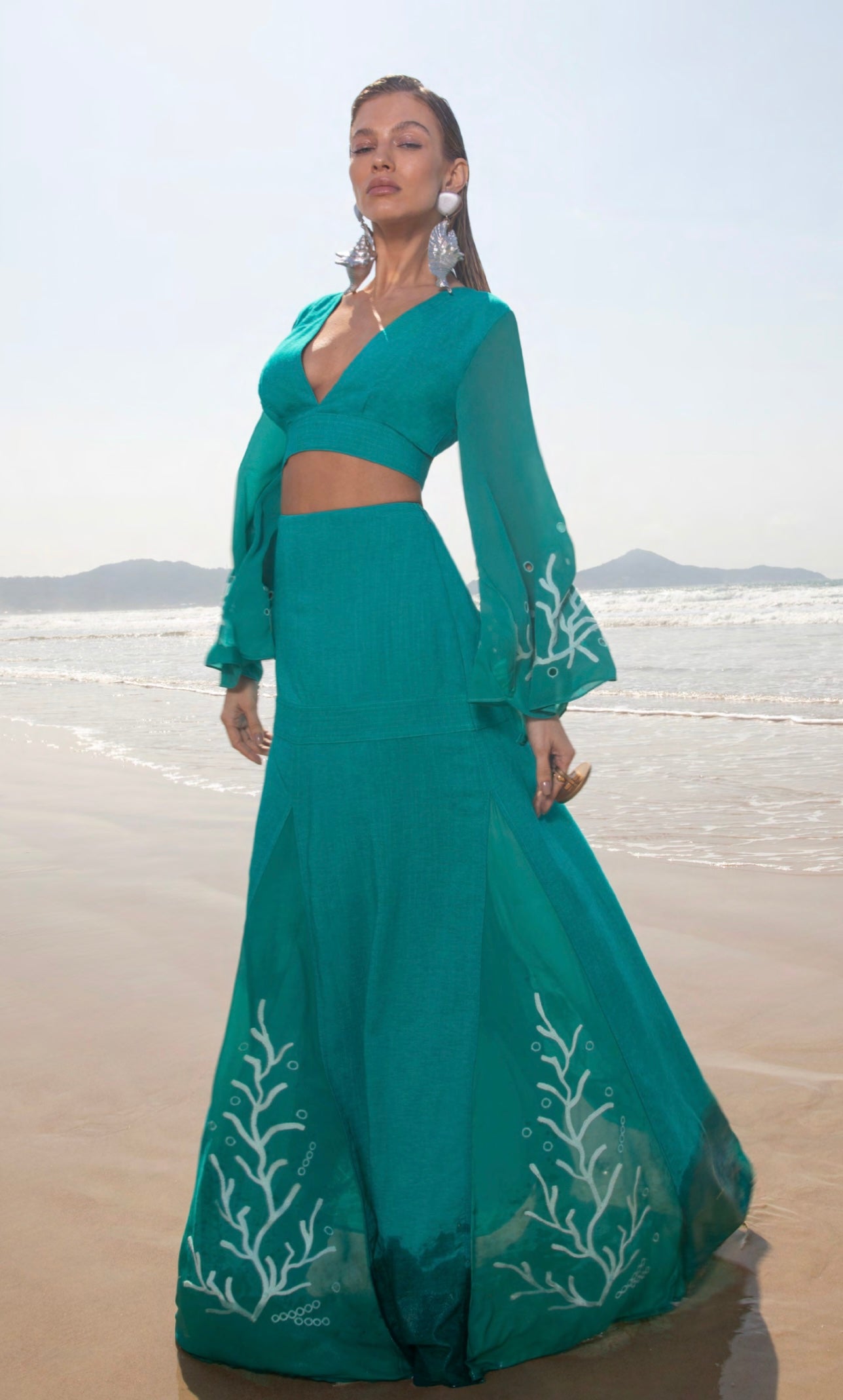 The flowing long skirt complements the set with its elegance and lightness. Made of linen, it provides a smooth and comfortable fit, ensuring graceful movement with every step. The combination of the cropped blouse with the long skirt creates a harmonious and refined look, perfect for formal events or special dinners.