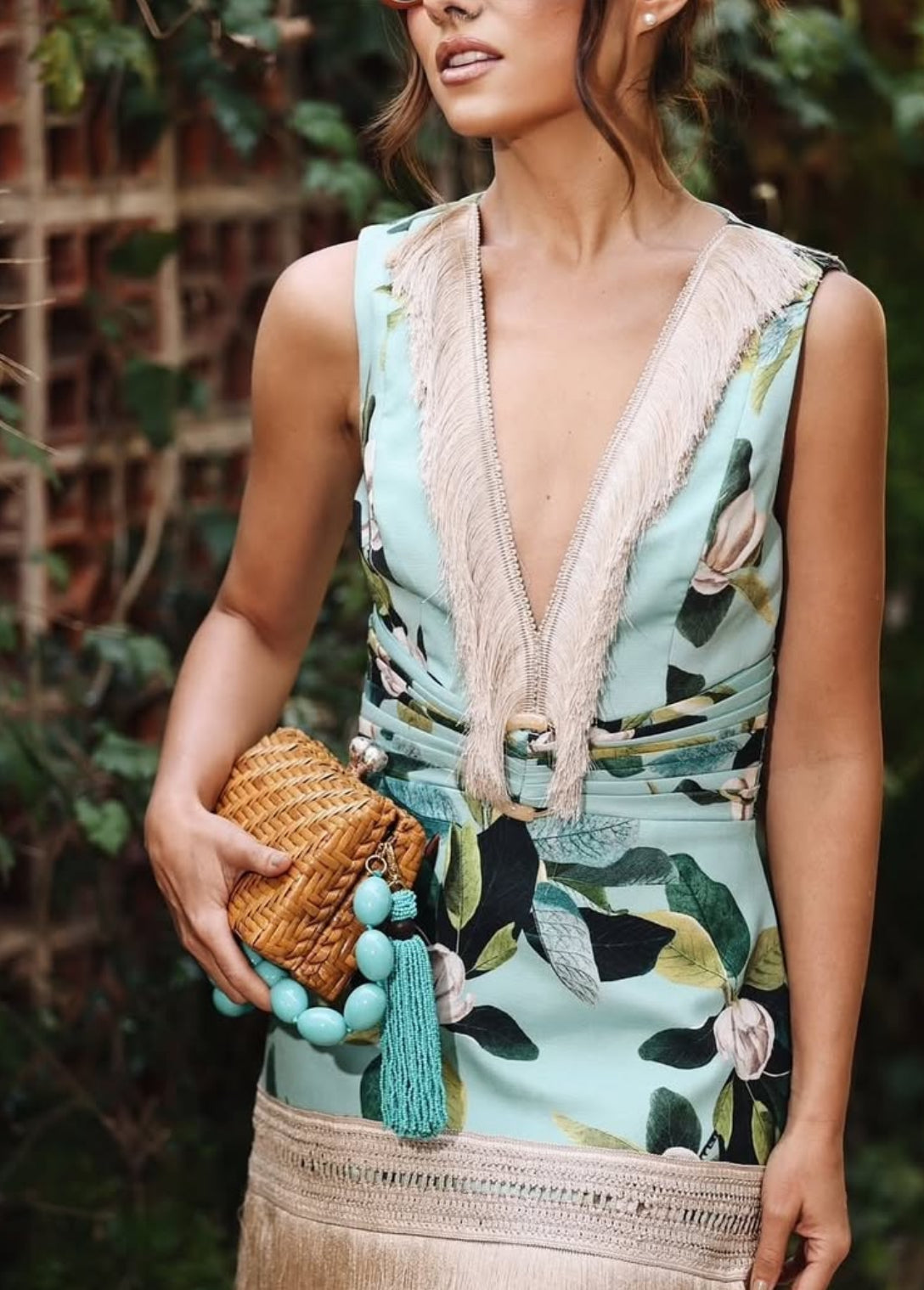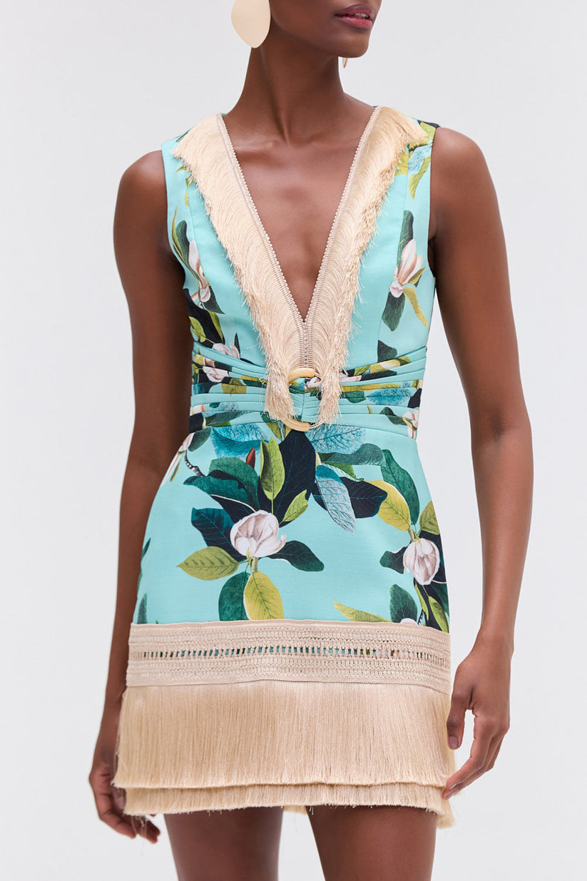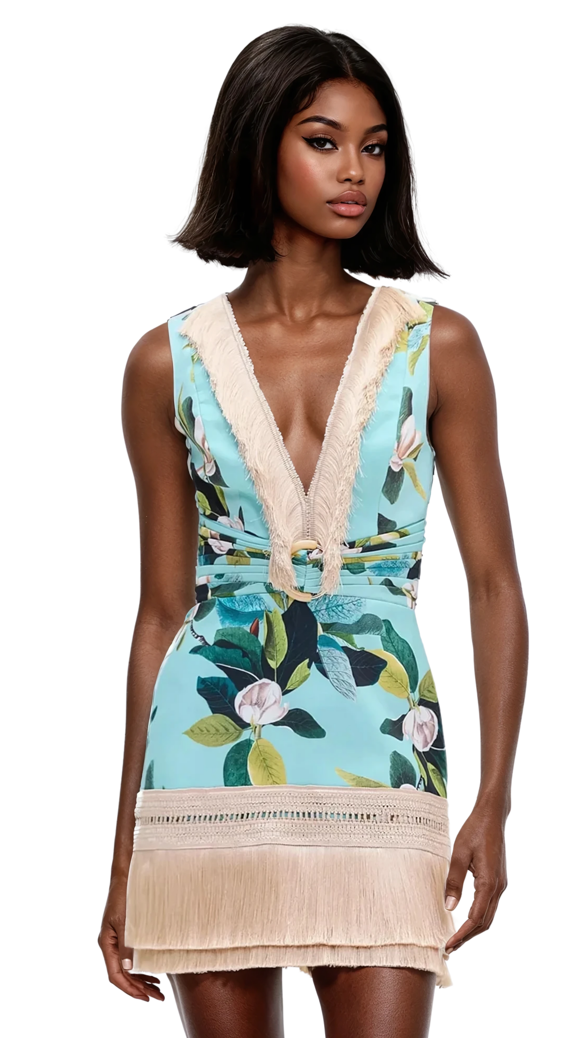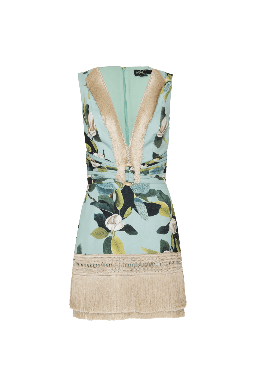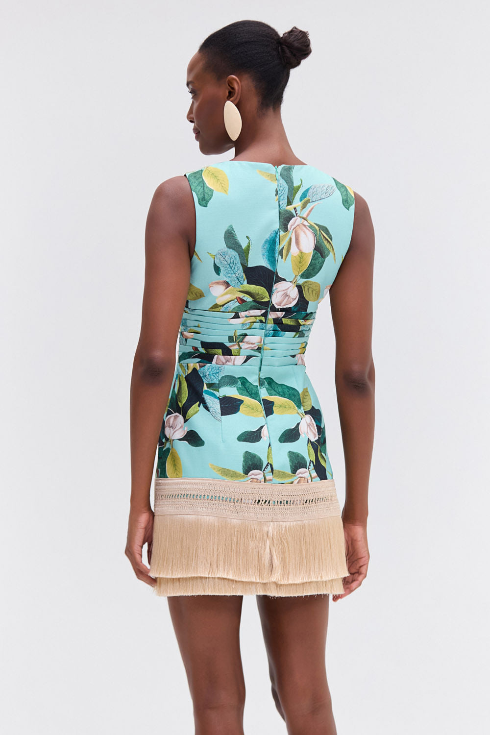 Short sleeveless dress made in linen texture with lining, has an exclusive print, "v" neckline with fringe application, yoke with pleats and marble belt loop, application of interfacing and fringes on the hem and closure with invisible zipper on the back.