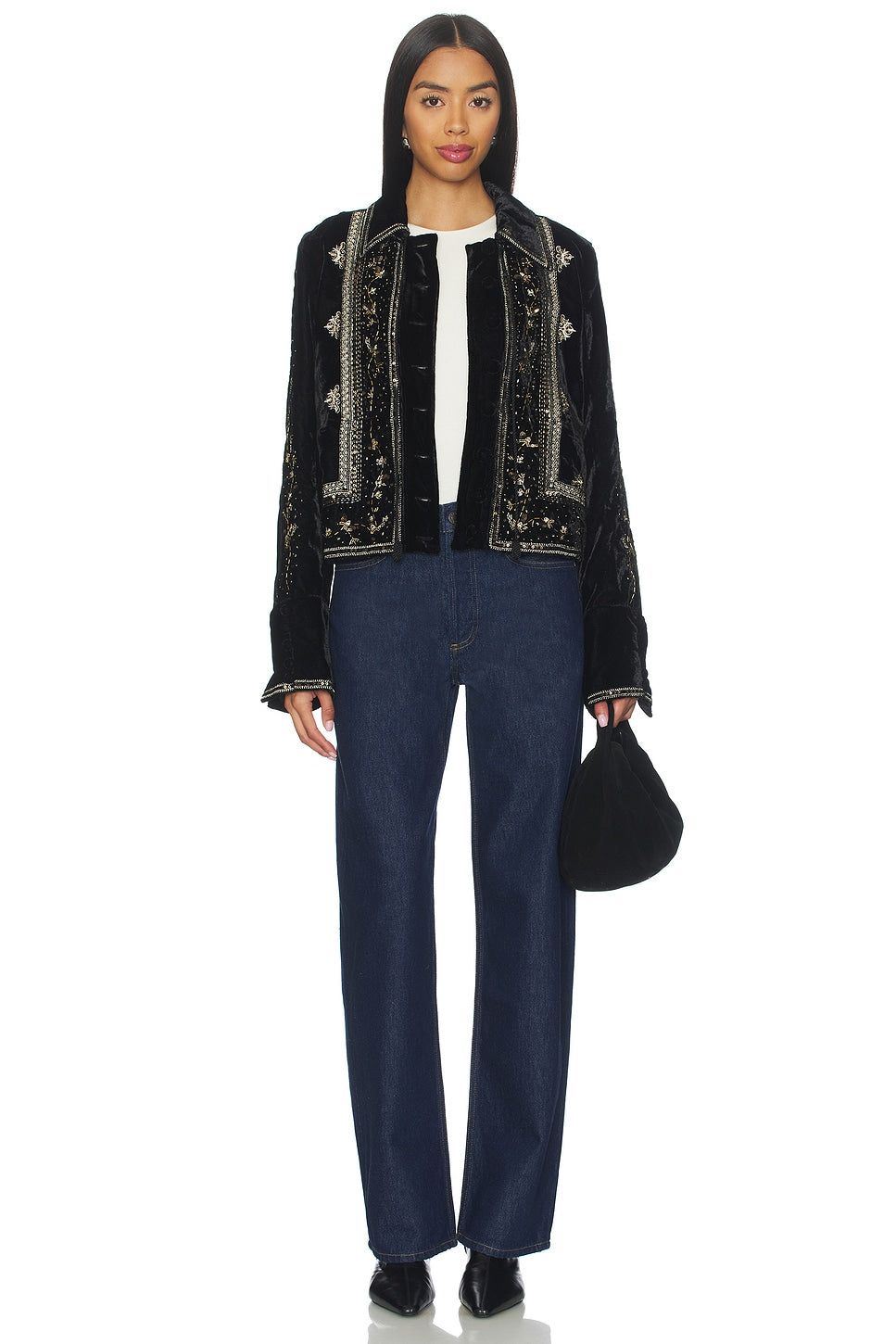 Ethereal vibes are within reach; this enchanting jacket features dazzling embellishments, luxe velvety fabrication, and a subtle cropped silhouette.