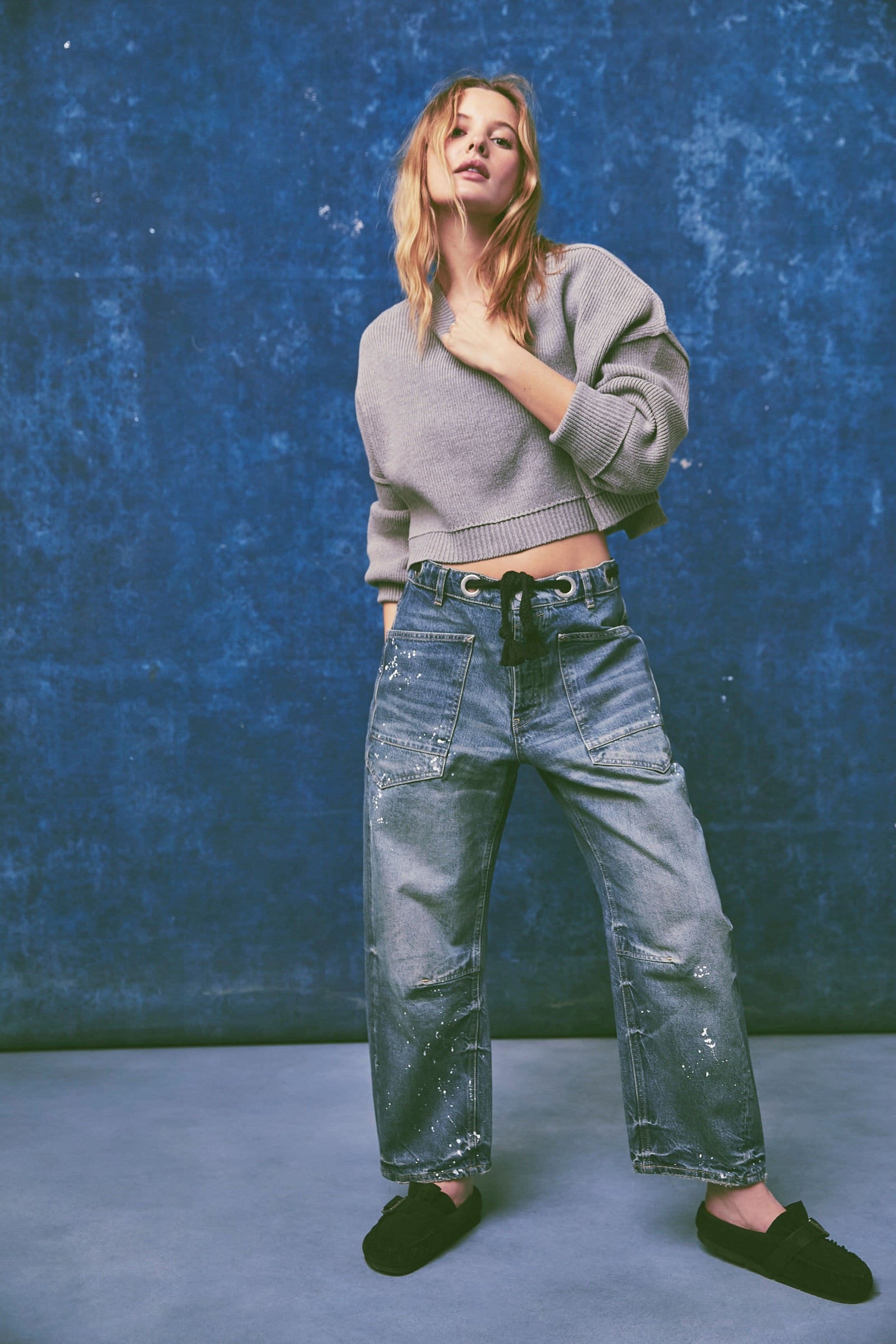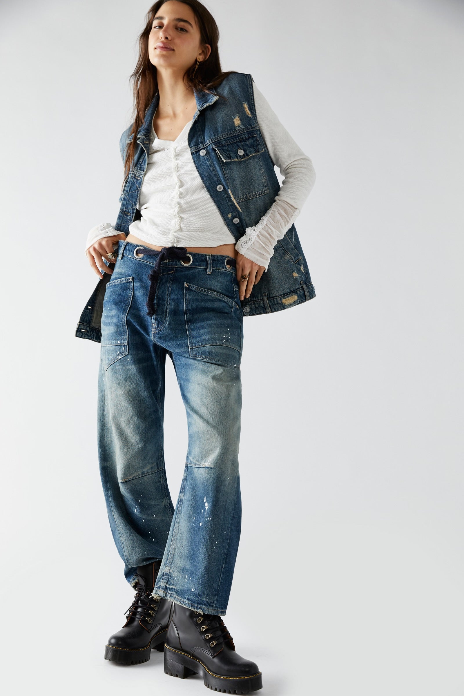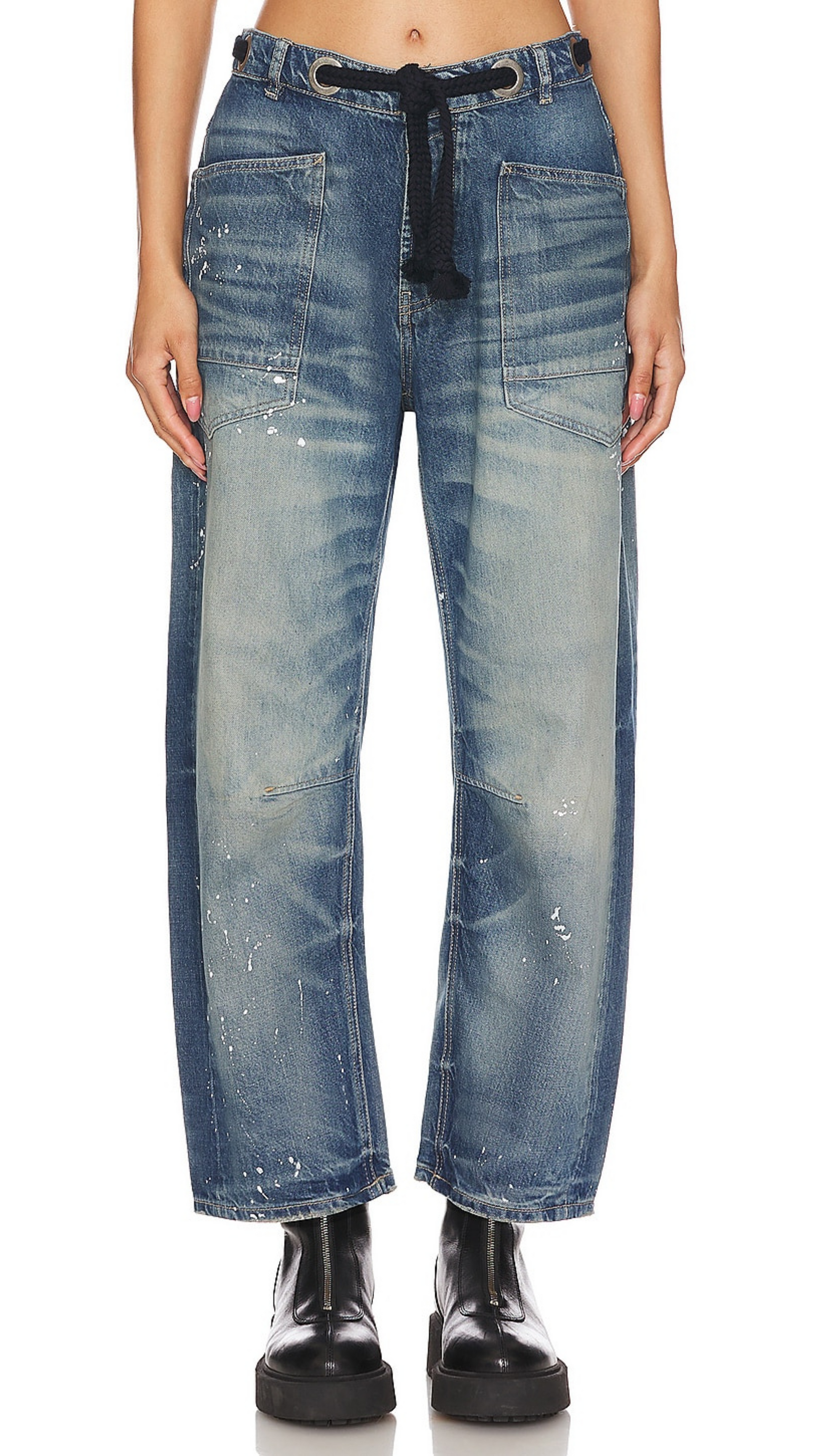Features: Distressed detailing throughout, paint splatter features, oversized patch pockets, contrast drawstring waist, pull-on style