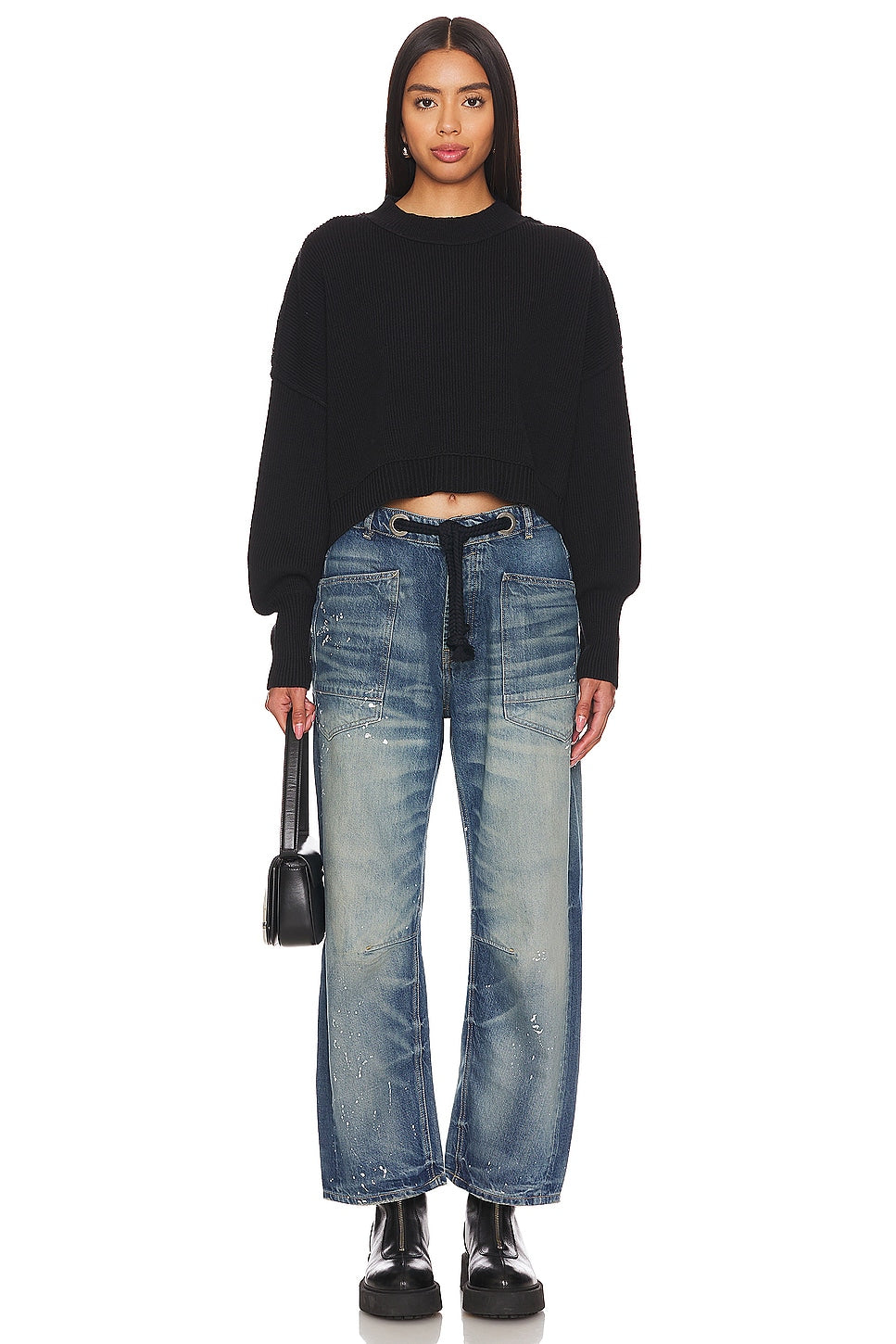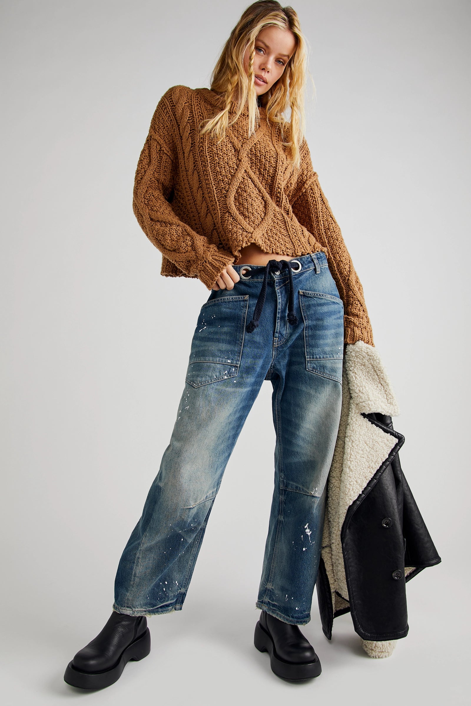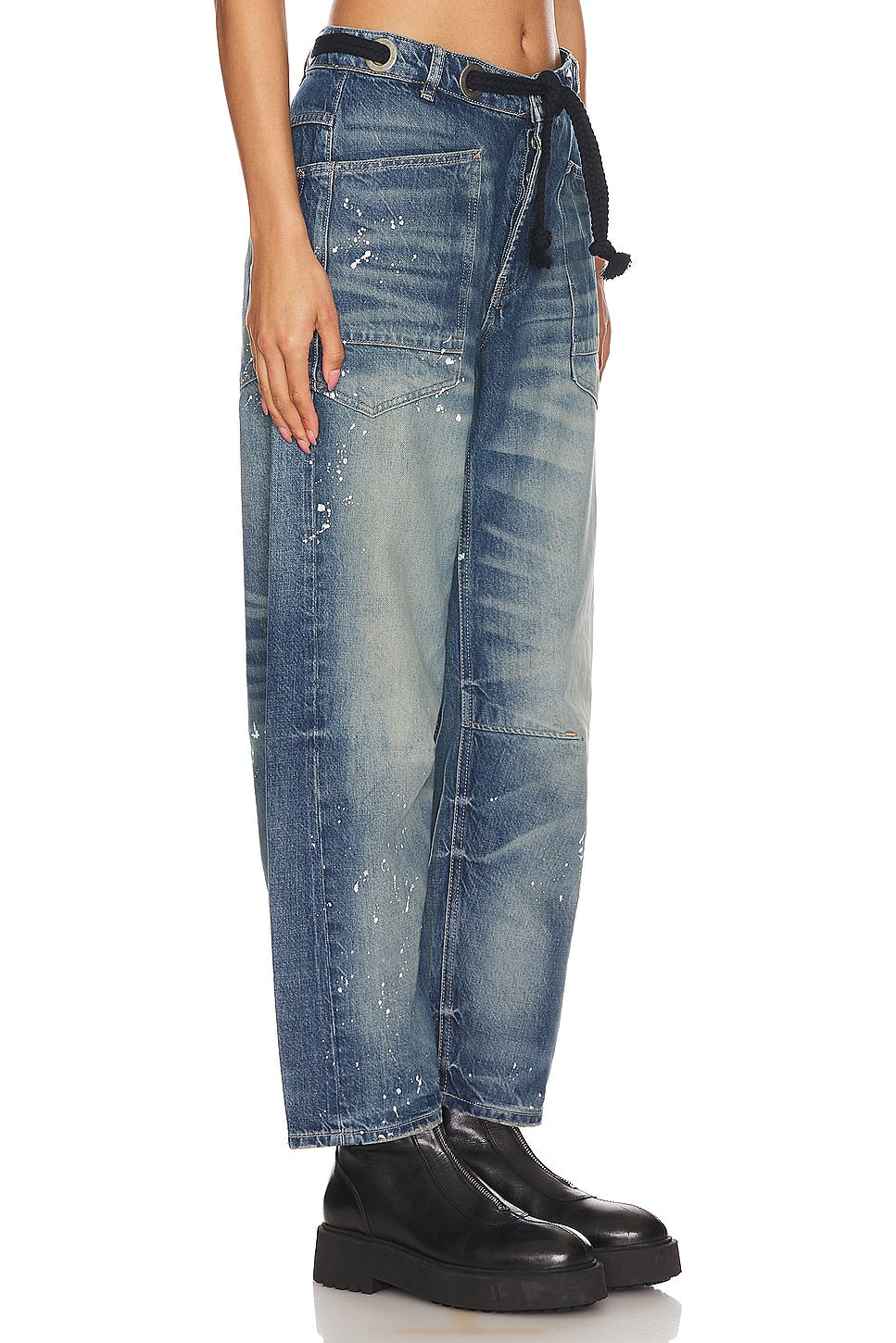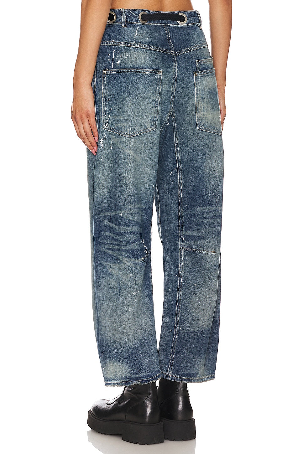 Features: Distressed detailing throughout, paint splatter features, oversized patch pockets, contrast drawstring waist, pull-on style