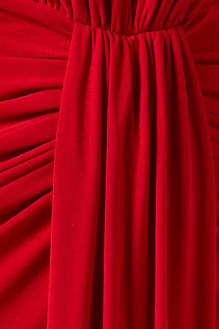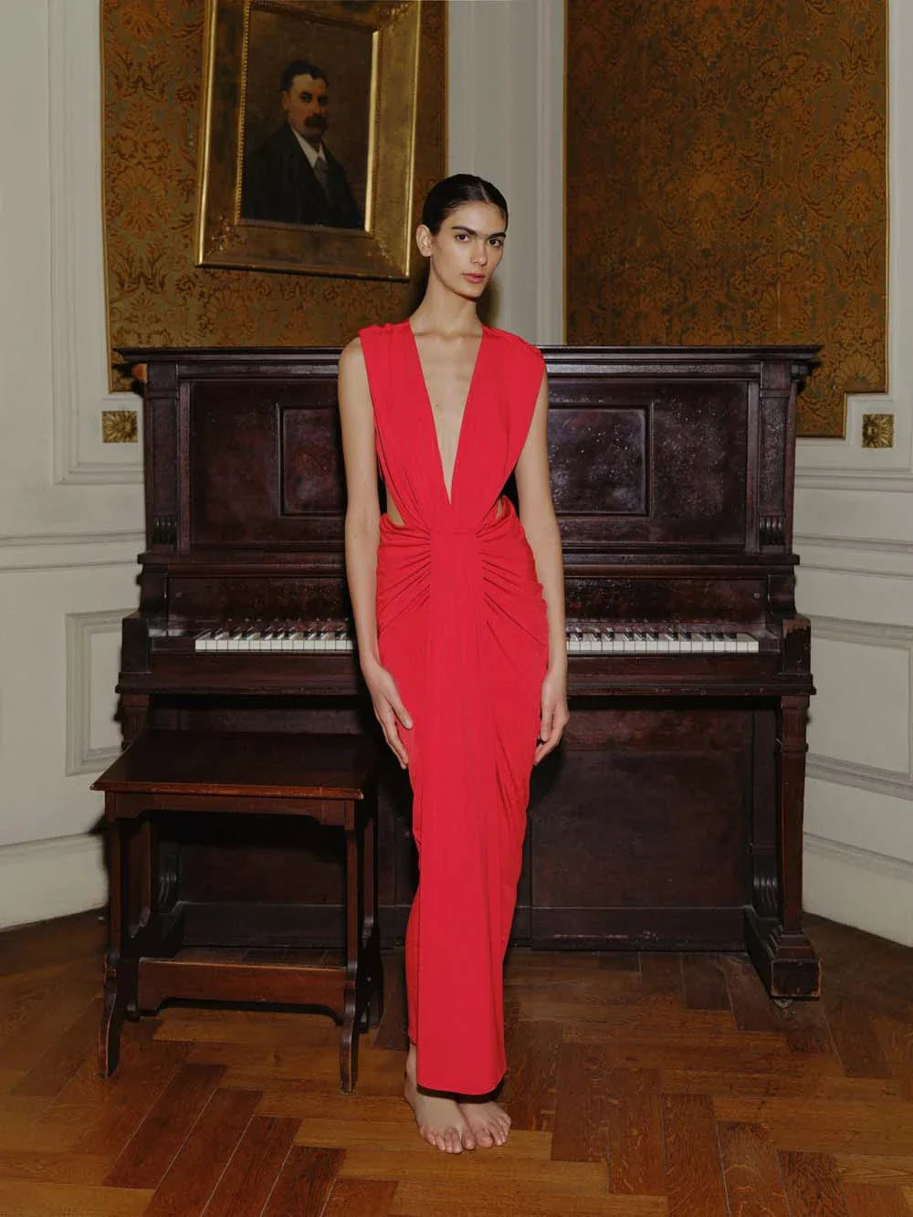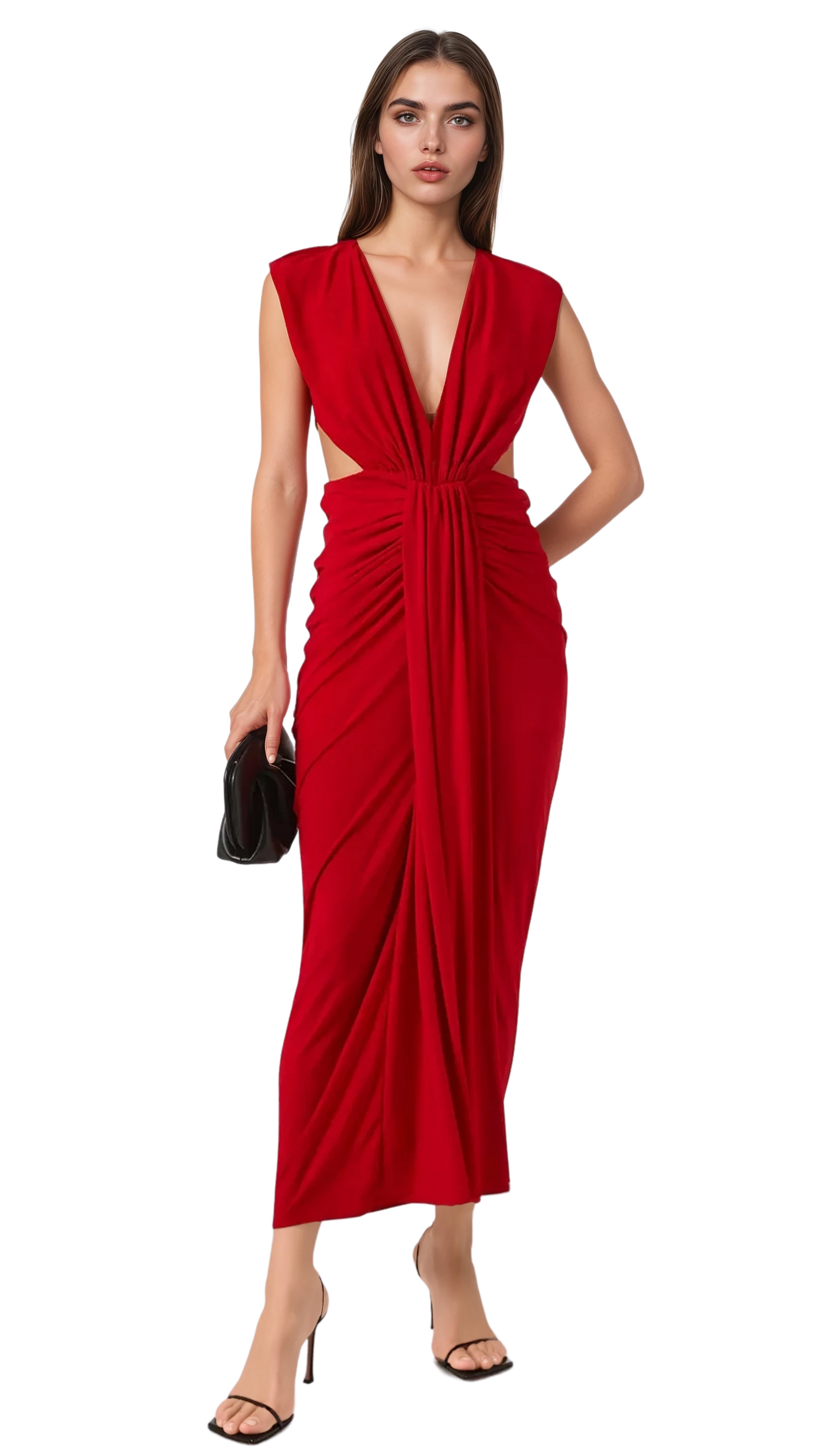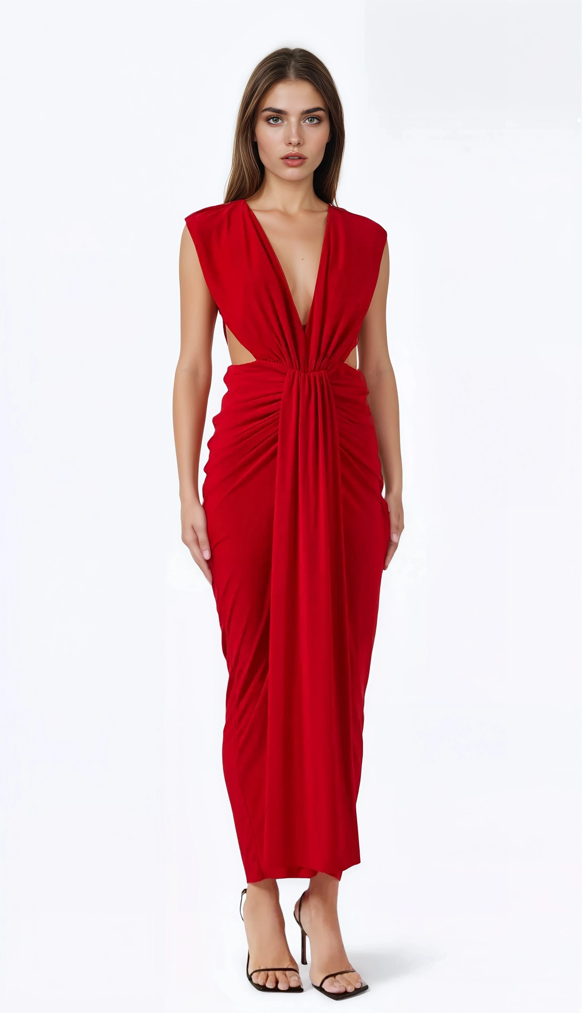 Introducing the "Nia Maxi Dress" in Pear – a maxi dress with a deep V-neckline, open back, and side cutouts. Designed with a cascading detail, ruched accents, and a front slit for fluid movement. Partially lined for a lightweight feel.