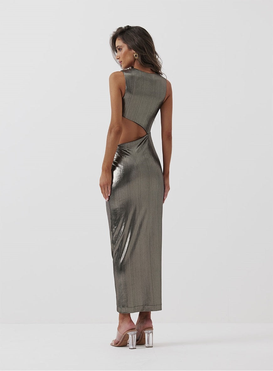 The Metallic Cutout Dress Nina is a stunning and modern piece, perfect for festive occasions and evening events. The metallic fabric brings a unique and sophisticated shine to the dress, which is sure to turn heads and garner compliments wherever you go. Feel confident in this bold and stylish piece.The dress features a straight silhouette and slim fit, with a V-neckline and wide straps, a half-moon metallic detail, cutout details, and a midi length.