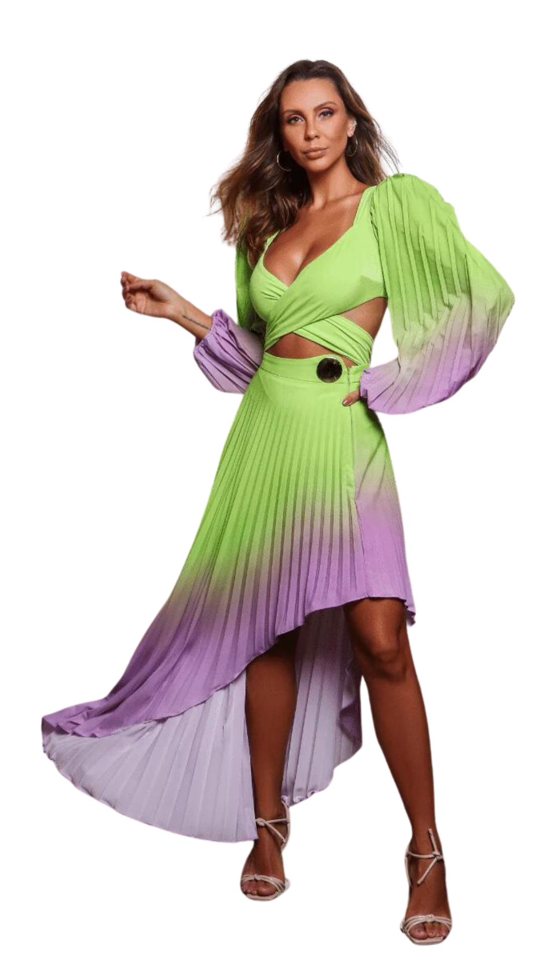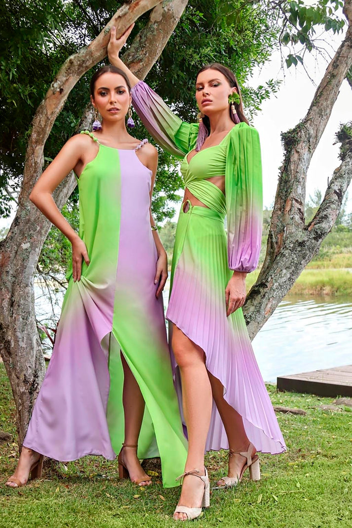 The color gradient in vivid tones prints the pleated skirt. Compose modern and sophisticated productions that elevate the look with glamour! Ideal for resorts and cruises.