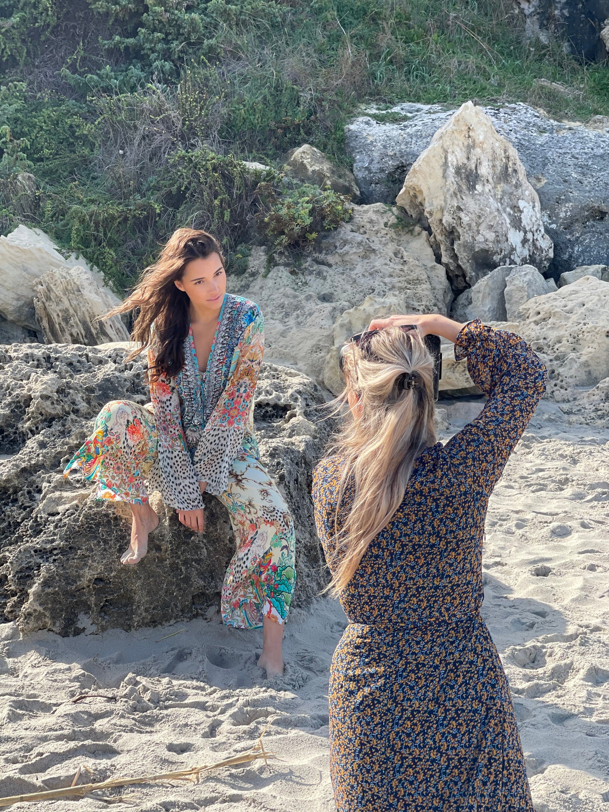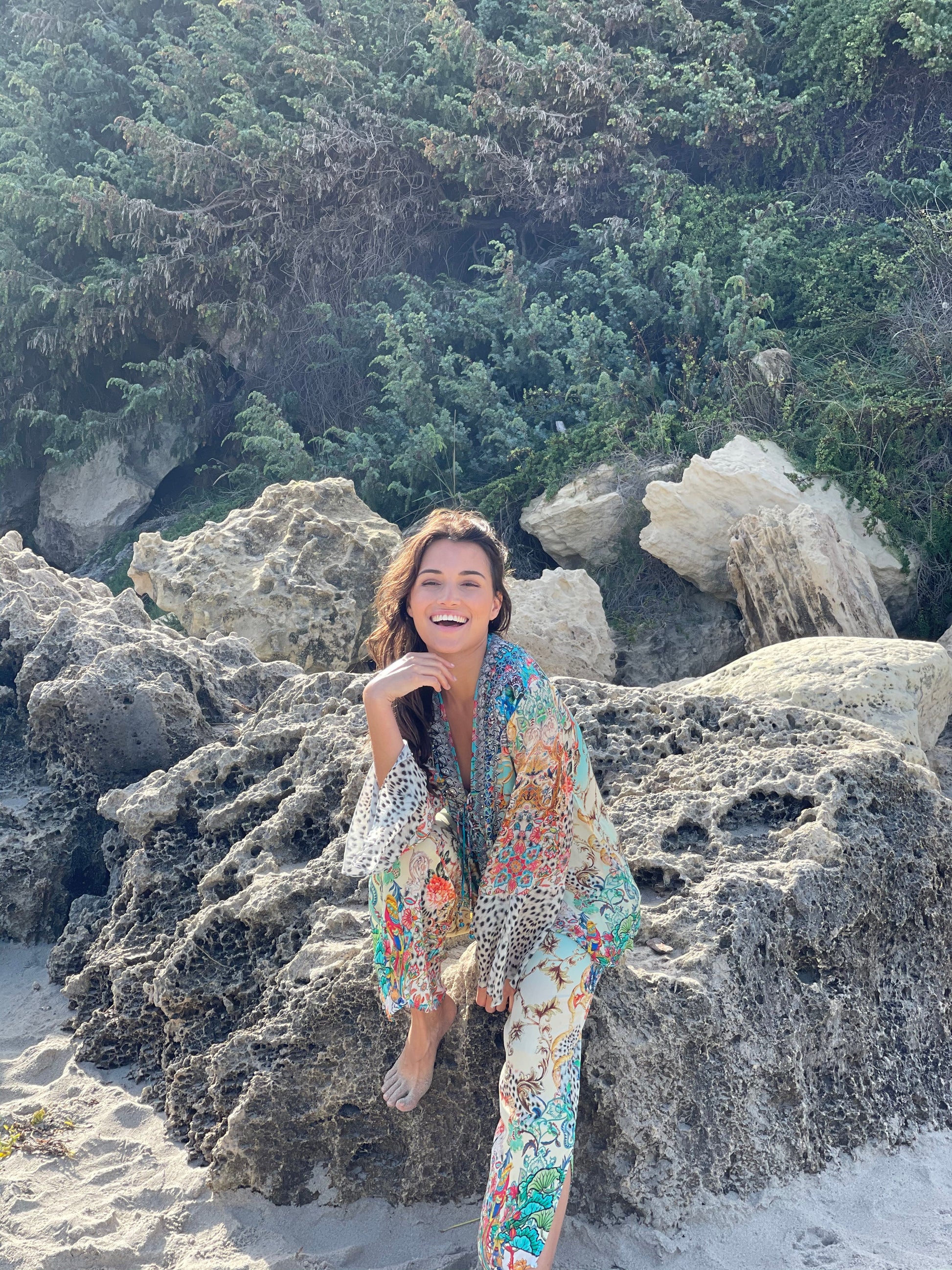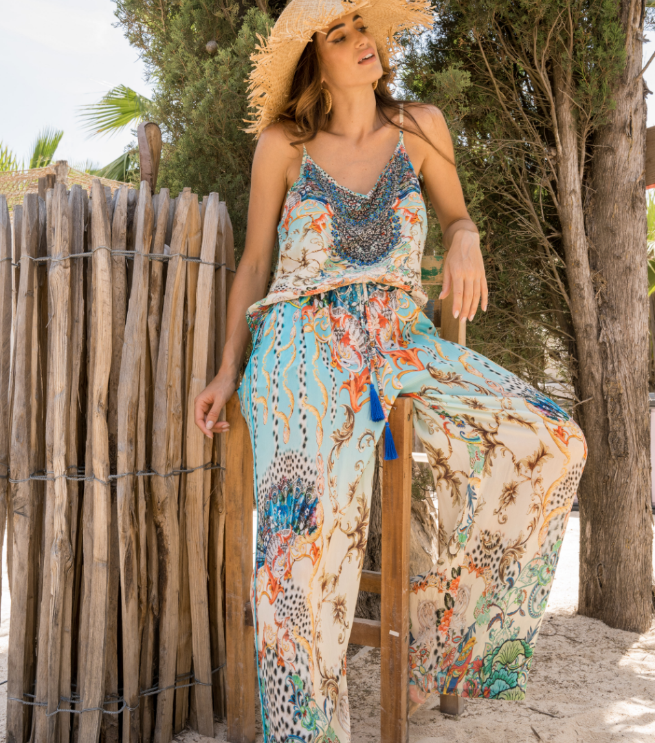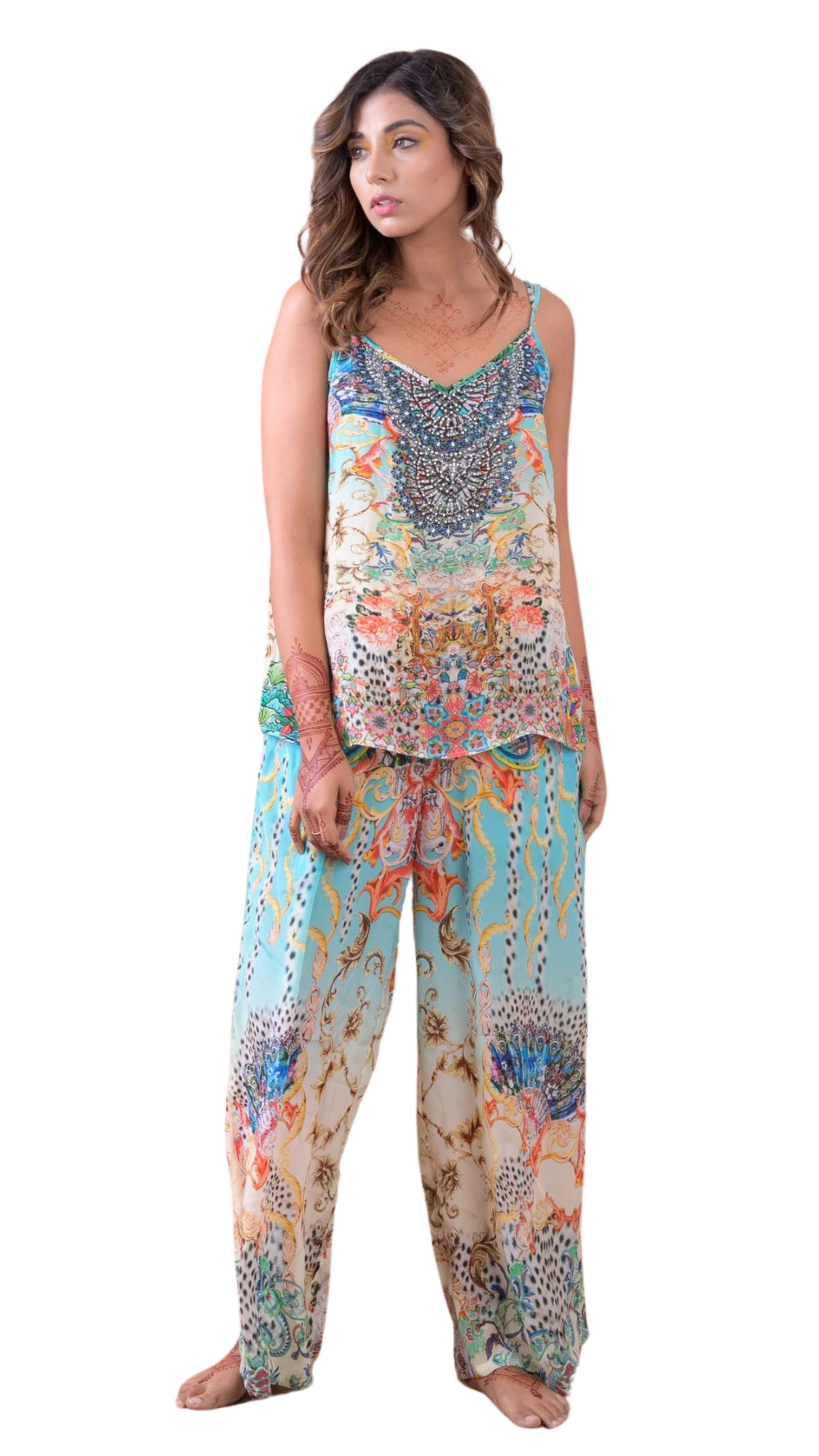 The pants in the image are wide-legged and feature a vibrant, intricate print. The pattern includes elements such as florals, paisley, and possibly animal motifs, with a mix of bright and pastel colors including shades of blue, orange, and green. They are lightweight, suitable for warm weather, and have a relaxed, flowing fit. Additionally, the pants have a drawstring or tie at the waist, which is accented with tassels for added detail.
