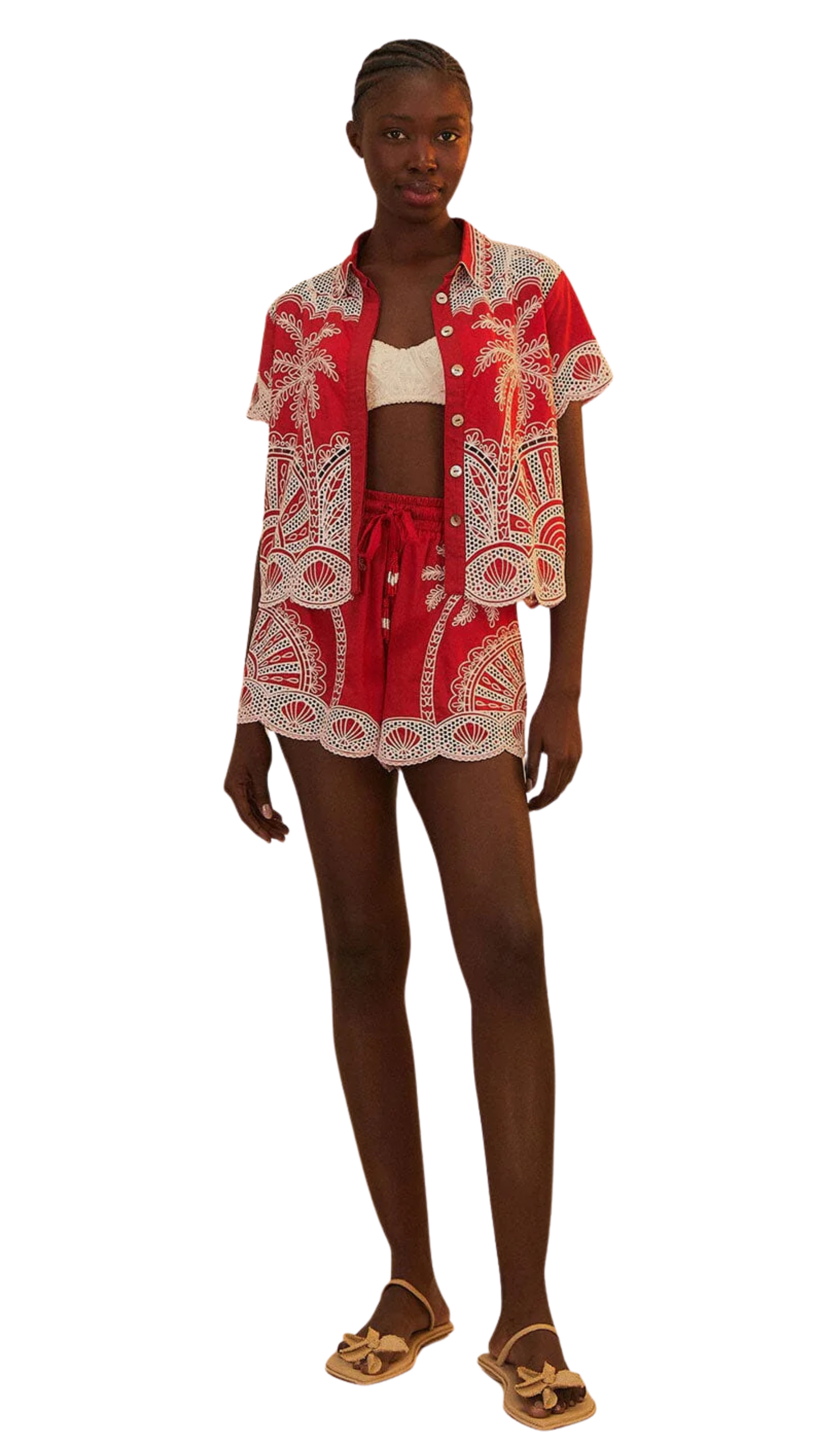 Red Palm Trees Embroidered Short Set