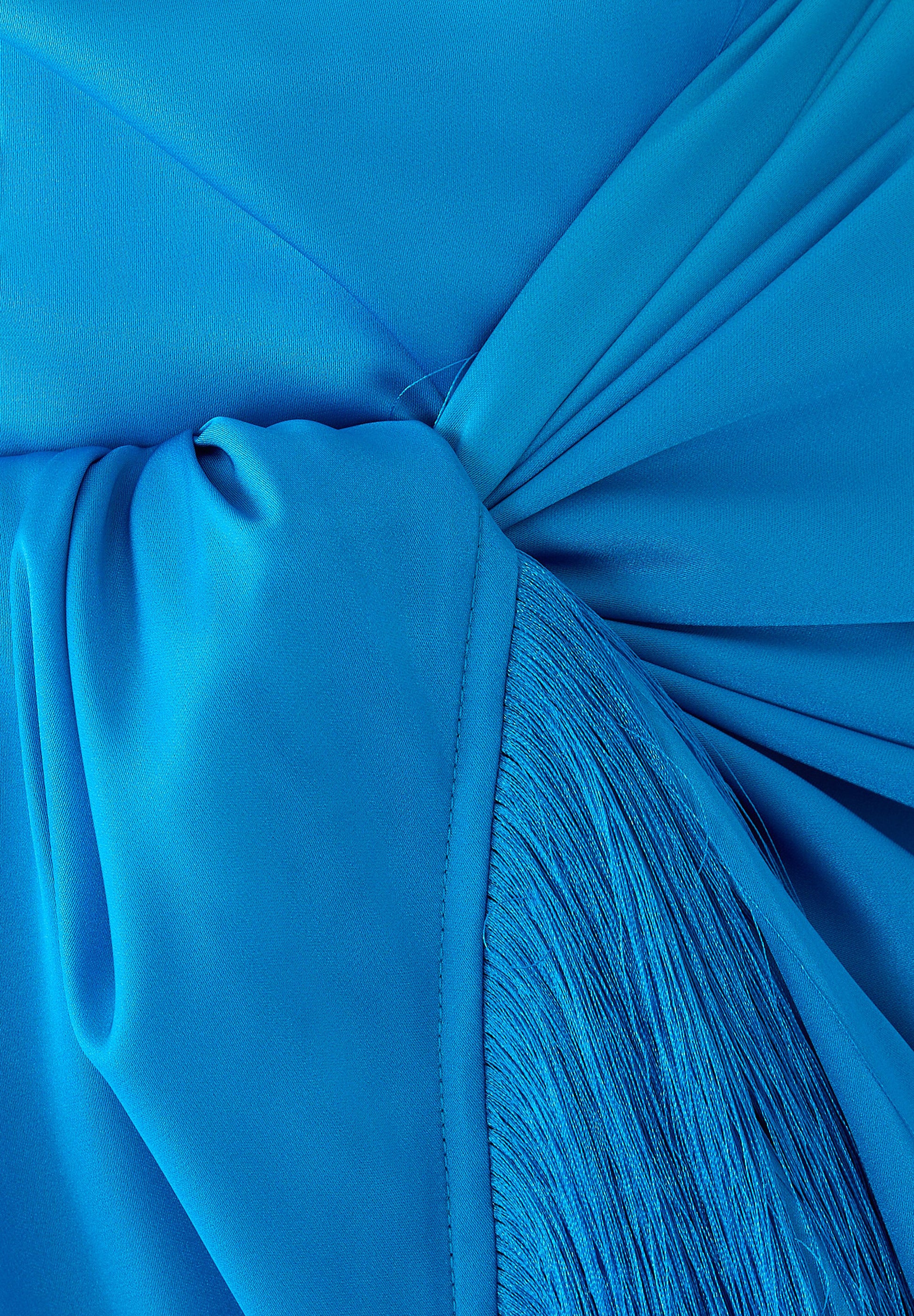 Introducing the "Reproche Dress" in Oceans – This midi dress features a square neckline, fringe details, and a front knot for a chic, modern look. With a front slit and zipper closure, it’s an elegant yet bold choice that transitions effortlessly from day to night with