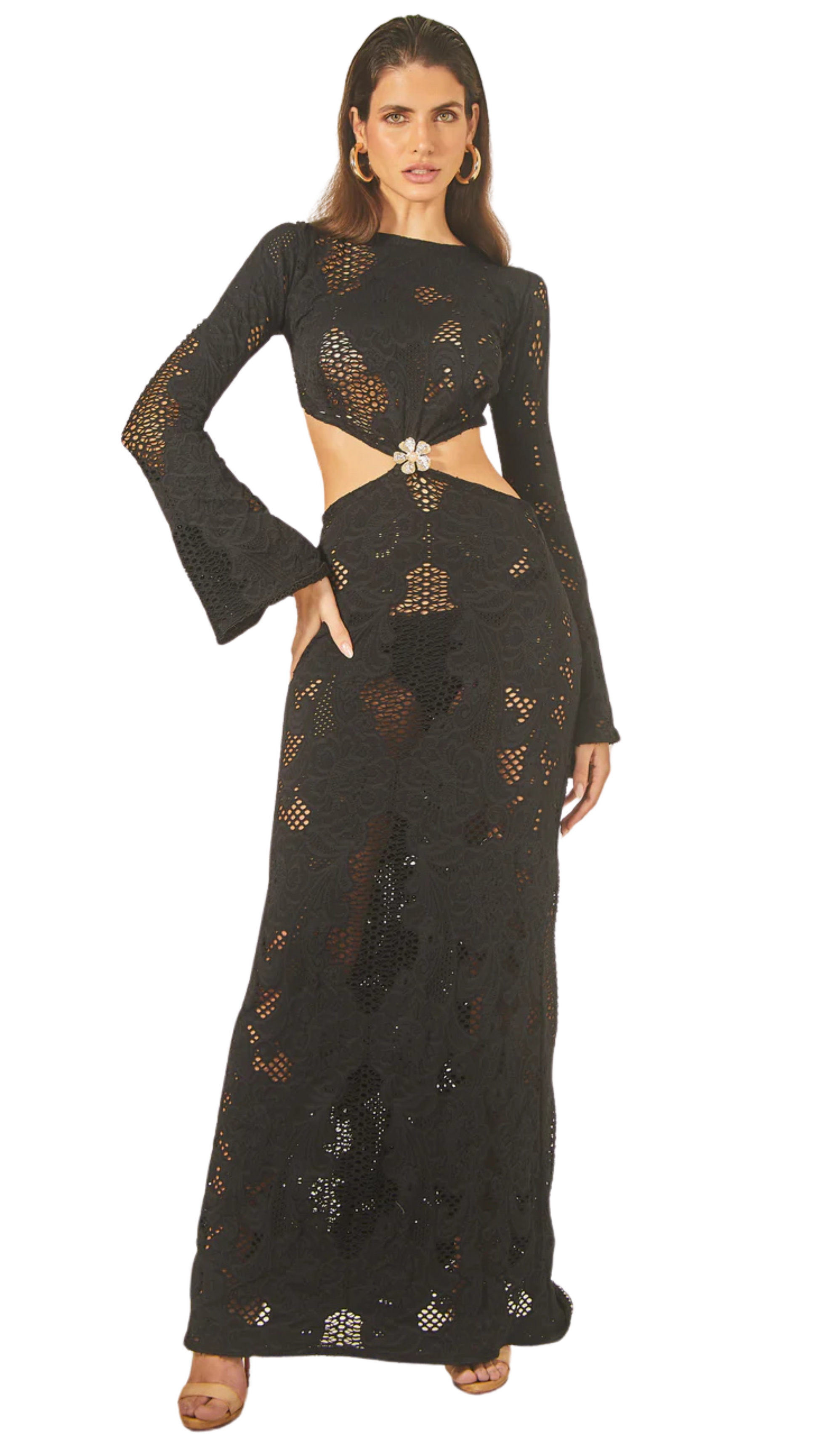 The Rimini Dress in Black is an elegant and sexy floor length dress, made with stretchy transparent lace fabric. It features a gold flower detail at the center of the waist to connect the top and skirt. There is a cutout at the waist with an open back and a tie closure. The Rimini dress has long bell sleeves and is transparent with a fringe along the hem.
